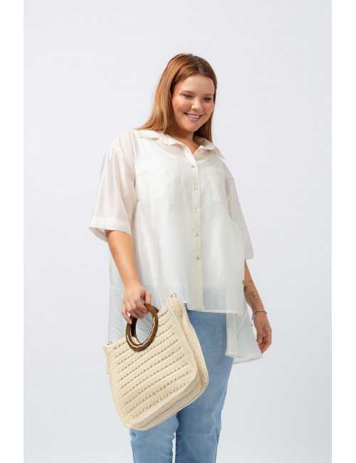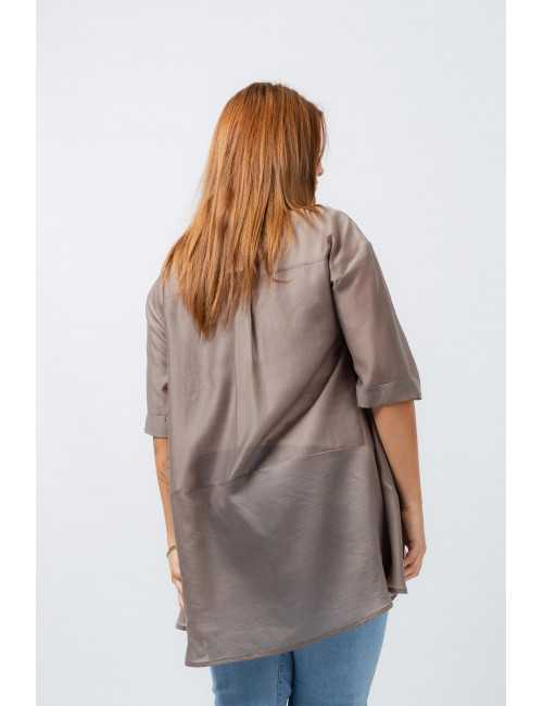 Plain fabric blouse, short sleeves with set-in cuffs, chest patch pockets. Side inserts, flared model. Back yoke with male stitch. Collection: Spring Summer Available in Plus Sizes Own design and manufacturing product. We are a clothing manufacturing brand with over 50 years of experience Model: Height 1.70m and is wearing size XL. Composition: 84% Lyocell 16% Polyester