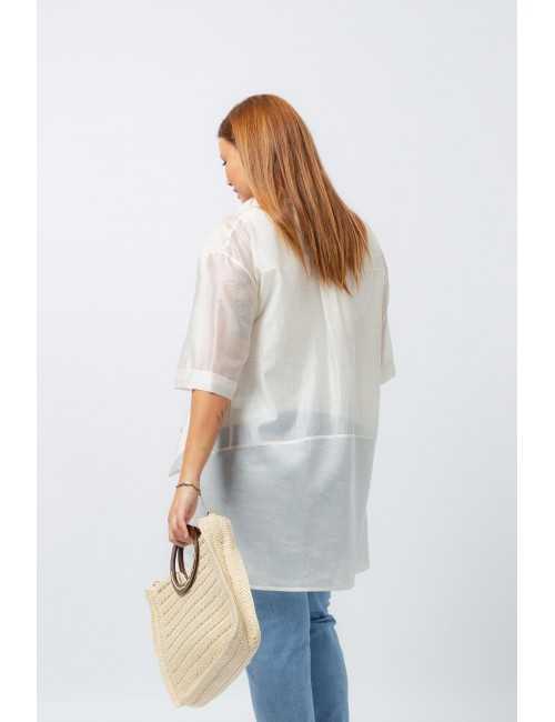 Plain fabric blouse, short sleeves with set-in cuffs, chest patch pockets. Side inserts, flared model. Back yoke with male stitch. Collection: Spring Summer Model 1: Height 1.80m and is wearing size 4XL Model 2: Height 1.70m and is wearing size XL