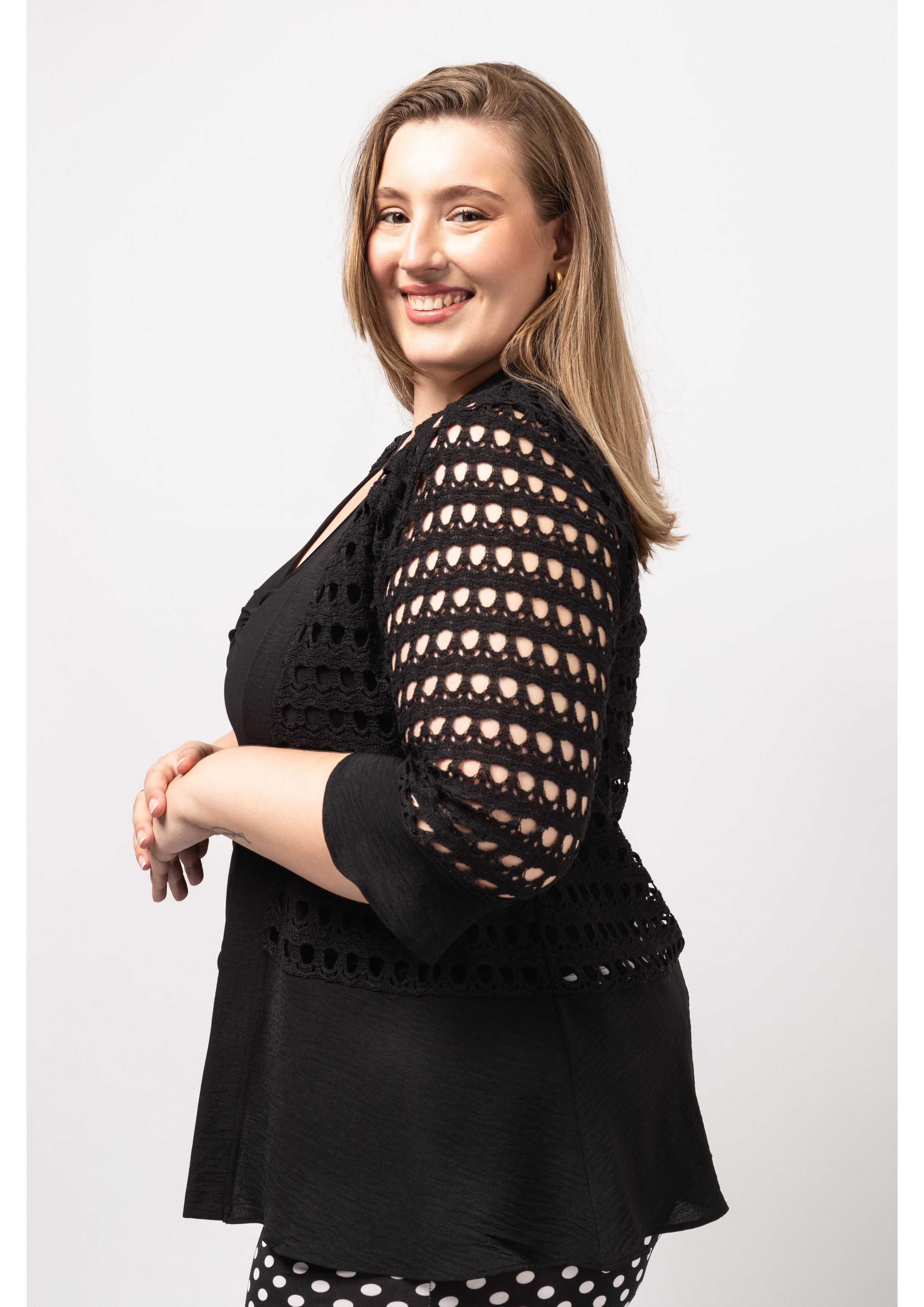 Lace jacket. 3/4 sleeves. Smooth fabric at the sleeve ruffle, at the base, and on the neck strap. Collection: Spring Summer Available in Plus Sizes Custom designed and manufactured product. We are a clothing manufacturing brand with over 50 years of experience Model: Height 1.80m wearing size 3XL. Composition: 100% Polyester | LACE 75% Polyester 25% Cotton