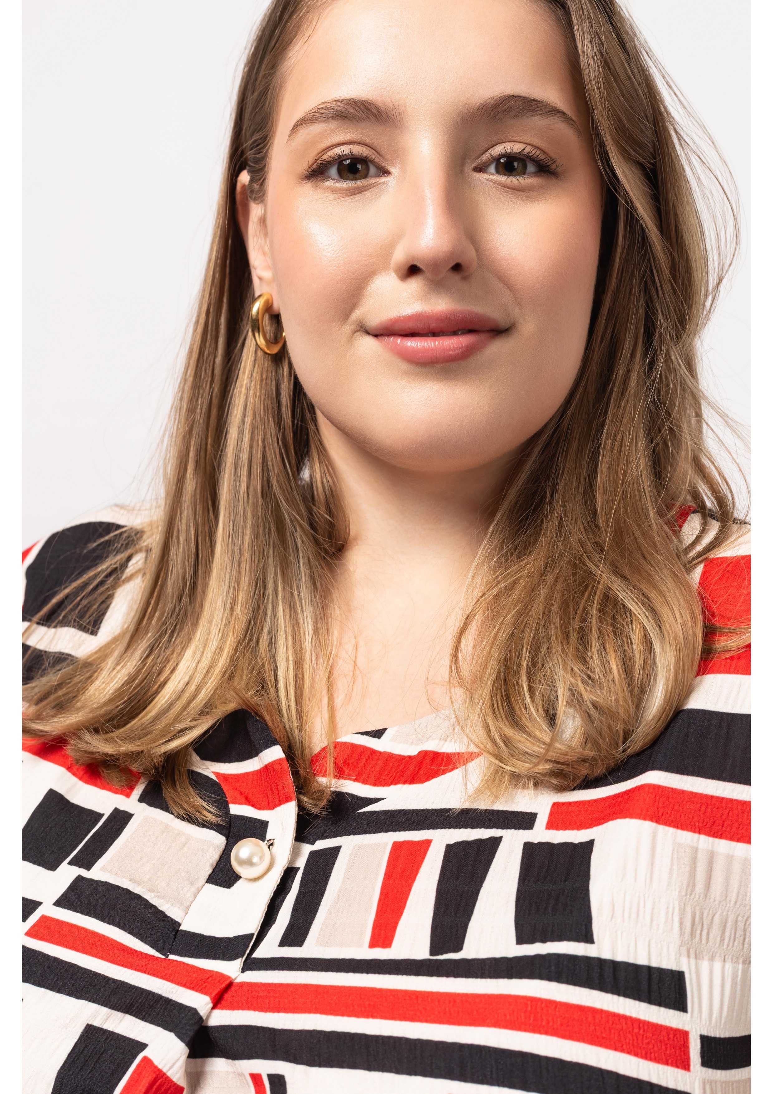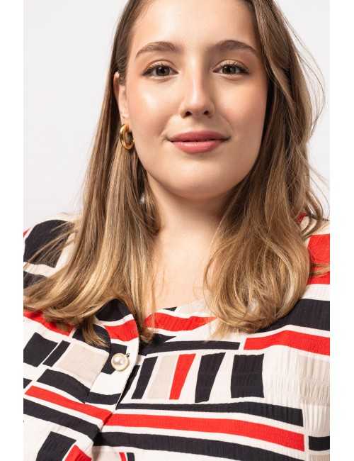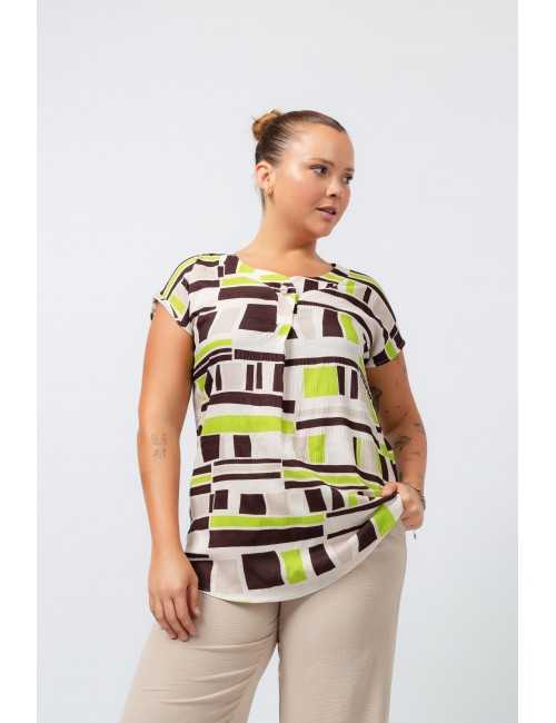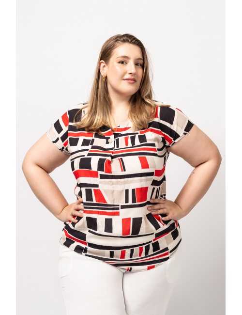 Tunic in printed fabric, wide shoulder, round neckline with button-up opening, fastens with a pearl. Collection: Spring Summer Available in Plus Sizes Own design and manufacturing. We are a clothing brand with over 50 years of experience Model: Height 1.80m and wearing size 4XL, in red. Model: Height 1.70m and wearing size XL, in green. Composition: 99% Polyester 1% Elastane