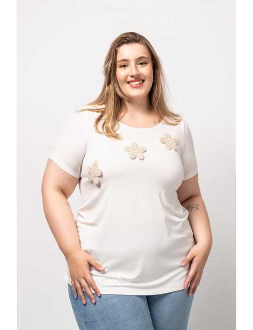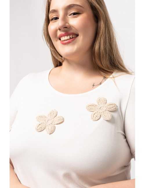 Plain knit tunic, short sleeves, round neckline. A-line style. 3 flowers in lace applied on the front. Collection: Spring Summer Available in Plus Sizes Own design and manufacturing product. We are a clothing brand with over 50 years of experience Model: Height 1.800m and wearing size 4XL. Composition: 94% Viscose 6% Elastane