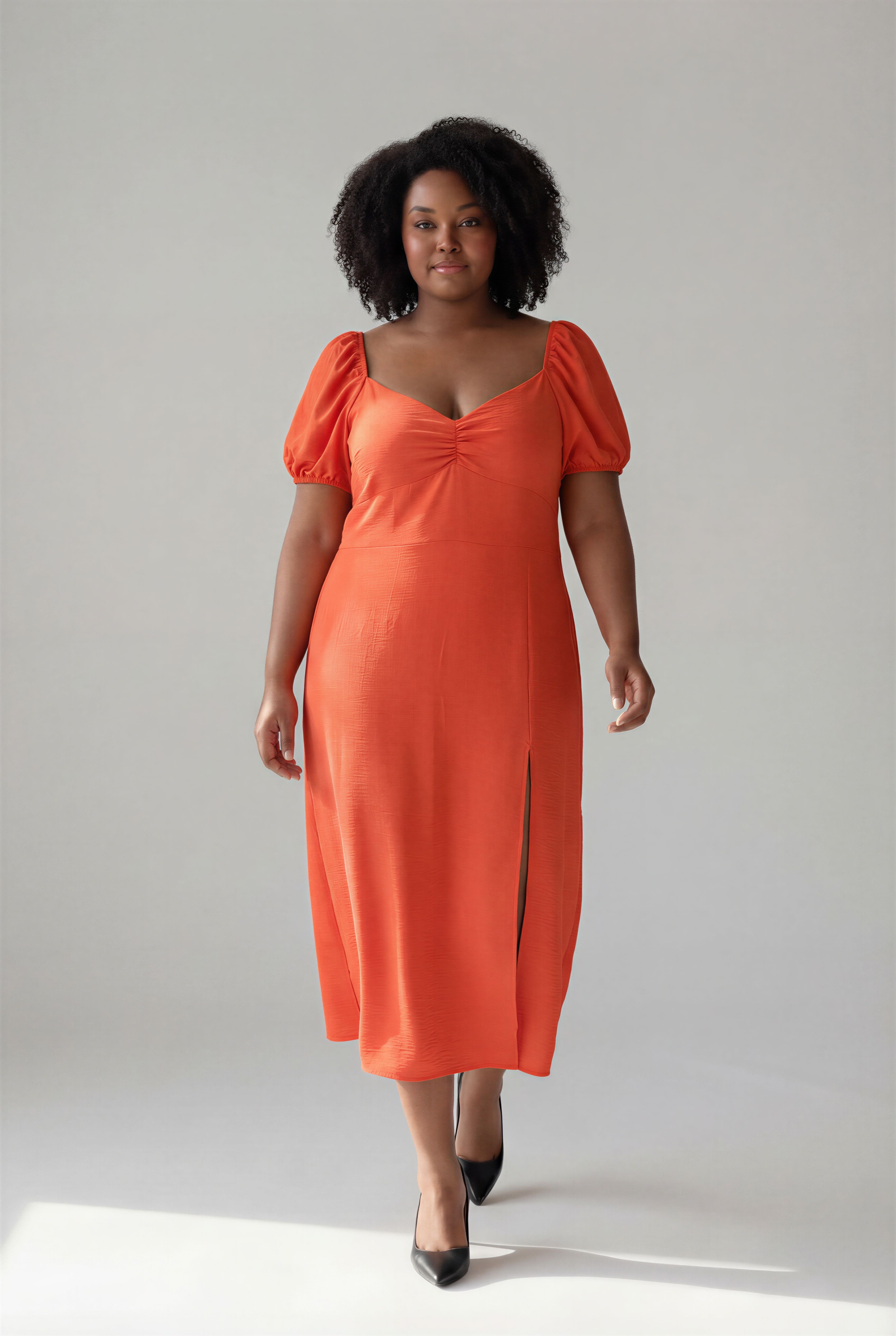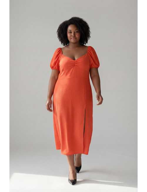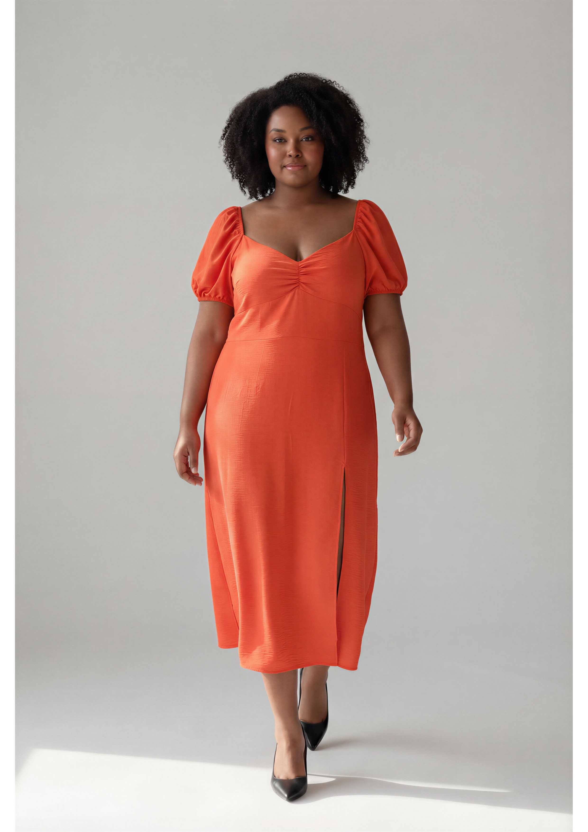 Dress in solid fabric, ruched neckline at the front back with opening. balloon sleeves, slit on the front side. Collection: Spring Summer Model: Height 1.70m and is wearing size 2XL, in orange and black. Model: Height 1.80m and is wearing size 5XL, in blue.