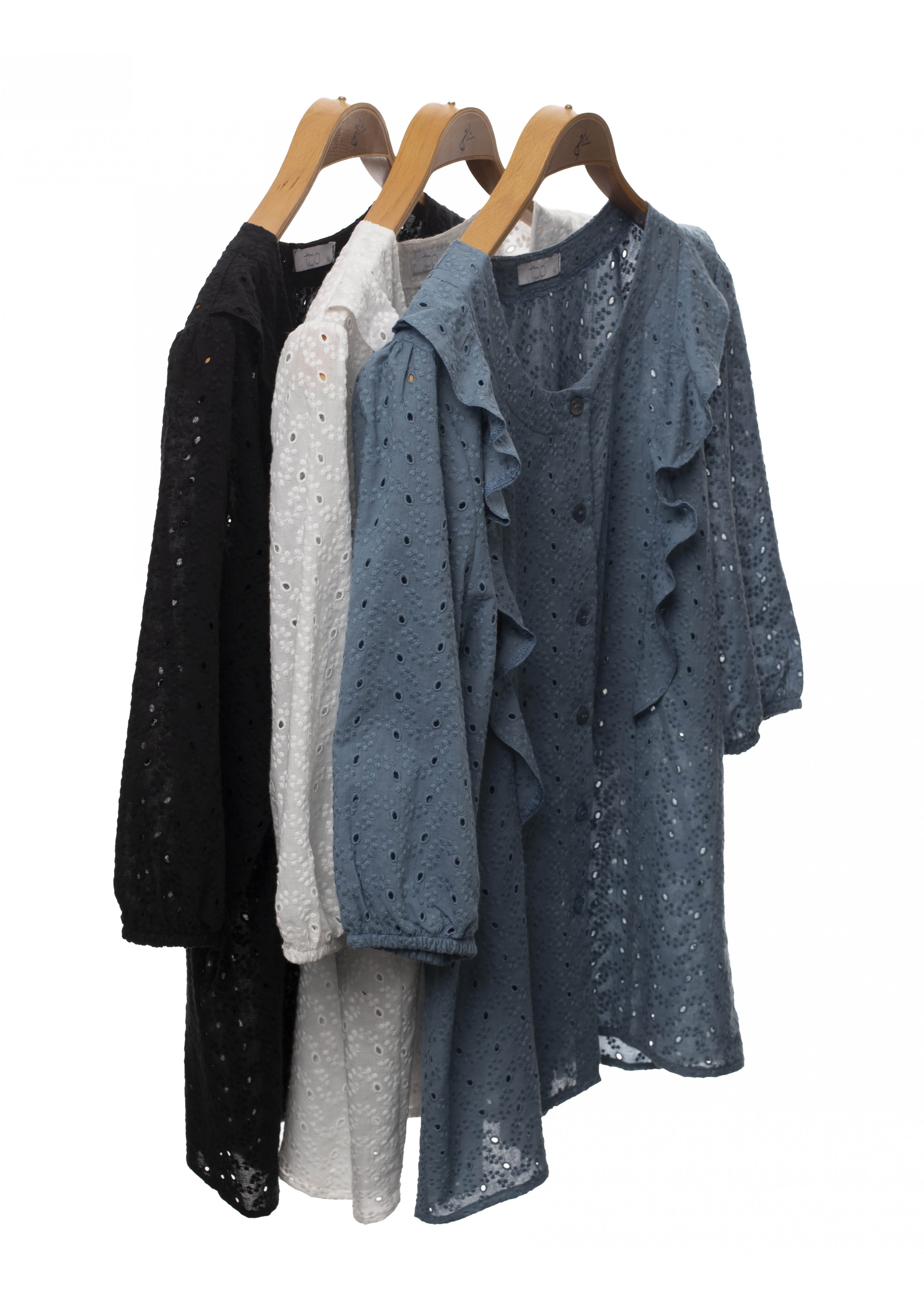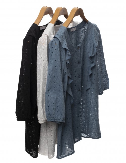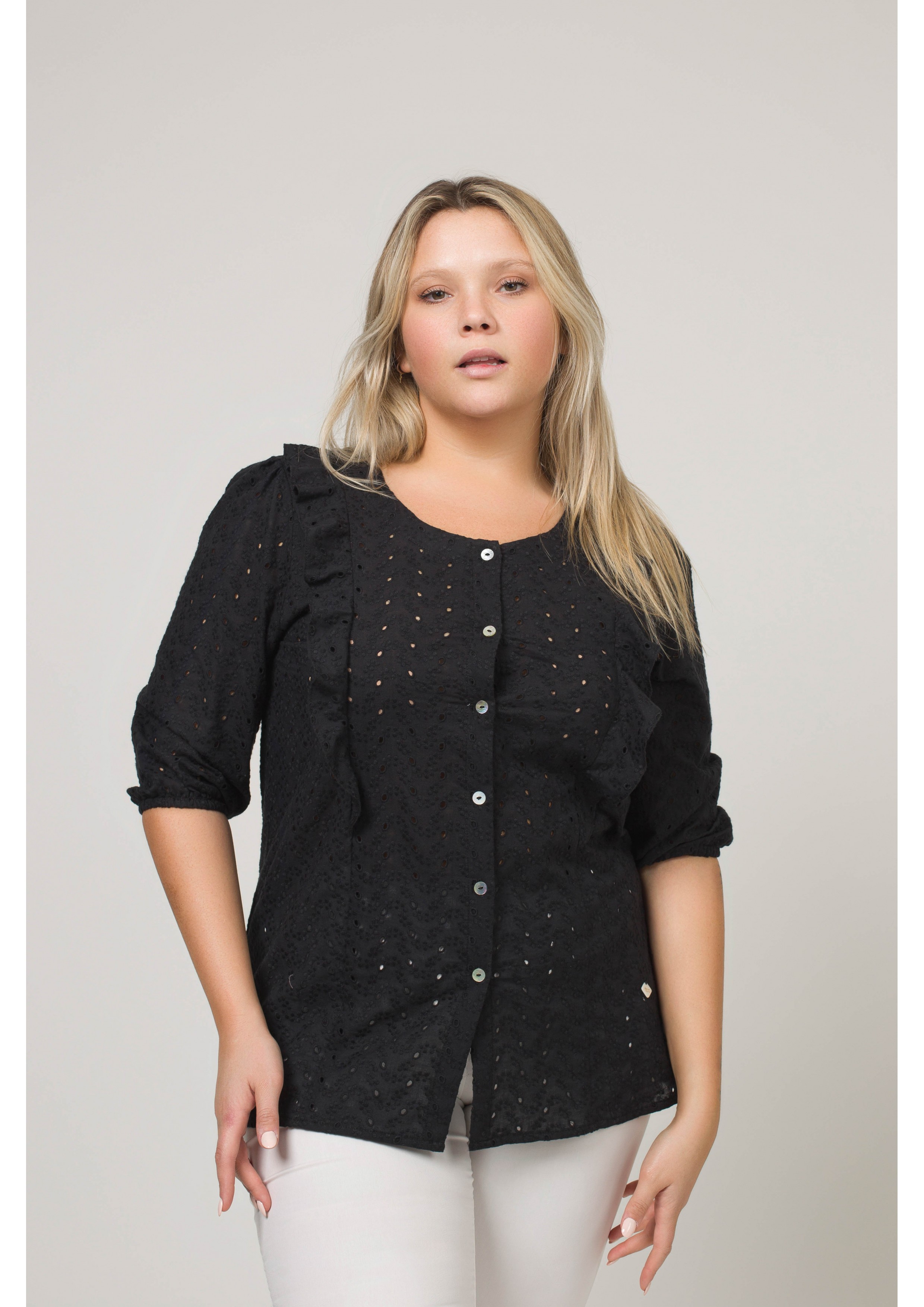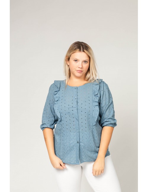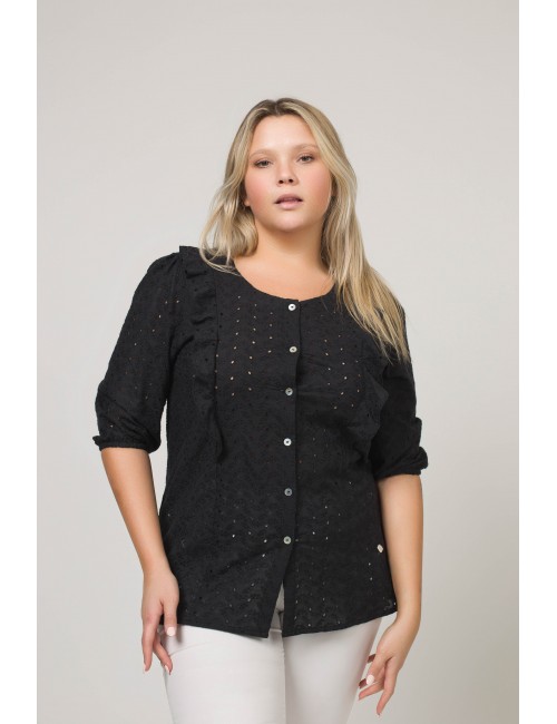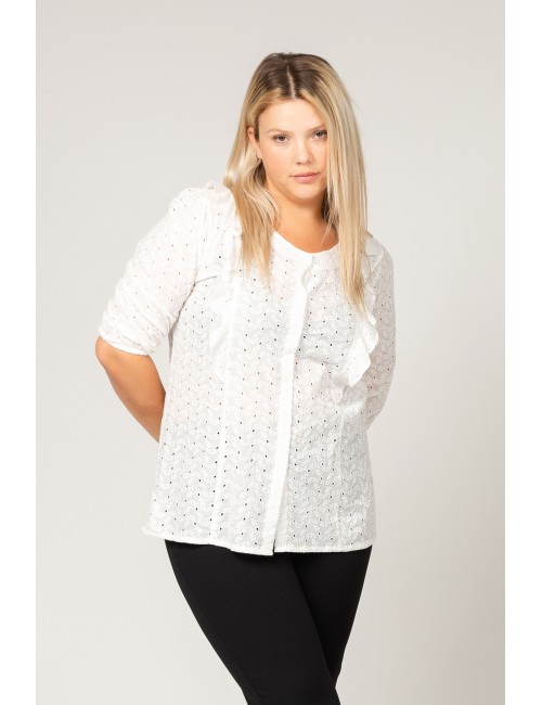 Blouse in fabric, English embroidery type, 3/4 sleeves with elastic. Round neckline, ruffle applied on the front. Collection: Spring Summer Available in Plus Sizes Own design and manufacturing product. We are a clothing manufacturing brand with over 50 years of experience. Model: Height 1.70m and is wearing size 2XL. Composition: 100% Cotton