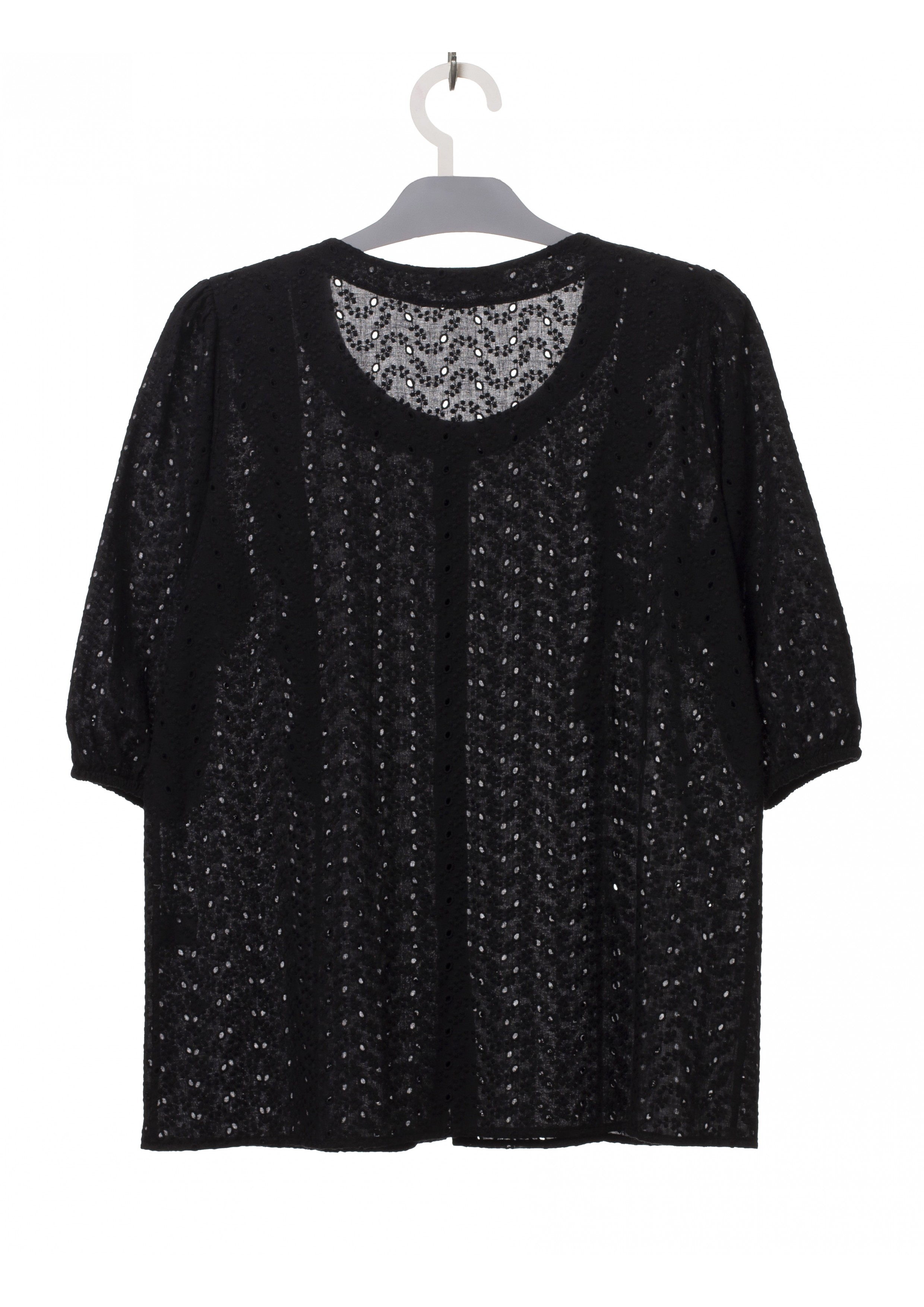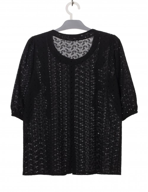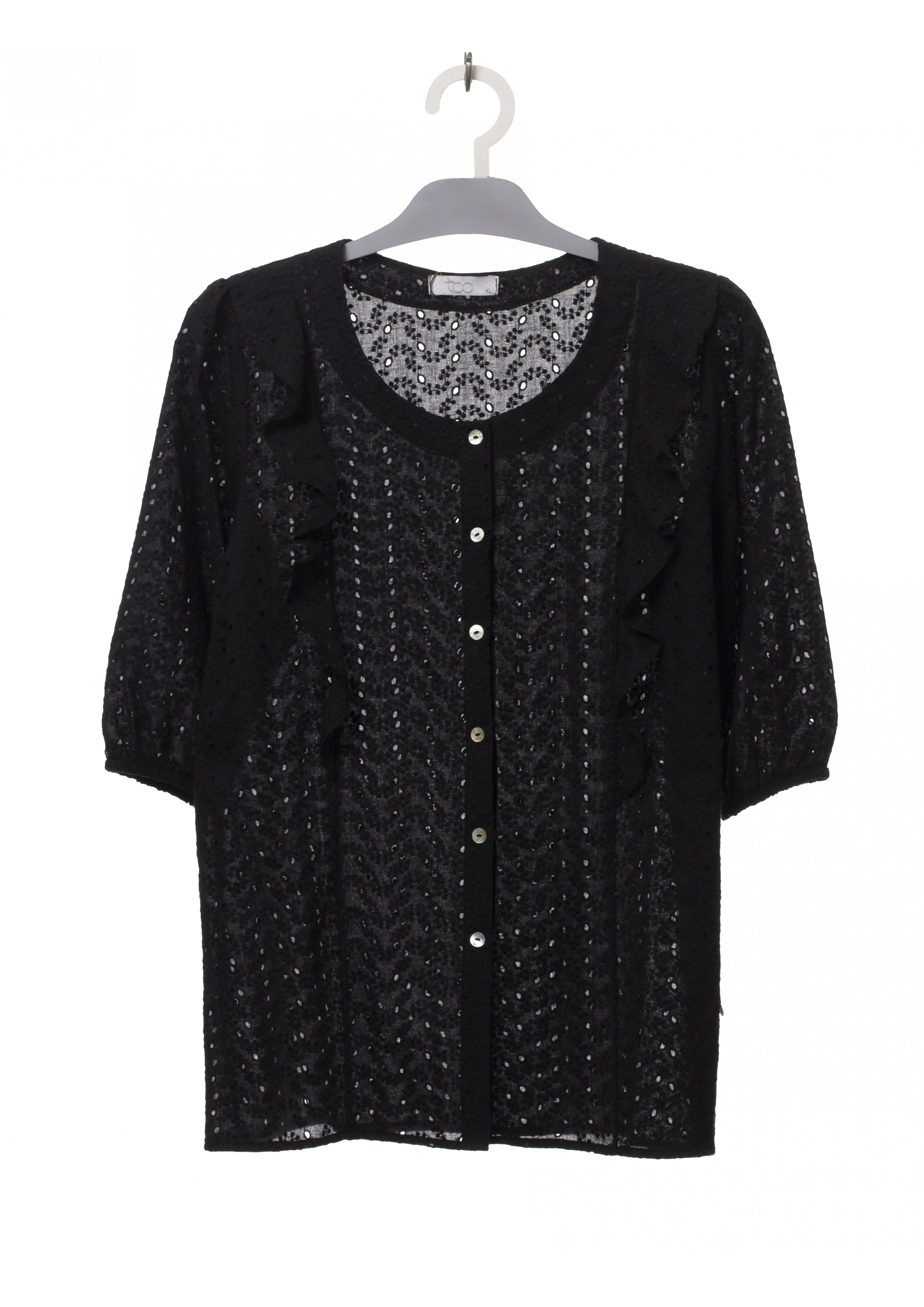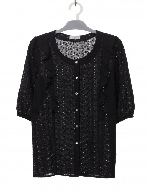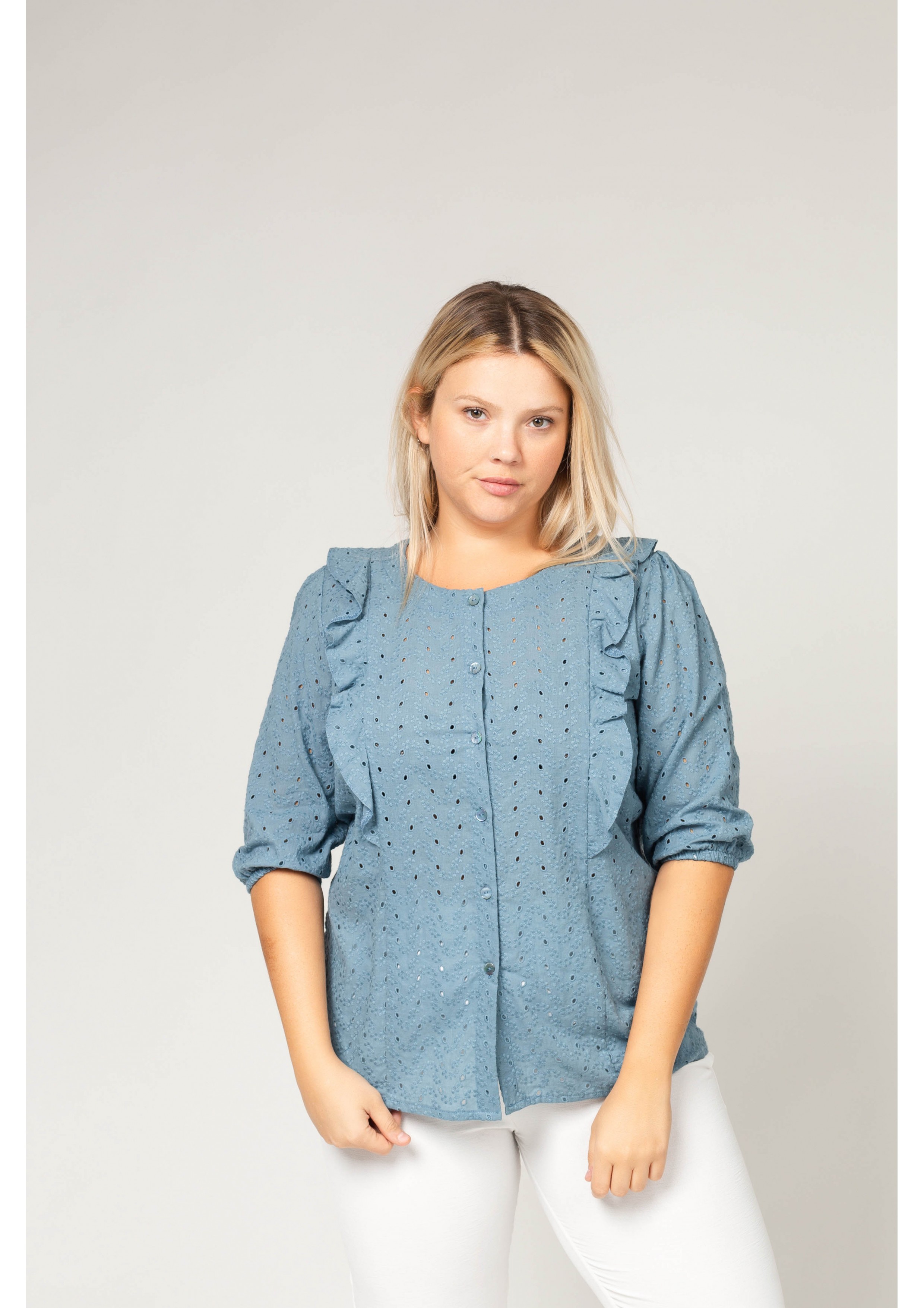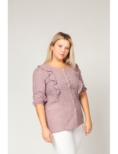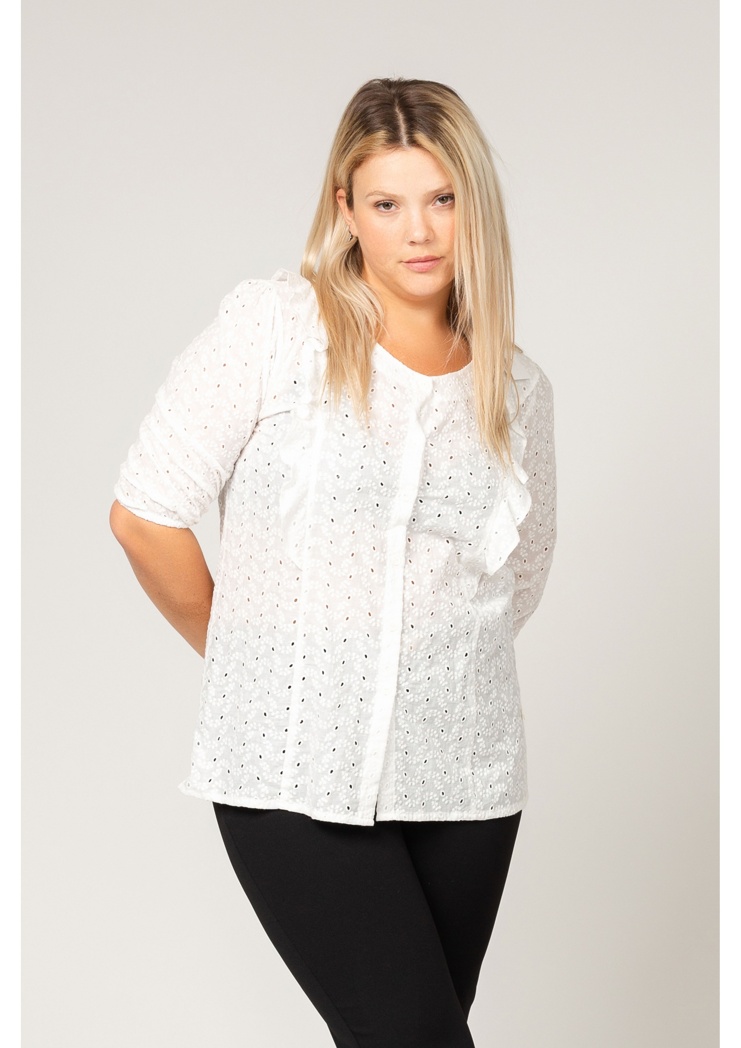 Blouse in fabric, English embroidery type, 3/4 sleeves with elastic. Round neckline, ruffle applied on the front. Collection: Spring Summer Model: Height 1.70m and is wearing size 2XL