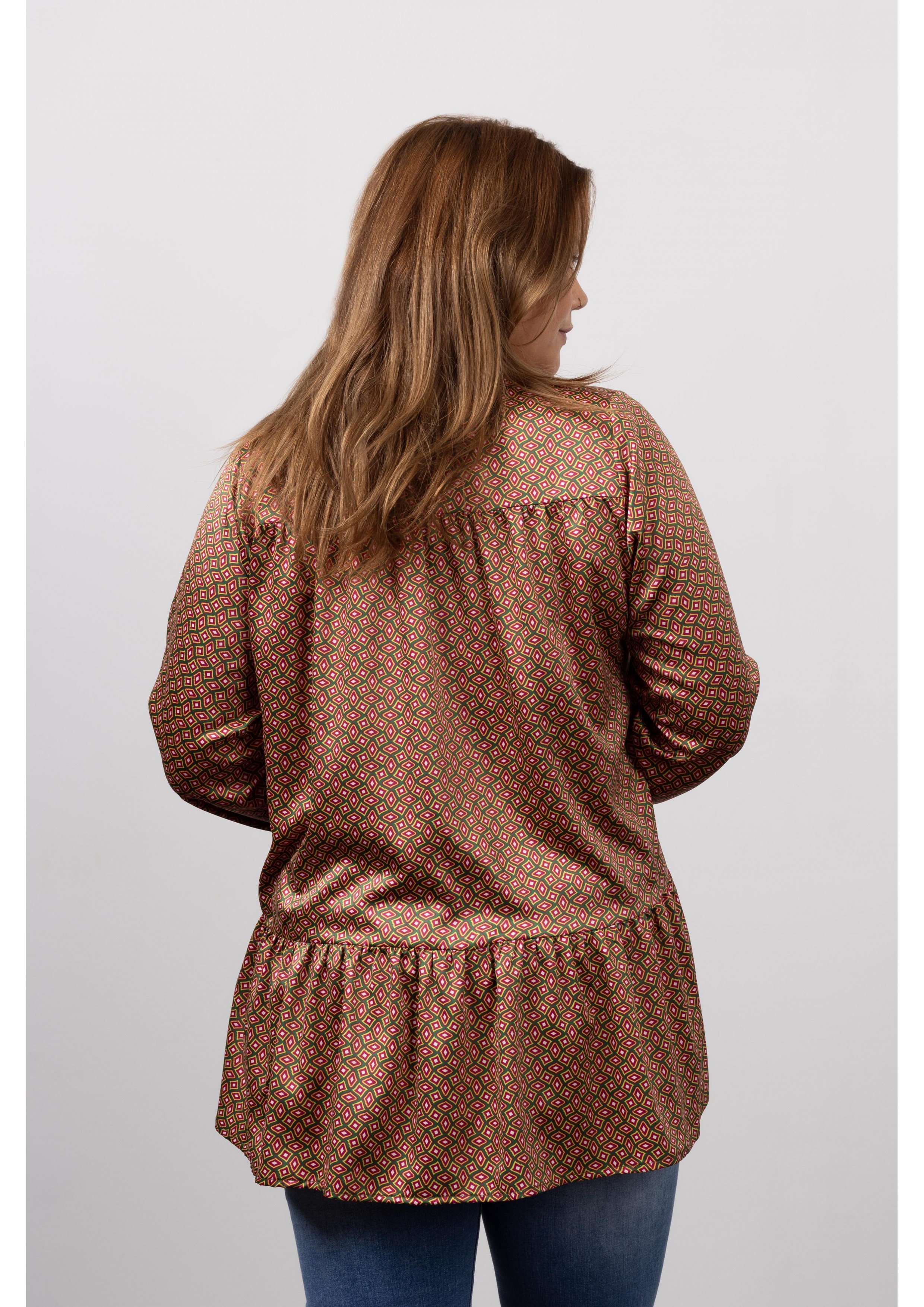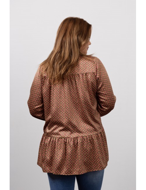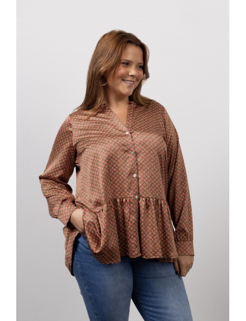 Blouse with a priest neckline and ruffle at the bottom Collection: Spring Summer Available in Plus Sizes Own design and manufacturing product. We are a clothing manufacturing brand with over 50 years of experience. Composition: 96% Polyester 4% Elastane
