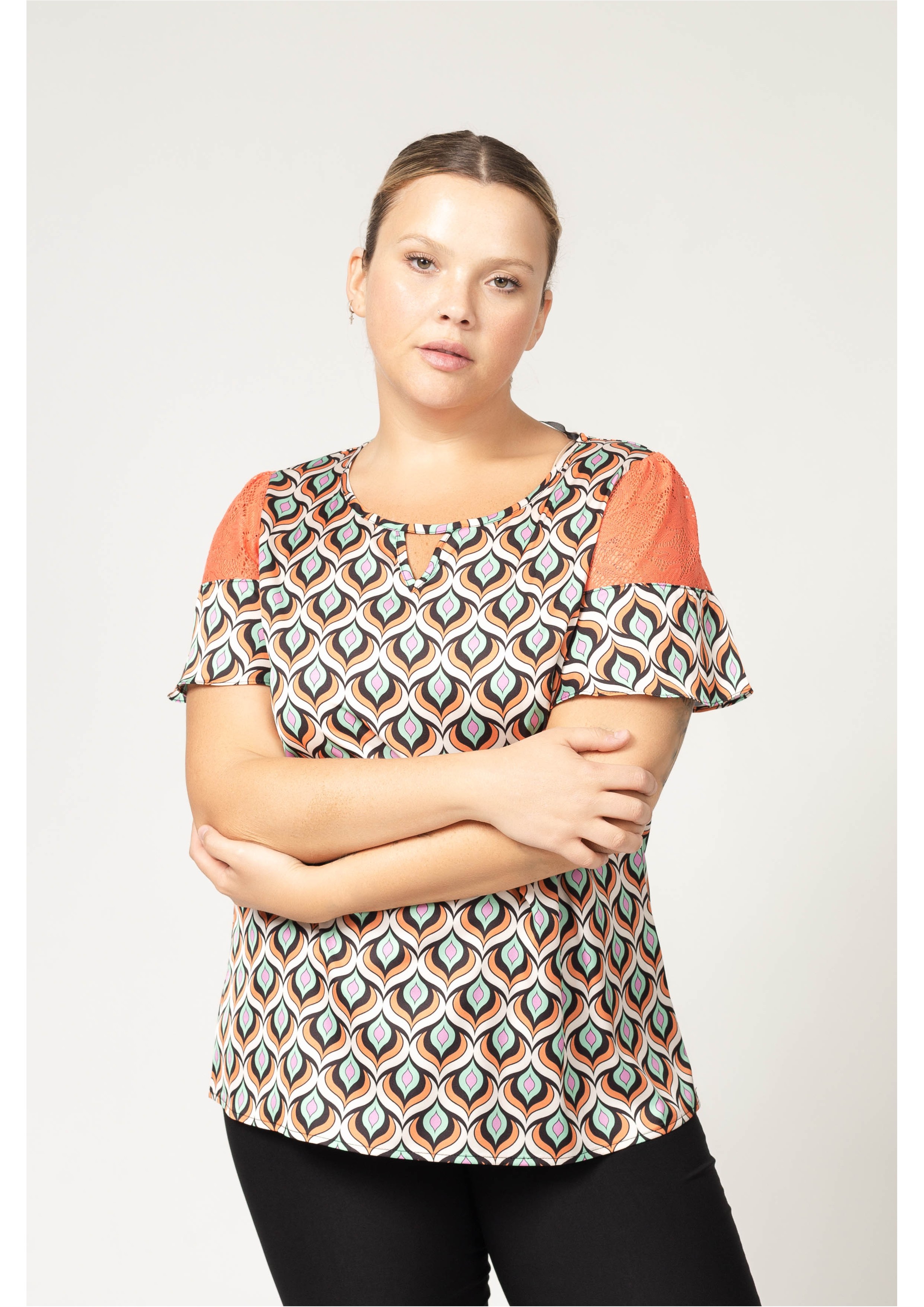 Blouse in fine fabric, short sleeves with lace and ruffle finish. Round neckline with a closed tear in the front. Collection: Spring Summer Available in Plus Sizes. Product of our own design and manufacturing. We are a clothing manufacturing brand with over 50 years of experience. Model: Height 1.70m and wearing size 2XL. Composition: 97% Polyester 3%Elastane / 100% Polyester