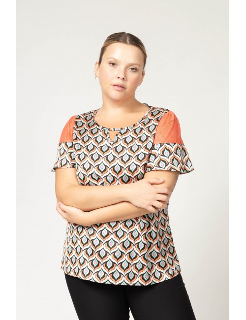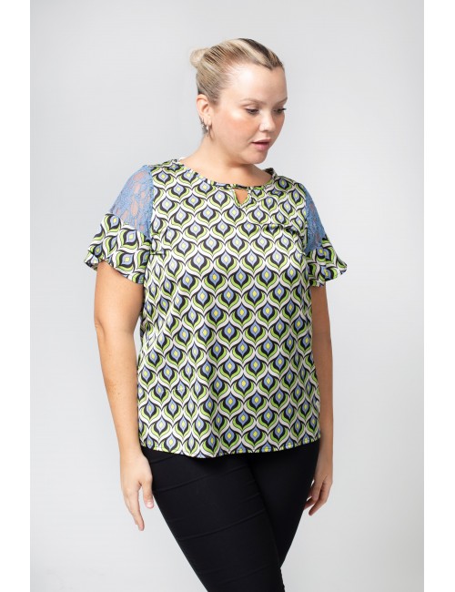 Blouse in fine fabric, short sleeves with lace and ruffle finish. Round neckline with a closed tear in the front. Collection: Spring Summer Model: Height 1.70m and wearing size 2XL.