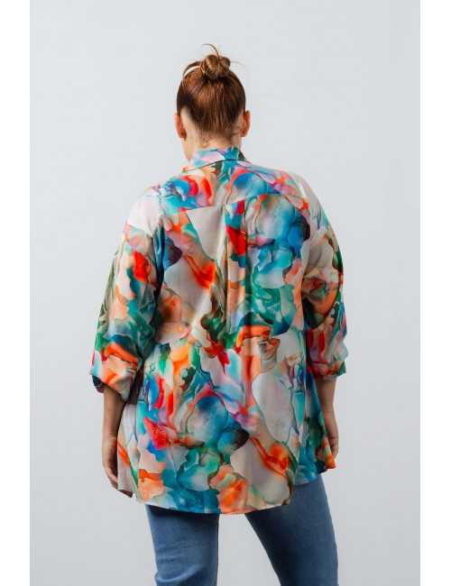 Printed fabric blouse, 3/4 sleeve with a tab, front opening with a placket. Slightly A-line model. Collection: Spring Summer Available in Plus Sizes. Product designed and manufactured in-house. We are a clothing manufacturing brand with over 50 years of experience. Model: Height 1.70m and wearing size XL. Composition: 100% Viscose