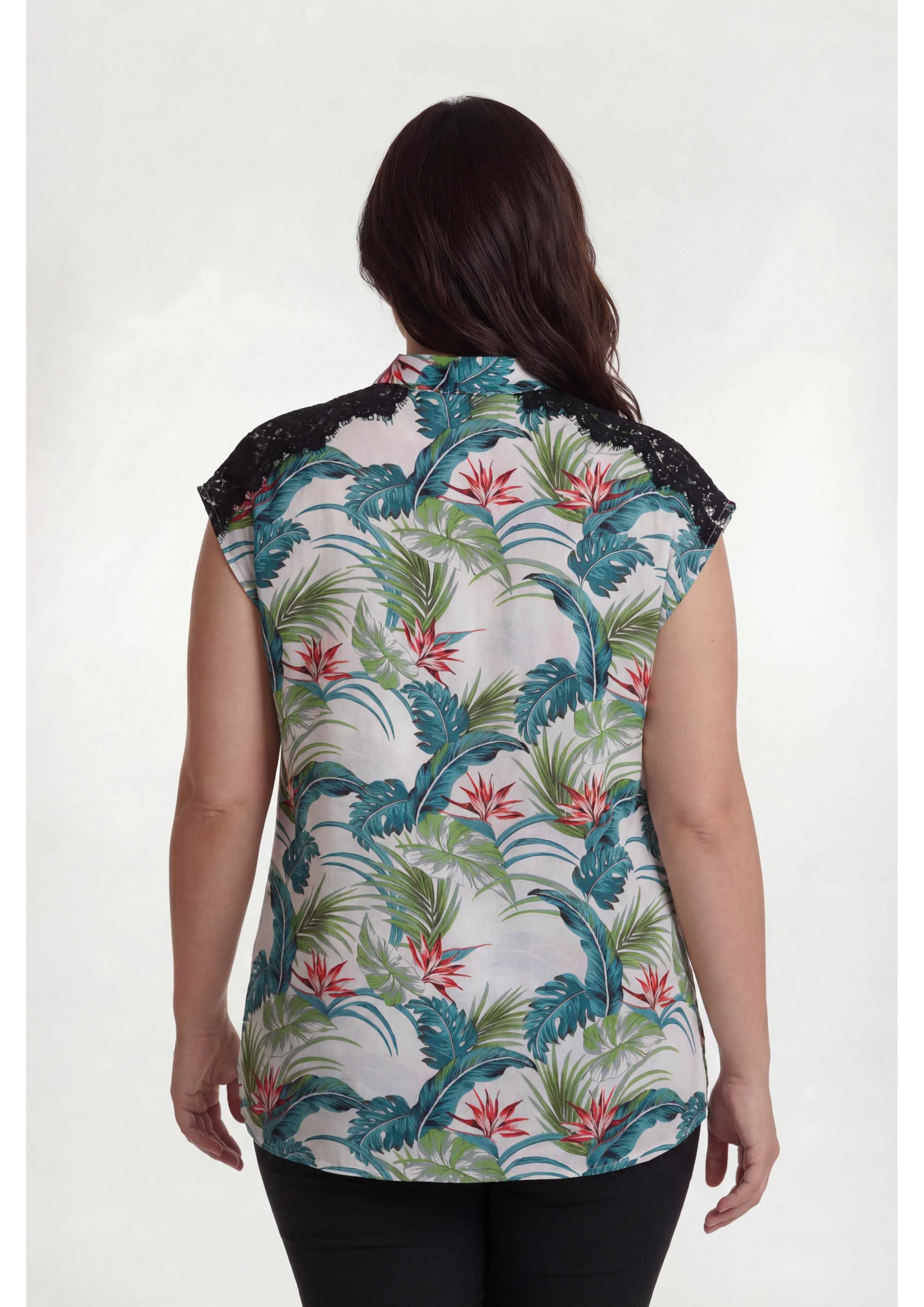 Printed fabric blouse, cap sleeve. Side slits. Lace overlay on the shoulders. Collection: Spring Summer Available in Plus Sizes Product design and manufacturing by our own. We are a clothing manufacturing brand with over 50 years of experience Model: Height 1.70m and wearing size XL. Composition: 90% Viscose 10% Elastane