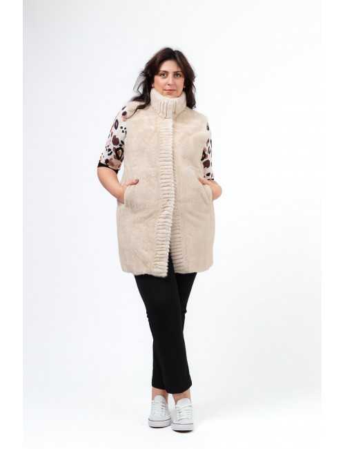 Fur vest with pockets and interior belt for waist adjustment. Closes with snaps.