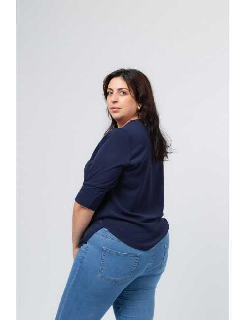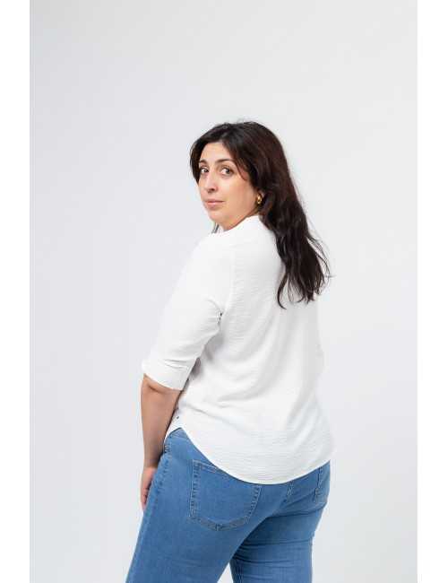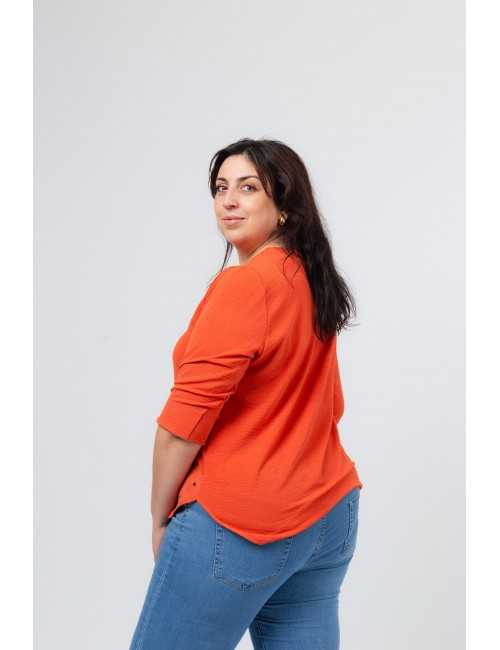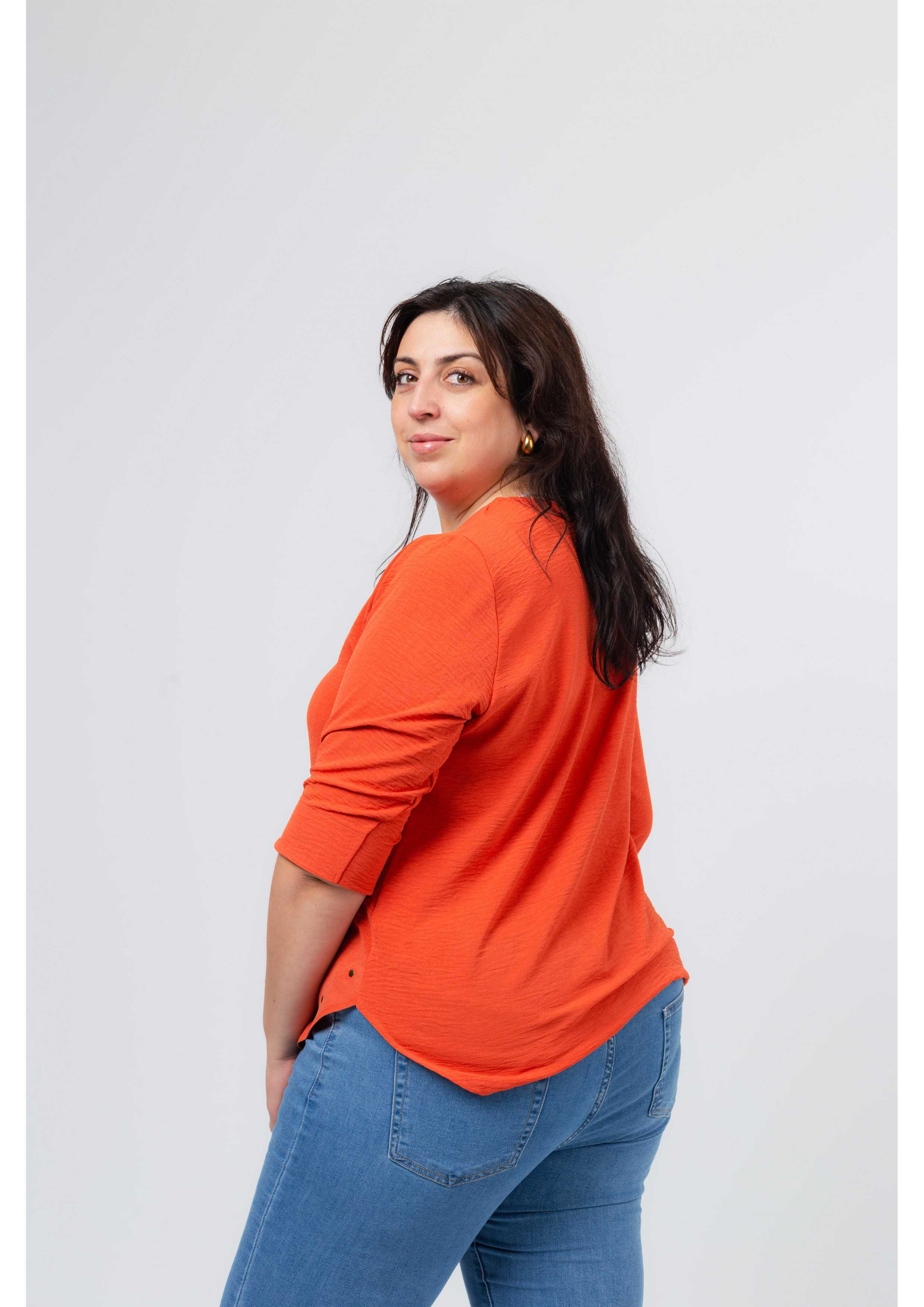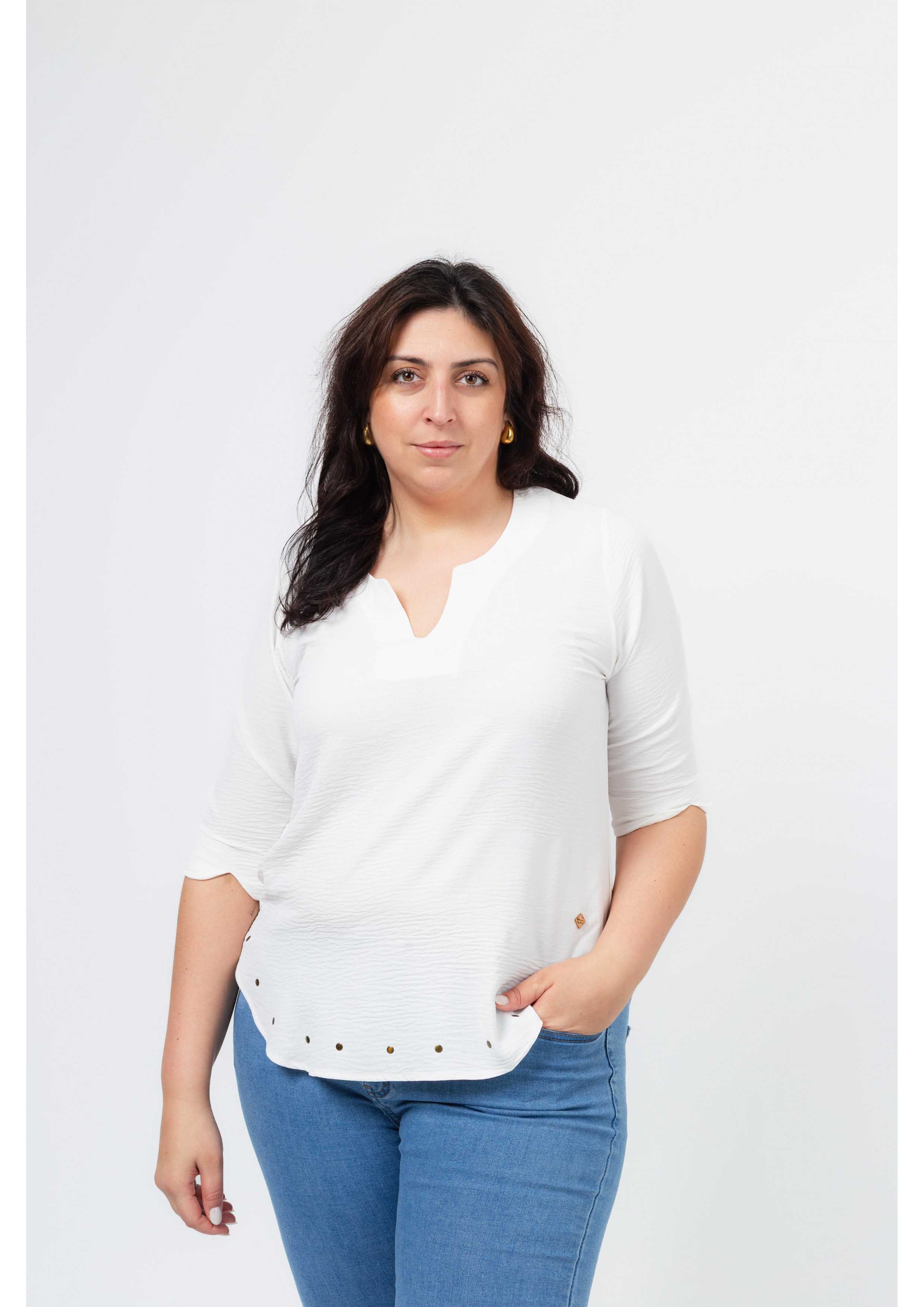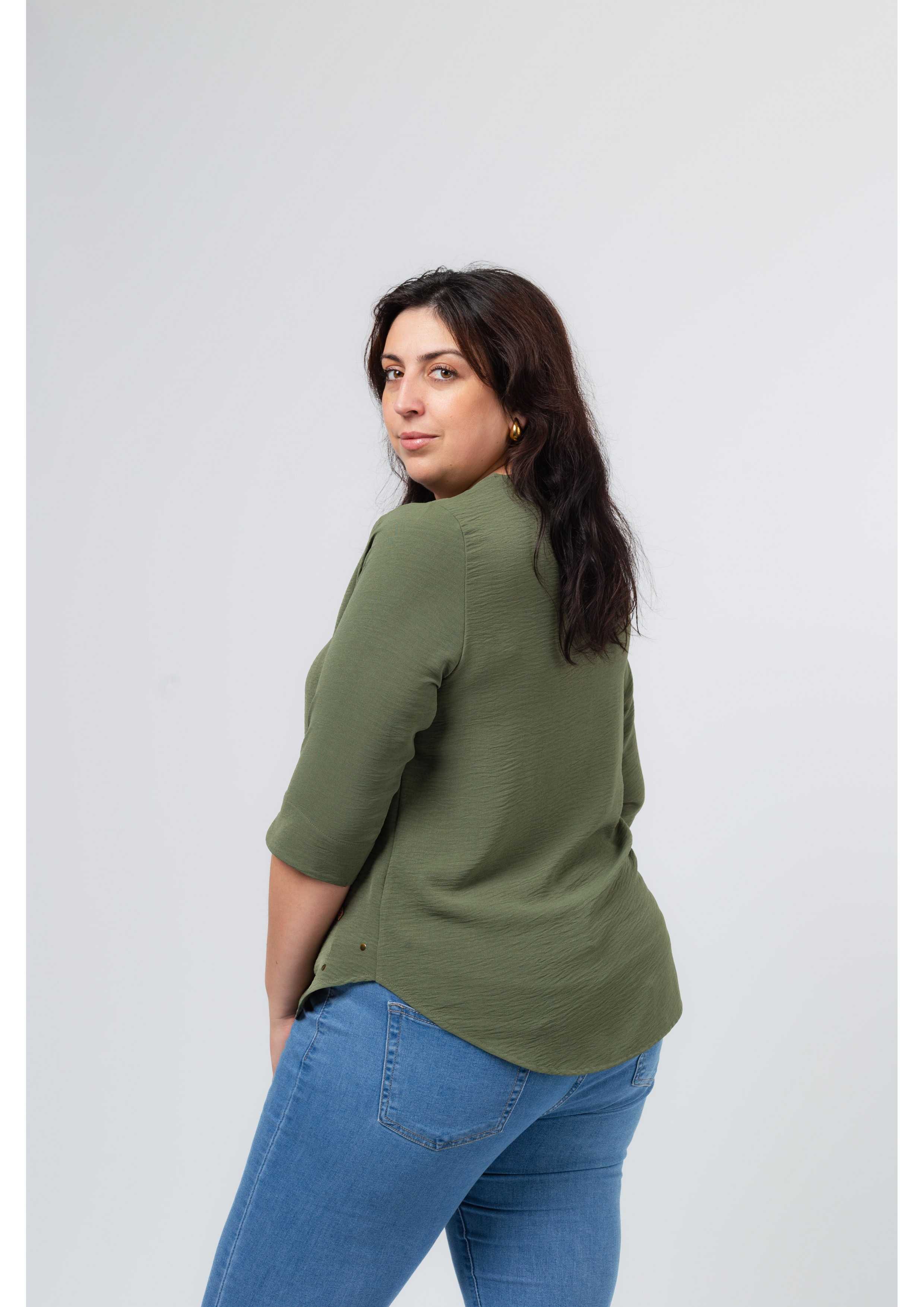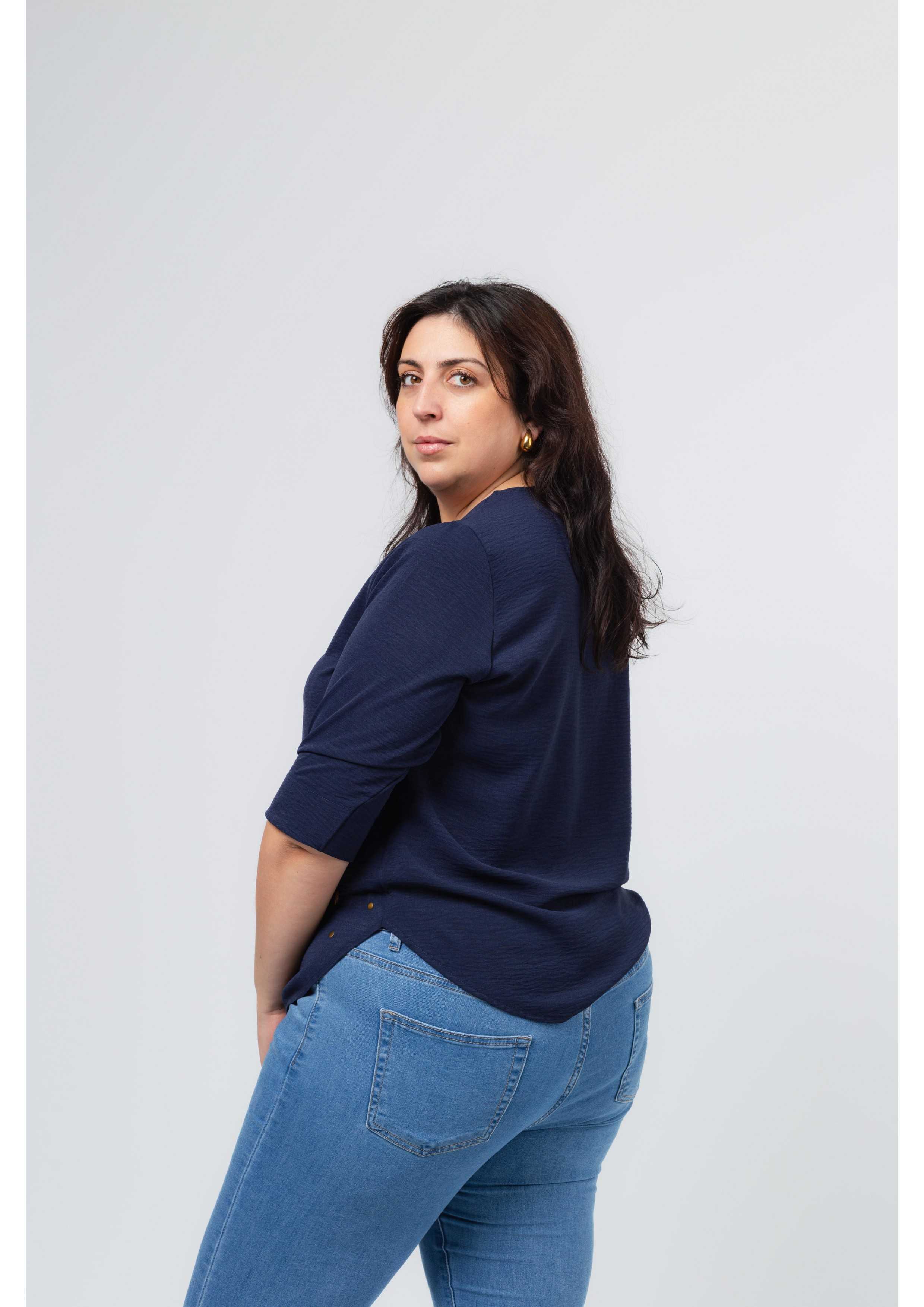 Plain fabric tunic, 3/4 sleeves with cuff and side slit. Round neckline with keyhole opening. Rounded hem with stud detailing on the front. Model: Height 1.82m and wearing size 3XL.