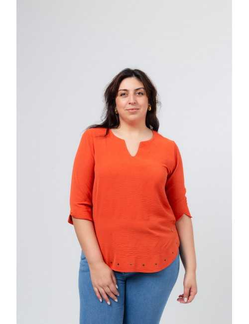 Plain fabric tunic, 3/4 sleeves with cuff and side slit. Round neckline with keyhole opening. Rounded hem with stud detailing on the front.