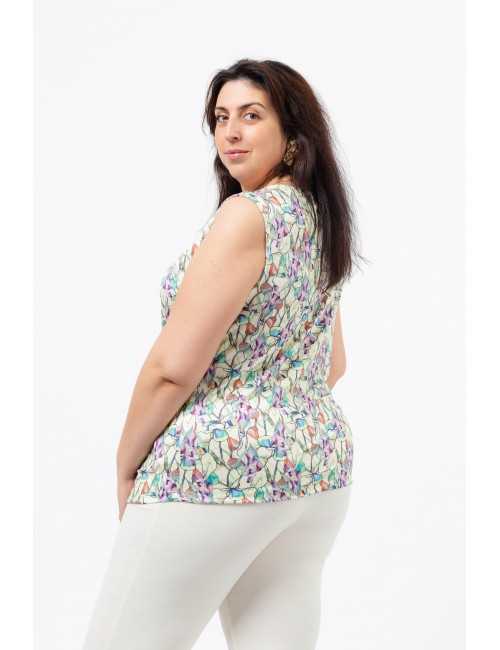 Printed knit top, green tones, draped neckline, rounded hem. Available in Plus Sizes Product of our own design and manufacture. We are a clothing manufacturing brand with over 50 years of experience Model: Height 1.82m and wearing size 3XL.