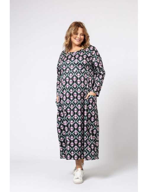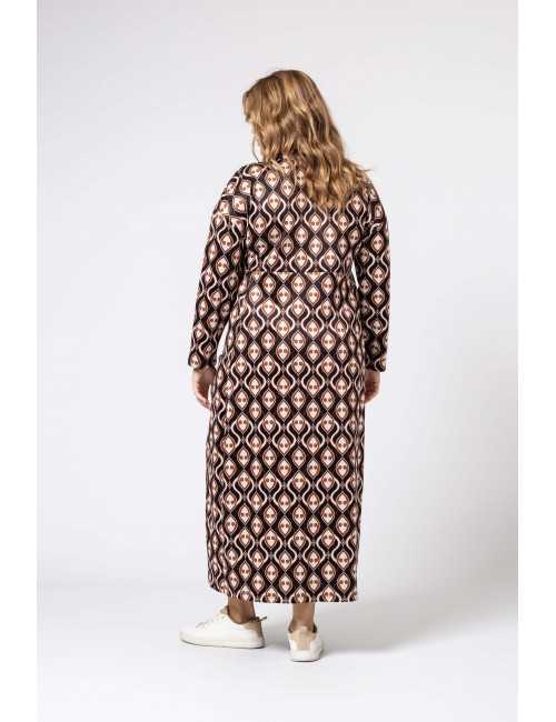 Printed knit dress, long sleeves with pockets and cinched at the waist Collection: Autumn Winter Available in Plus Sizes Own design and manufacturing product. We are a clothing manufacturing brand with over 50 years of experience Model: Height 1.70m and is wearing size 2XL. Composition: 95% Polyester 5% Elastane