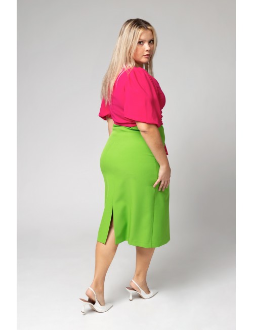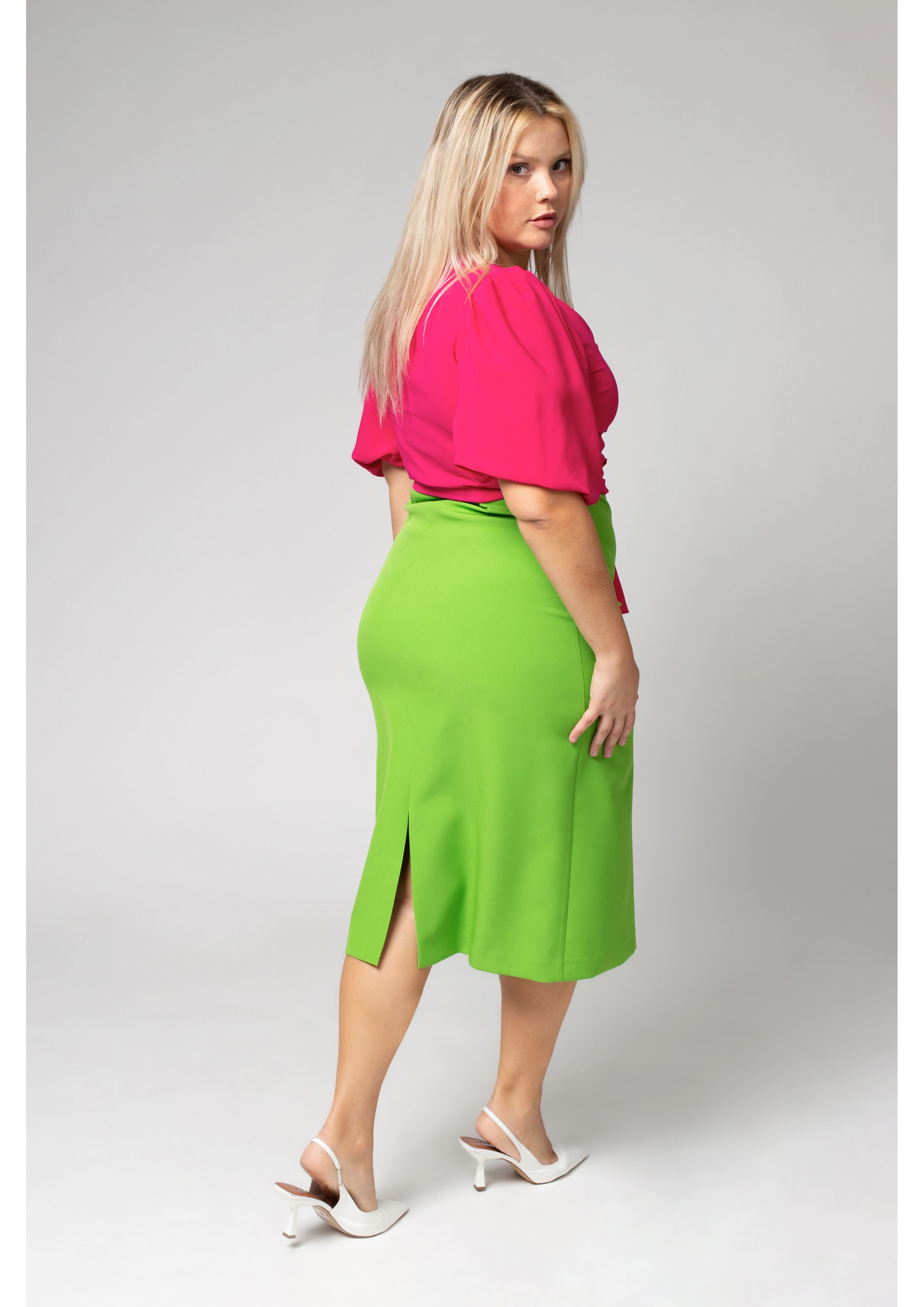 Solid fabric dress, 2 colors, waist cut, V-neck, 3/4 balloon sleeves. Collection: Spring Summer Available in Plus Sizes Designed and manufactured by us. We are a clothing brand with over 50 years of experience. Model: Height 1.70m wearing size 2XL. Composition: Body and Lining: 100% Polyester / Skirt: 90% Polyester 10% Elastane