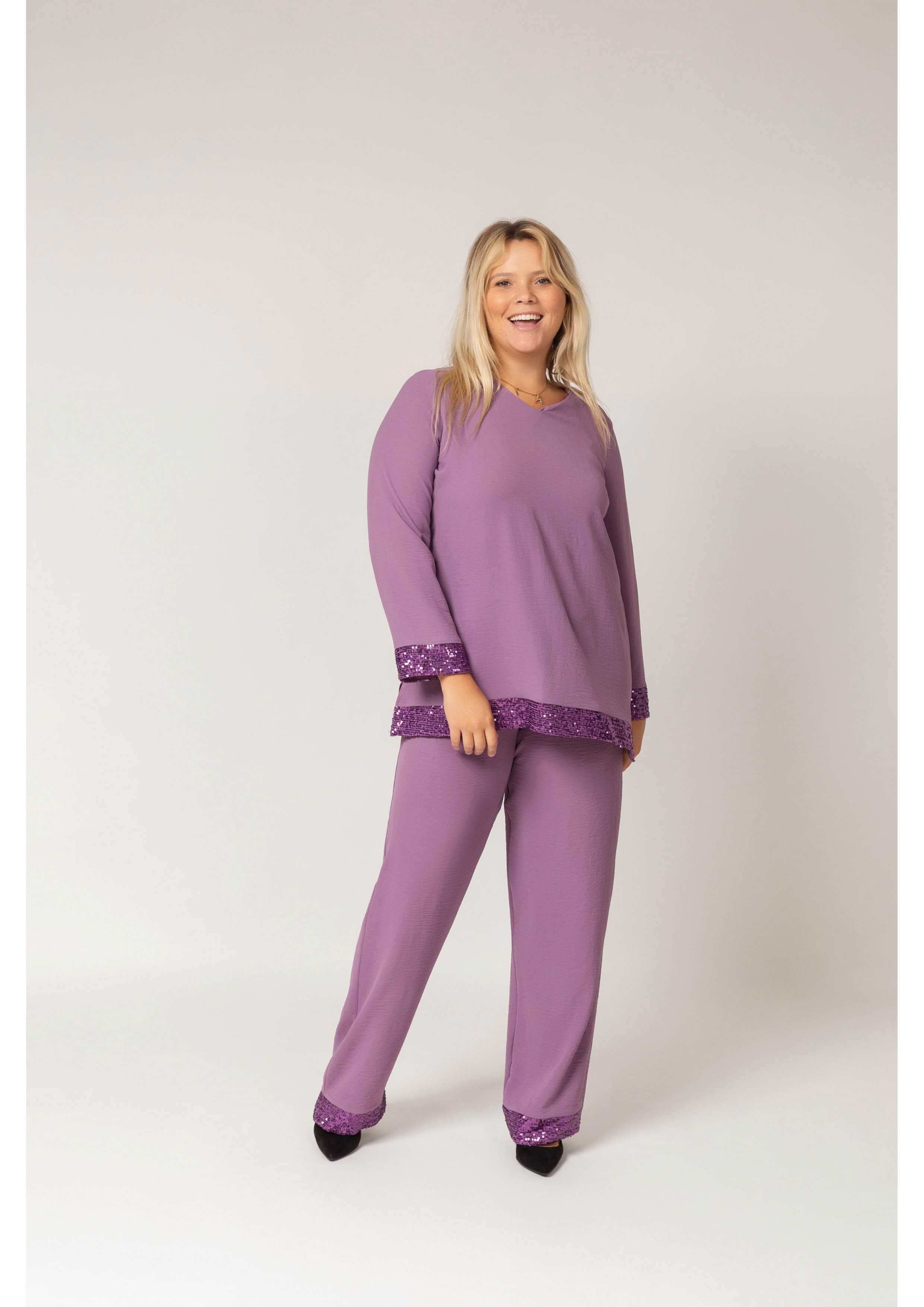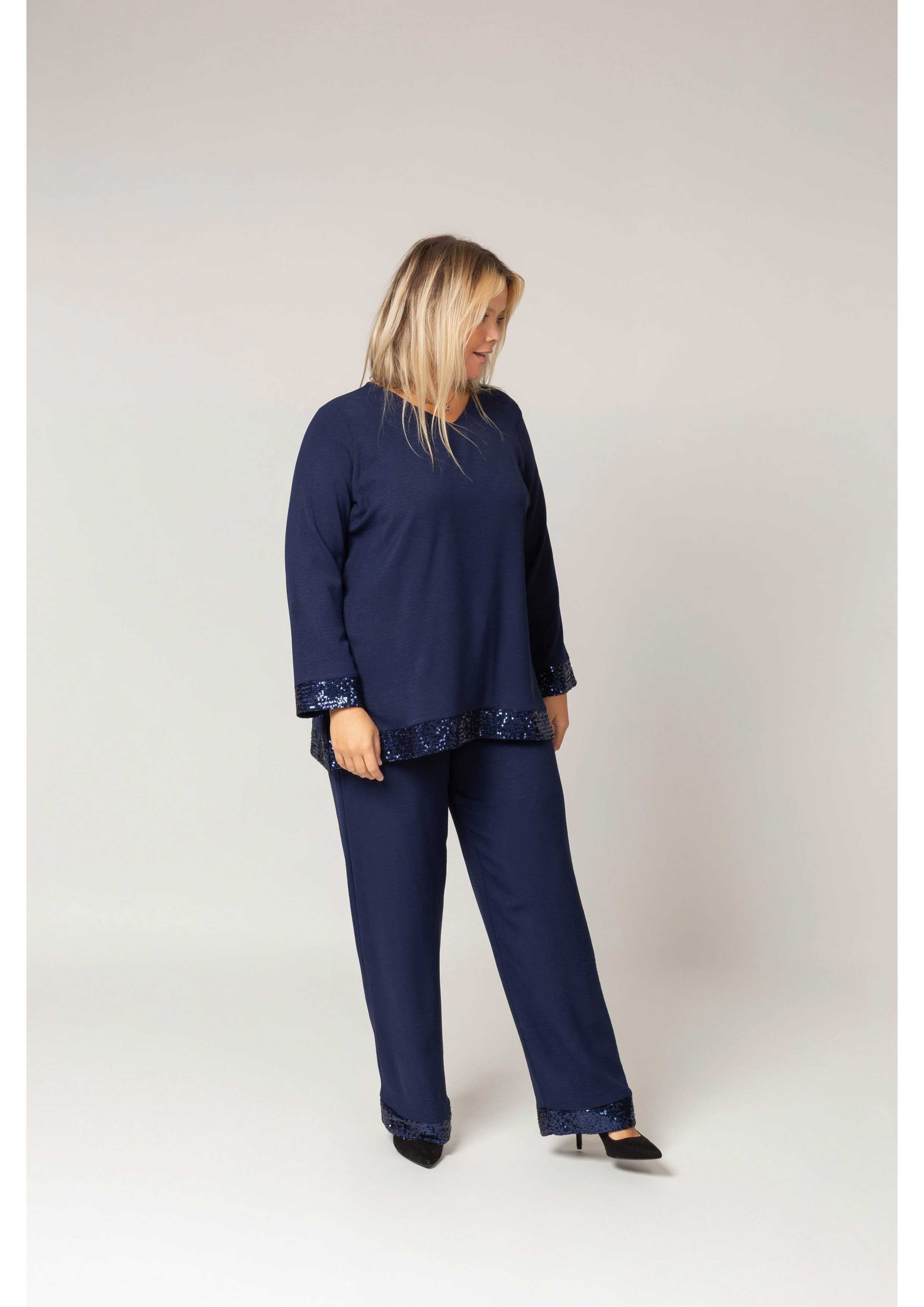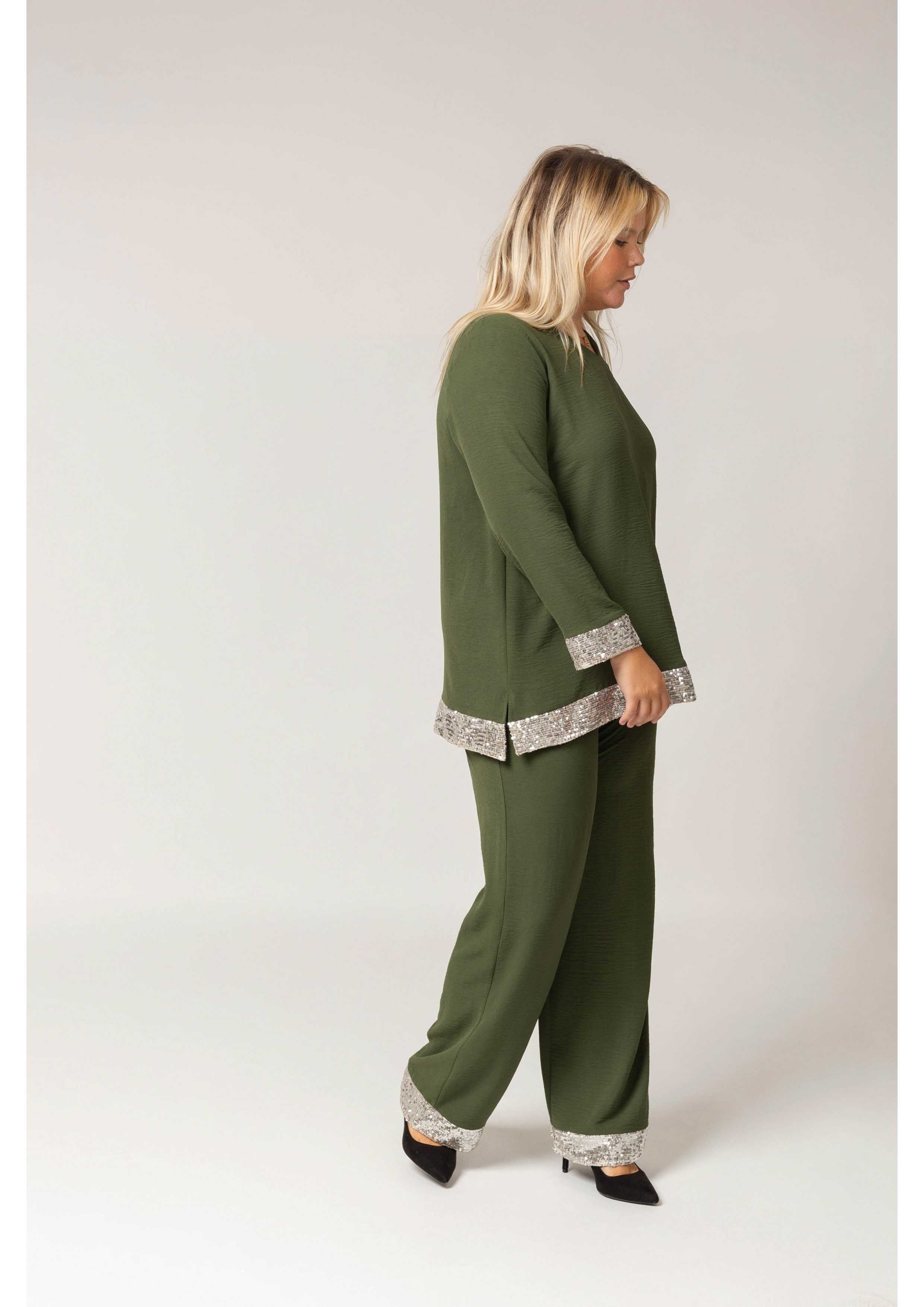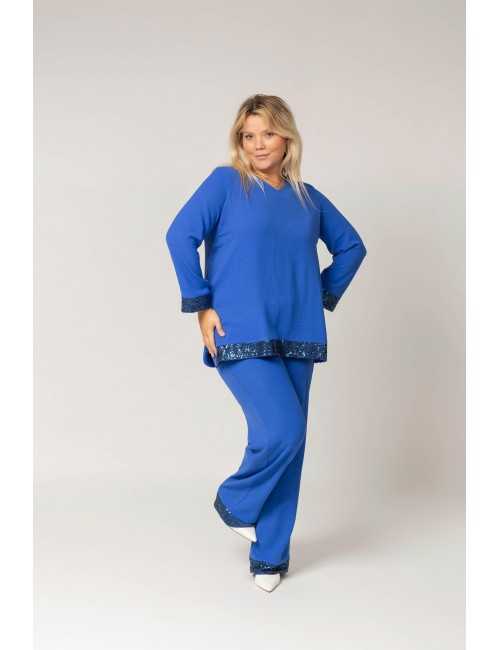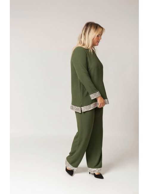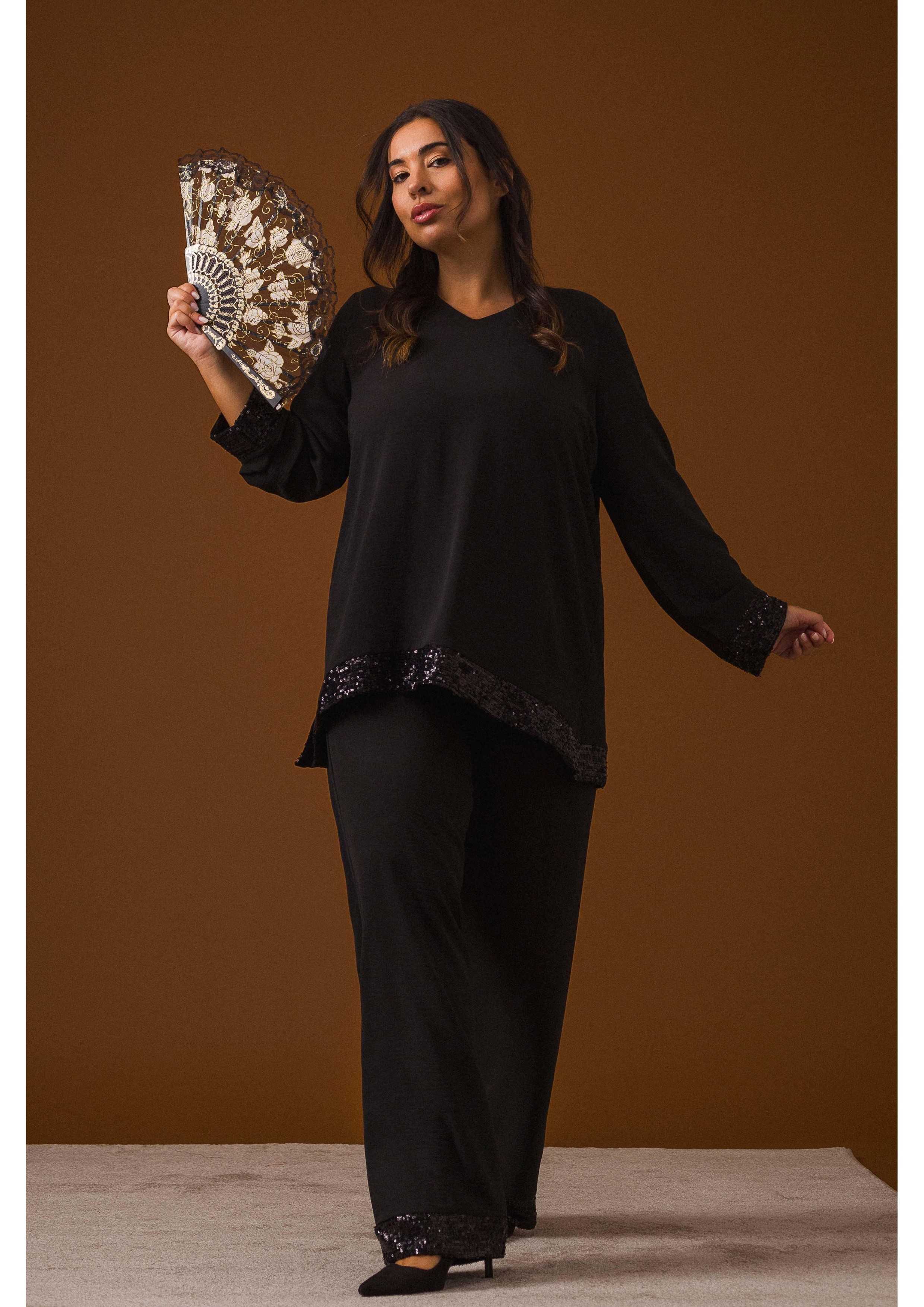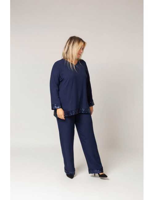 Pants and tunic set in fabric, with sequined details Collection: Autumn Winter Available in Plus Sizes Own design and manufacturing product. We are a clothing manufacturing brand with over 50 years of experience. Model: Height 1.70m wearing size 2XL, in navy blue, lavender, royal blue, and khaki green. Model: Height 1.63m wearing size 2XL, in black. Composition: 100% Polyester | Sequin: 93% Polyester 7% Elastane