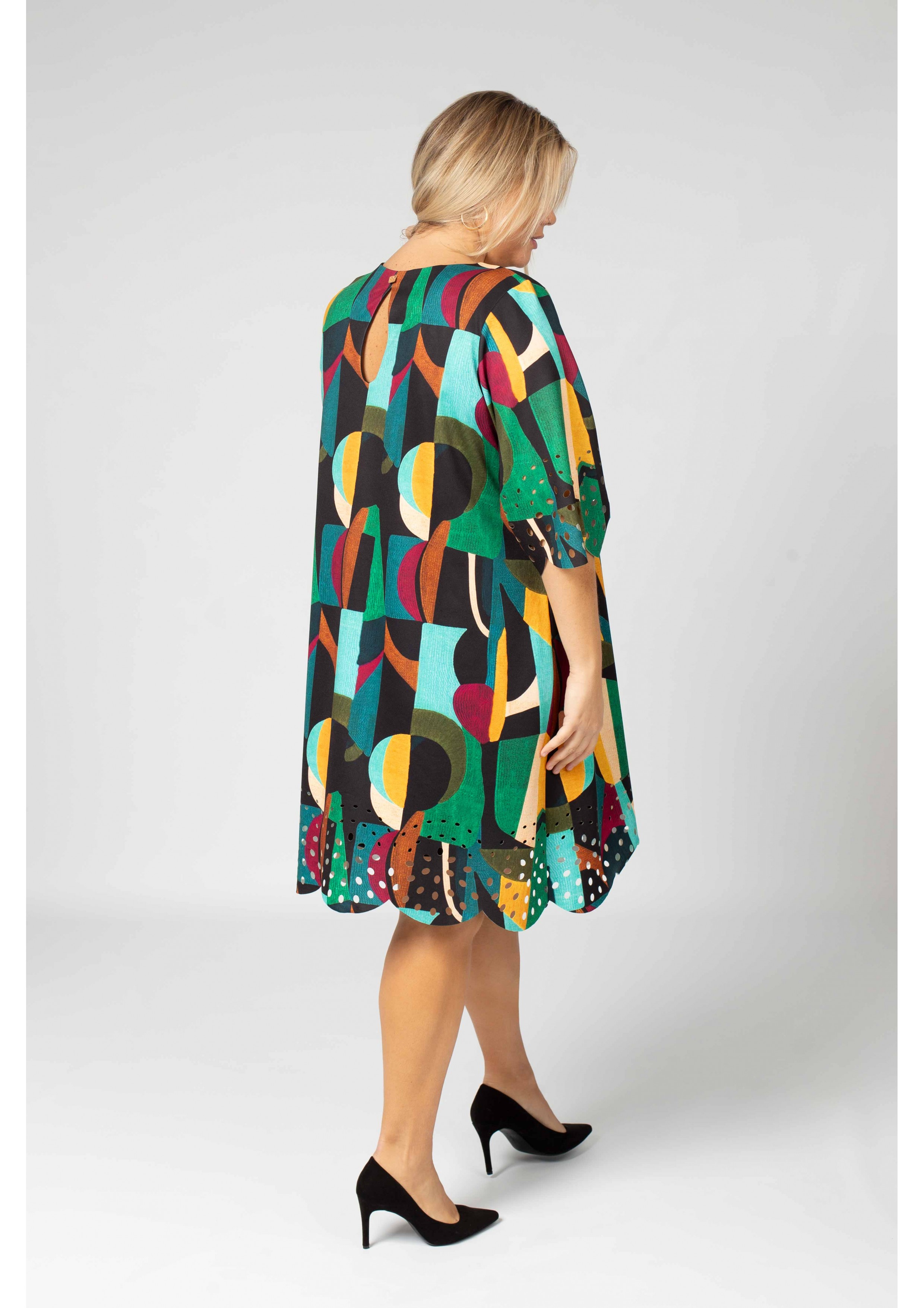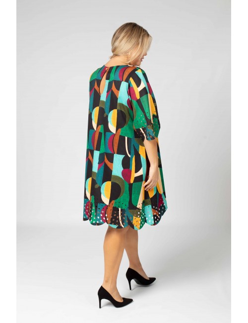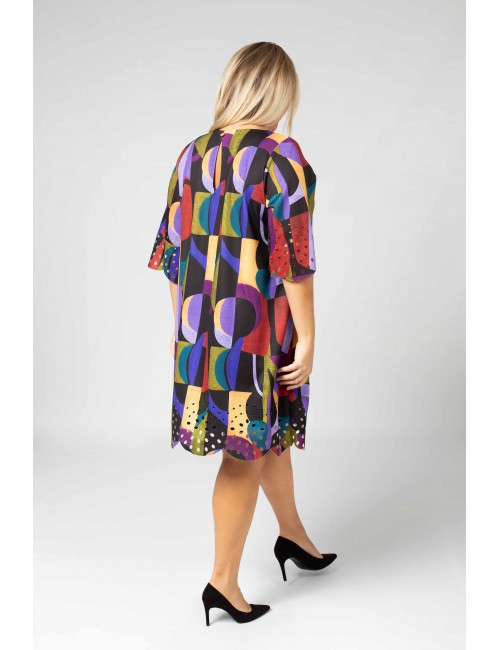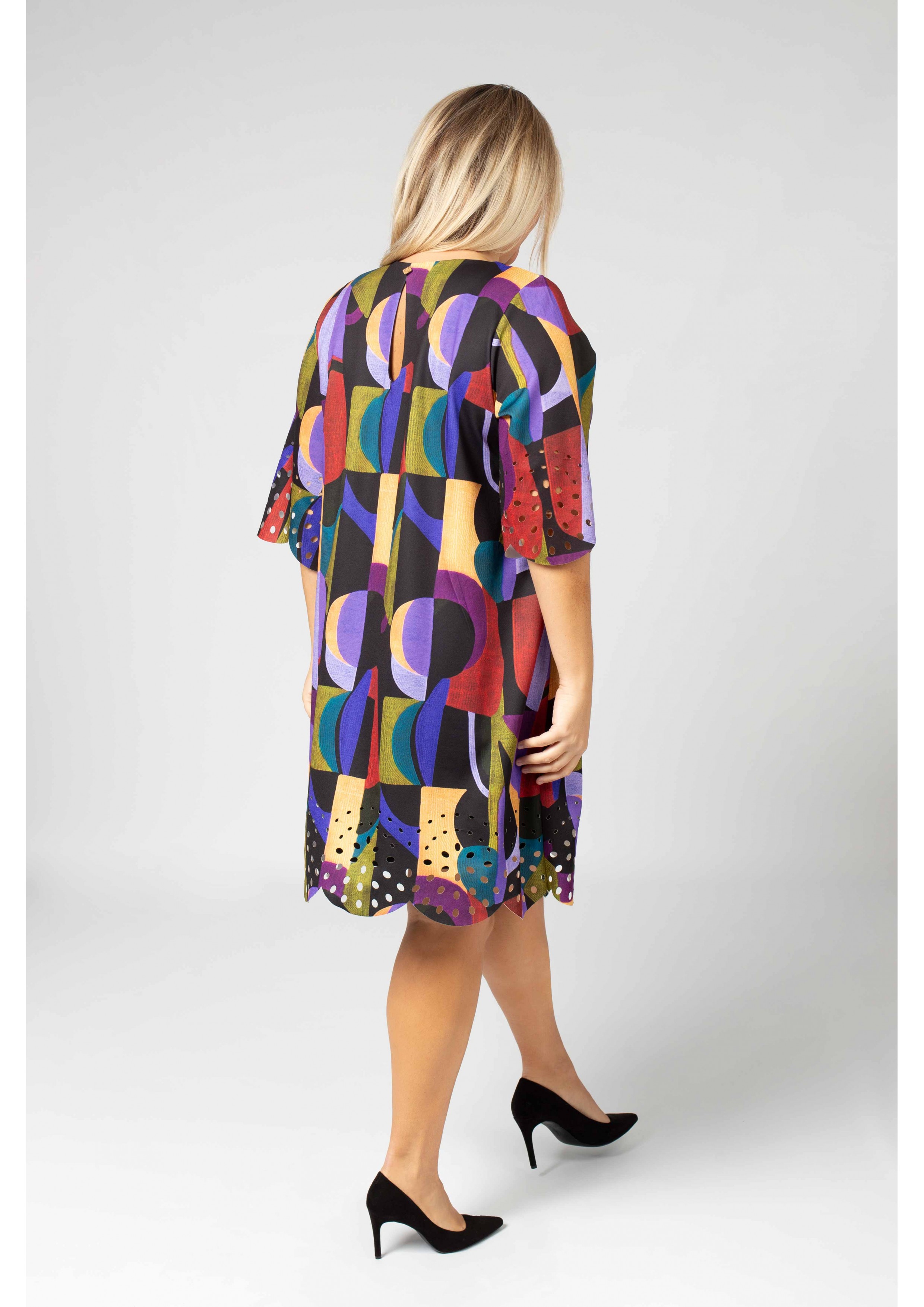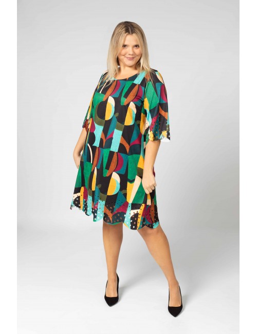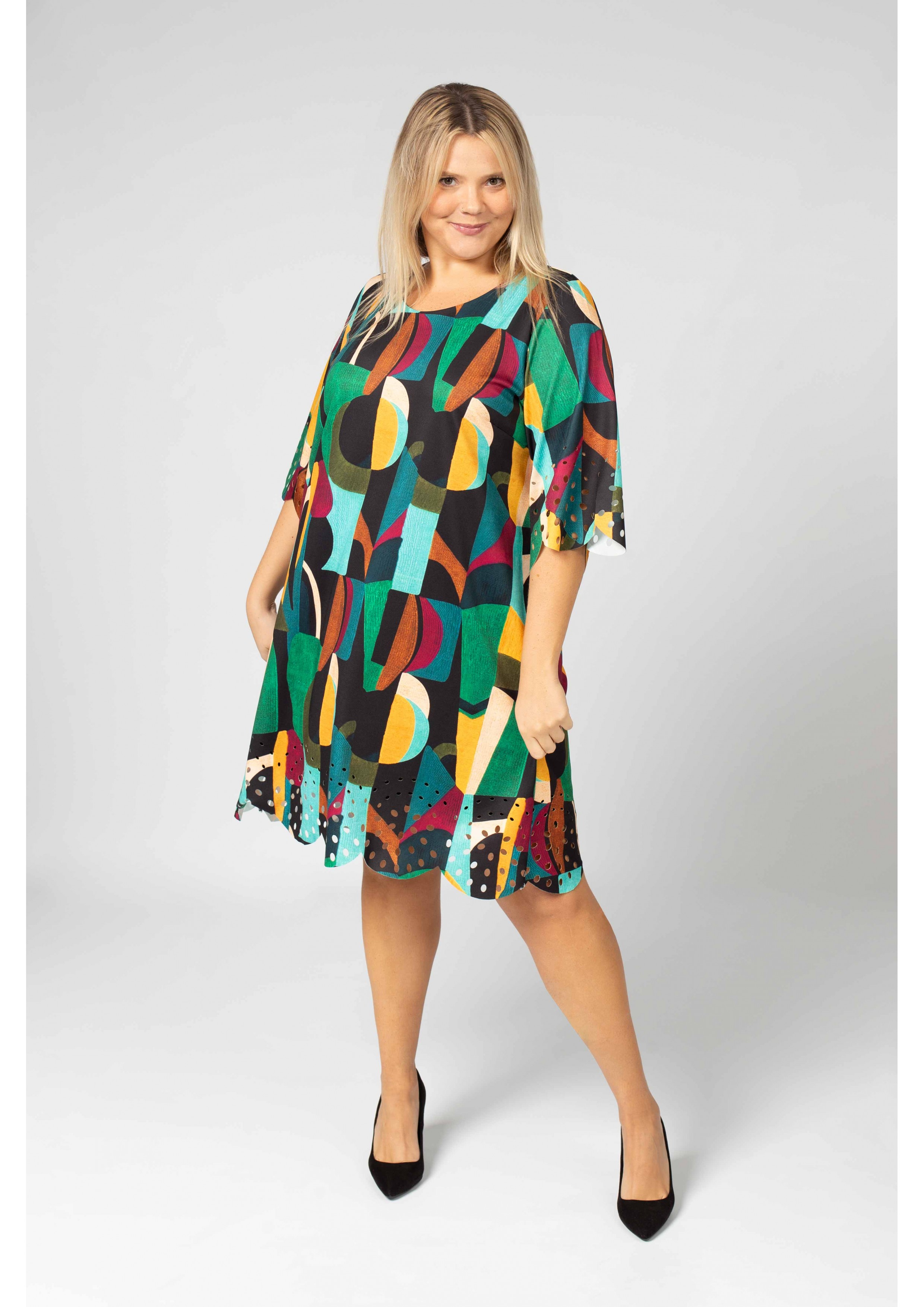 Short printed dress with laser-cut finishes. Collection: Autumn Winter Available in Plus Sizes Own design and manufacturing product. We are a clothing manufacturing brand with over 50 years of experience. Model: Height 1.70m and is wearing size 2XL. Composition: 96% Polyester 4% Elastane | Lining 94% Polyester 6% Elastane