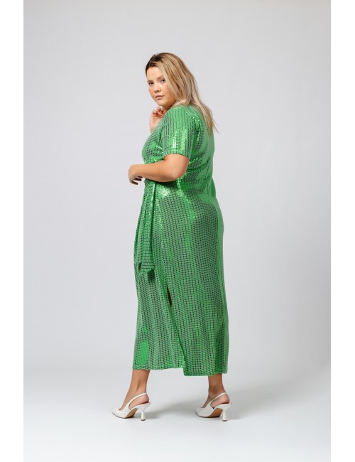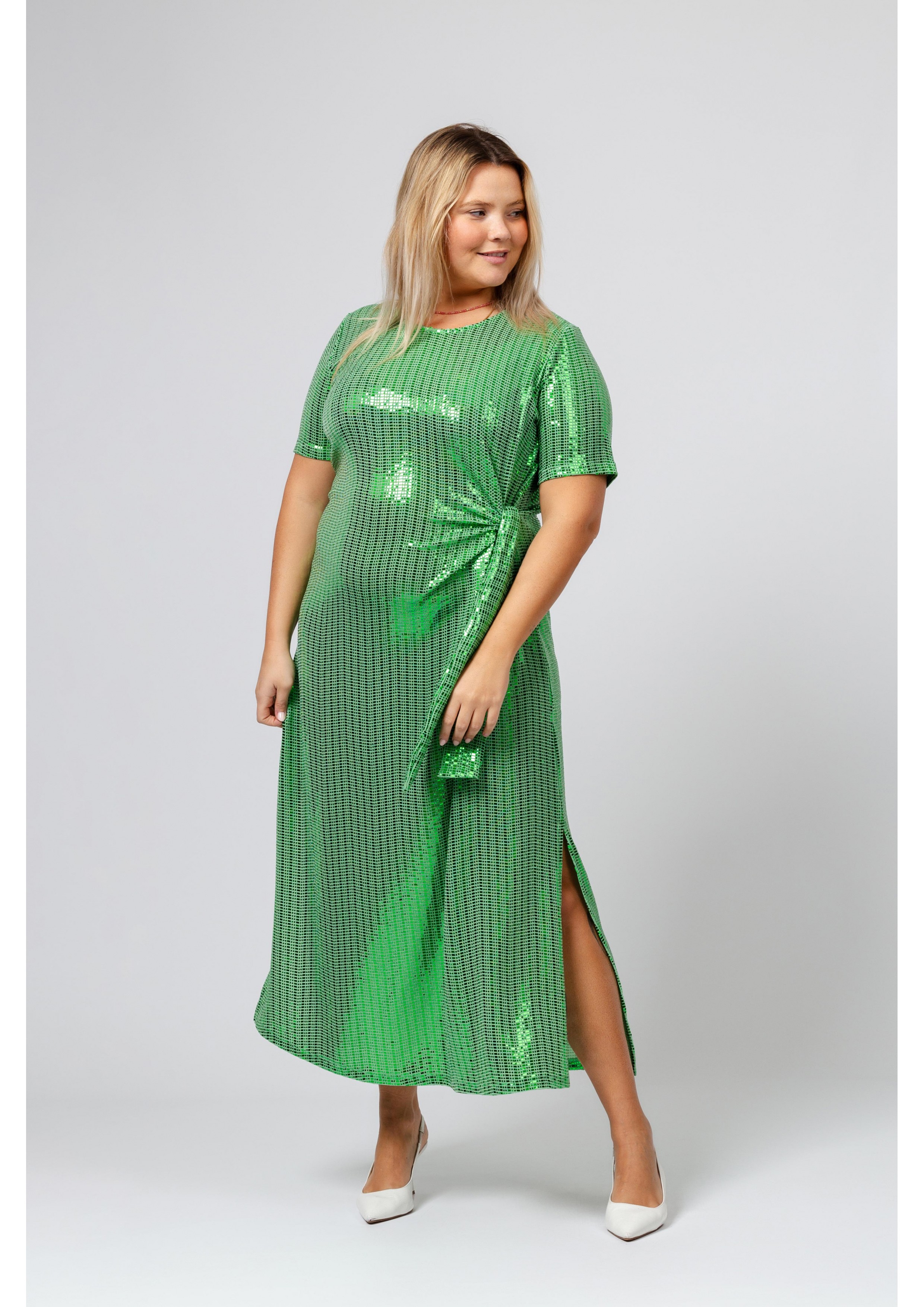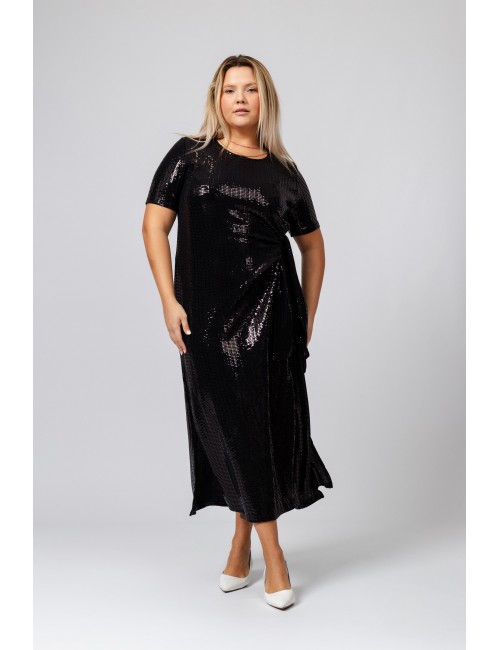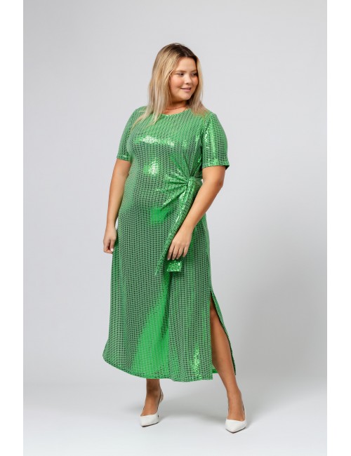 Knitted dress with sequin effect, round neckline, side slits, and draped bow on the side. Collection: Spring Summer Available in Plus Sizes Own design and manufacturing product. We are a clothing manufacturing brand with over 50 years of experience Model: Height 1.70m wearing size 2XL. Composition: 80% Nylon 15% Metal 5% Elastane