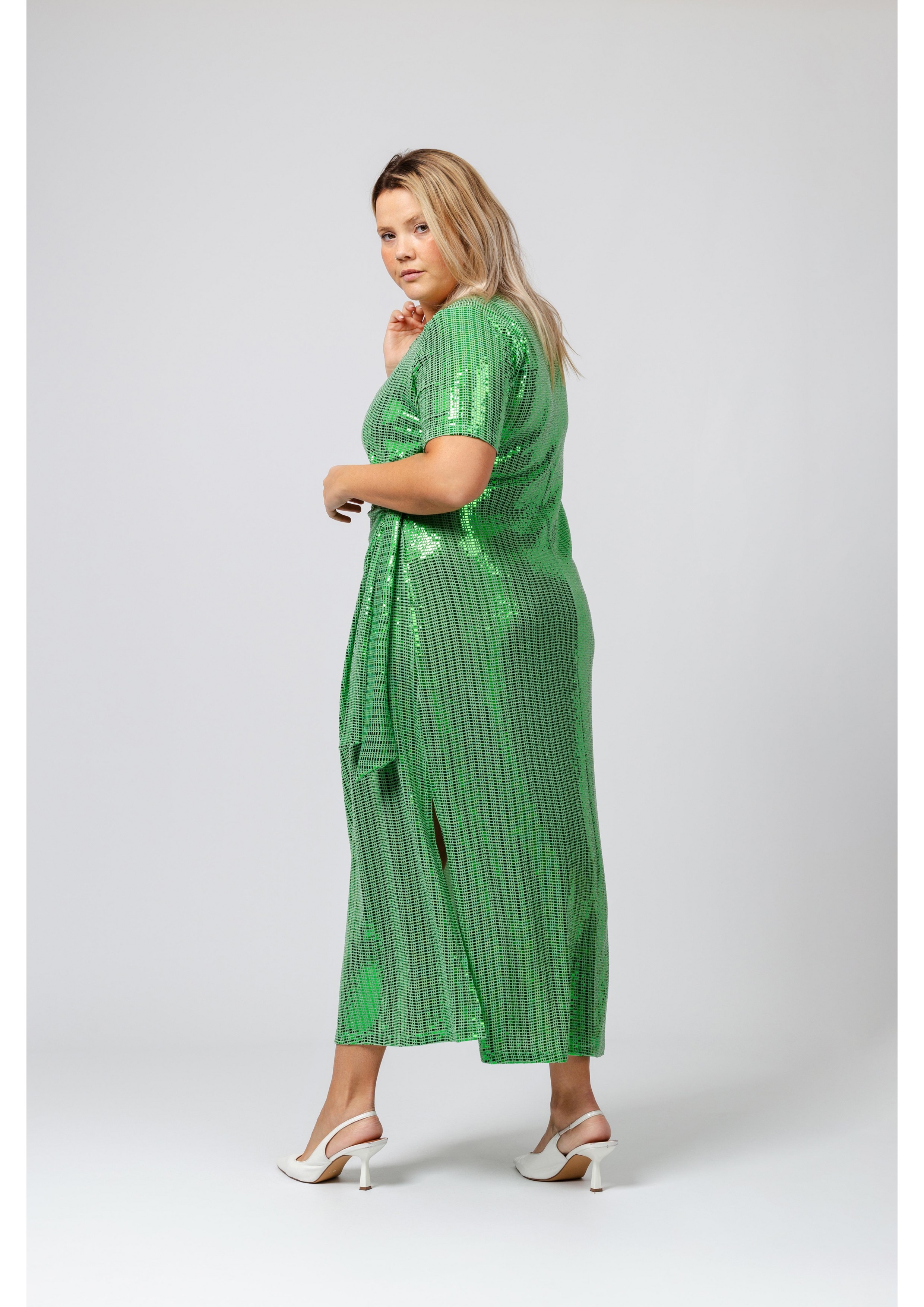 Knitted dress with sequin effect, round neckline, side slits, and draped bow on the side. Collection: Spring Summer Model: Height 1.70m wearing size 2XL. 80% Nylon 15% Metal 5% Elastane