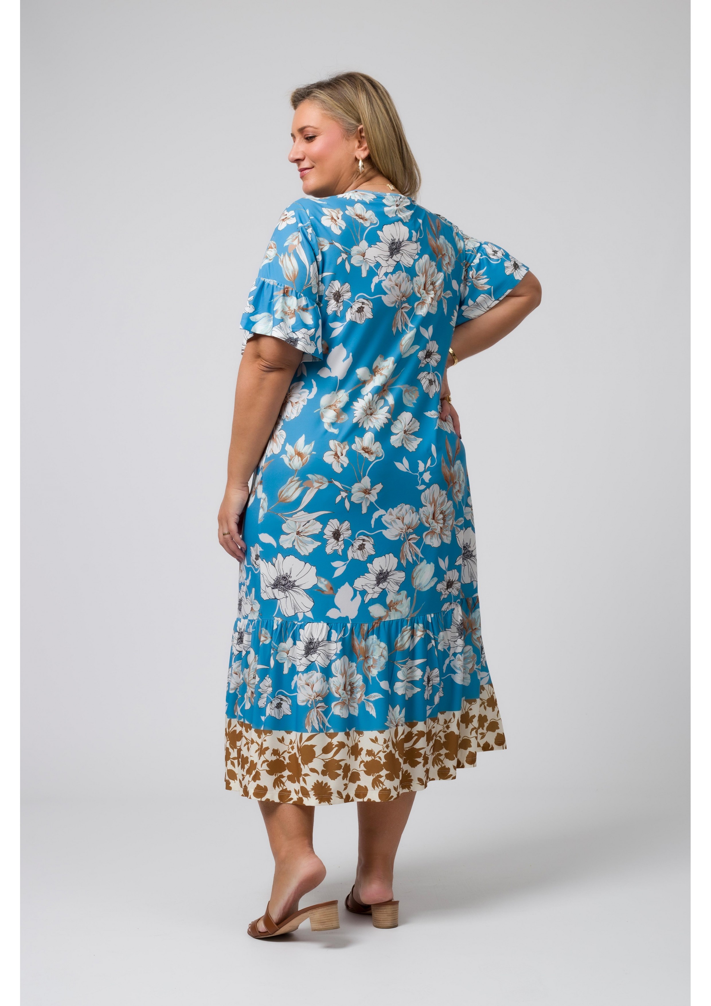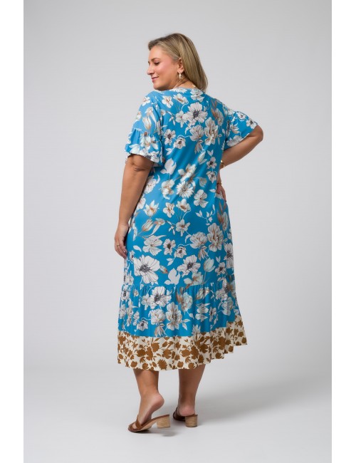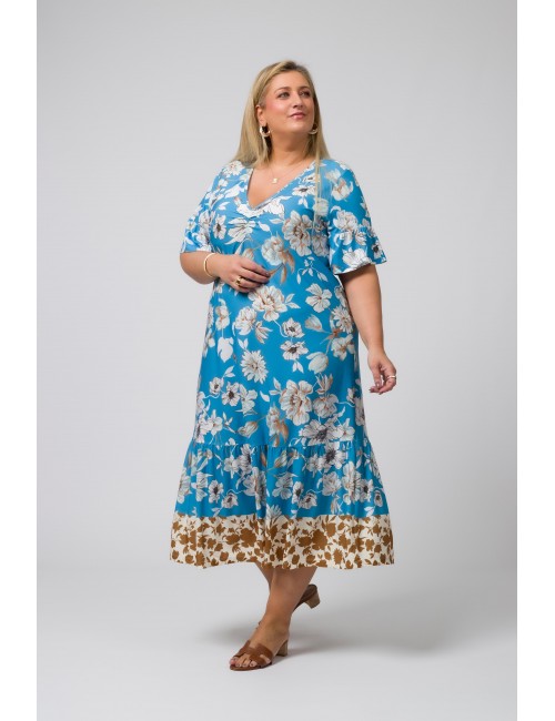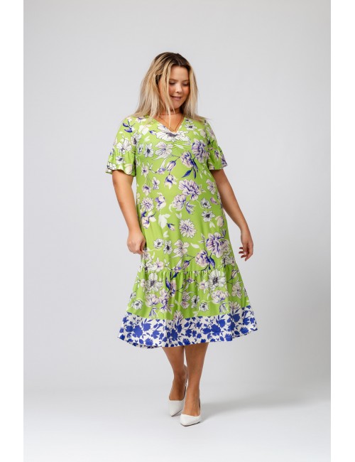 Short printed knit dress with a draped V-neck. Collection: Spring Summer Available in Plus Sizes Custom design and manufacture. We are a clothing brand with over 50 years of experience Model: Height 1.70m and wearing size 3XL in green. Model: Height 1.65m and wearing size 4XL in blue. Composition: 96% Polyester 4% Elastane