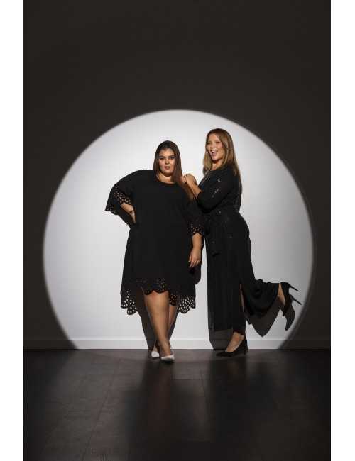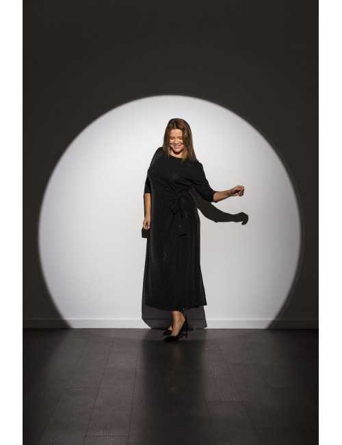 Plain knit dress with sequined detail. 3/4 sleeves, side slits, knot on the side front. Collection: Autumn Winter Available in Plus Sizes Product designed and manufactured in-house. We are a clothing manufacturing brand with over 50 years of experience Model: Height 1.63m and is wearing size 2XL. Composition: 80% Polyester 15% Metal 5% Elastane
