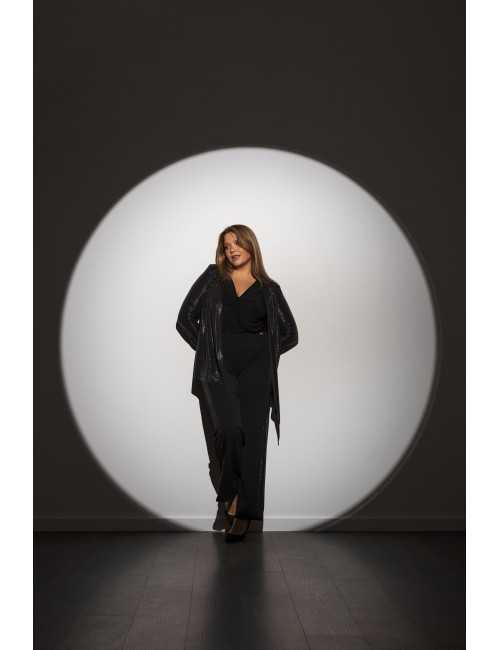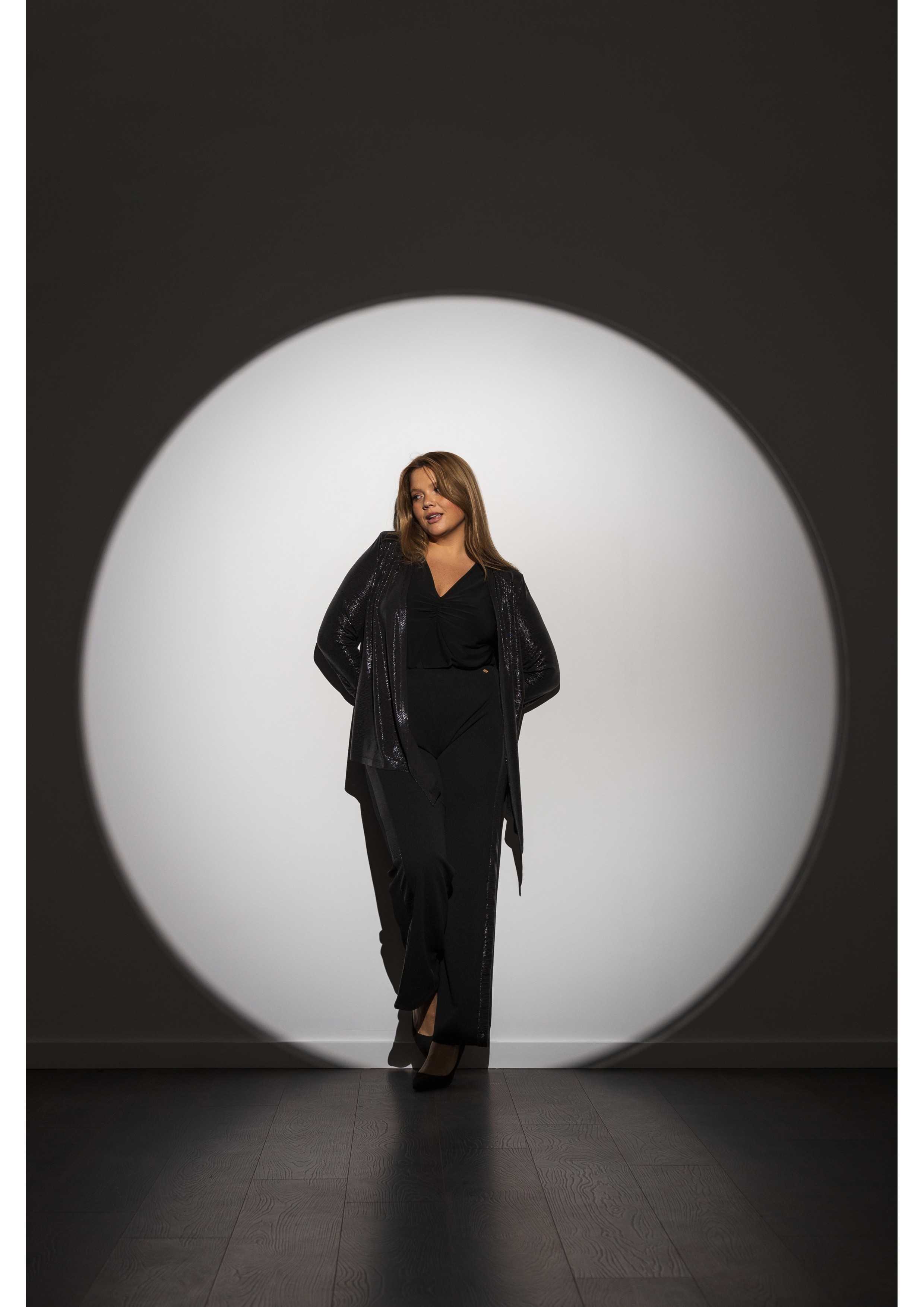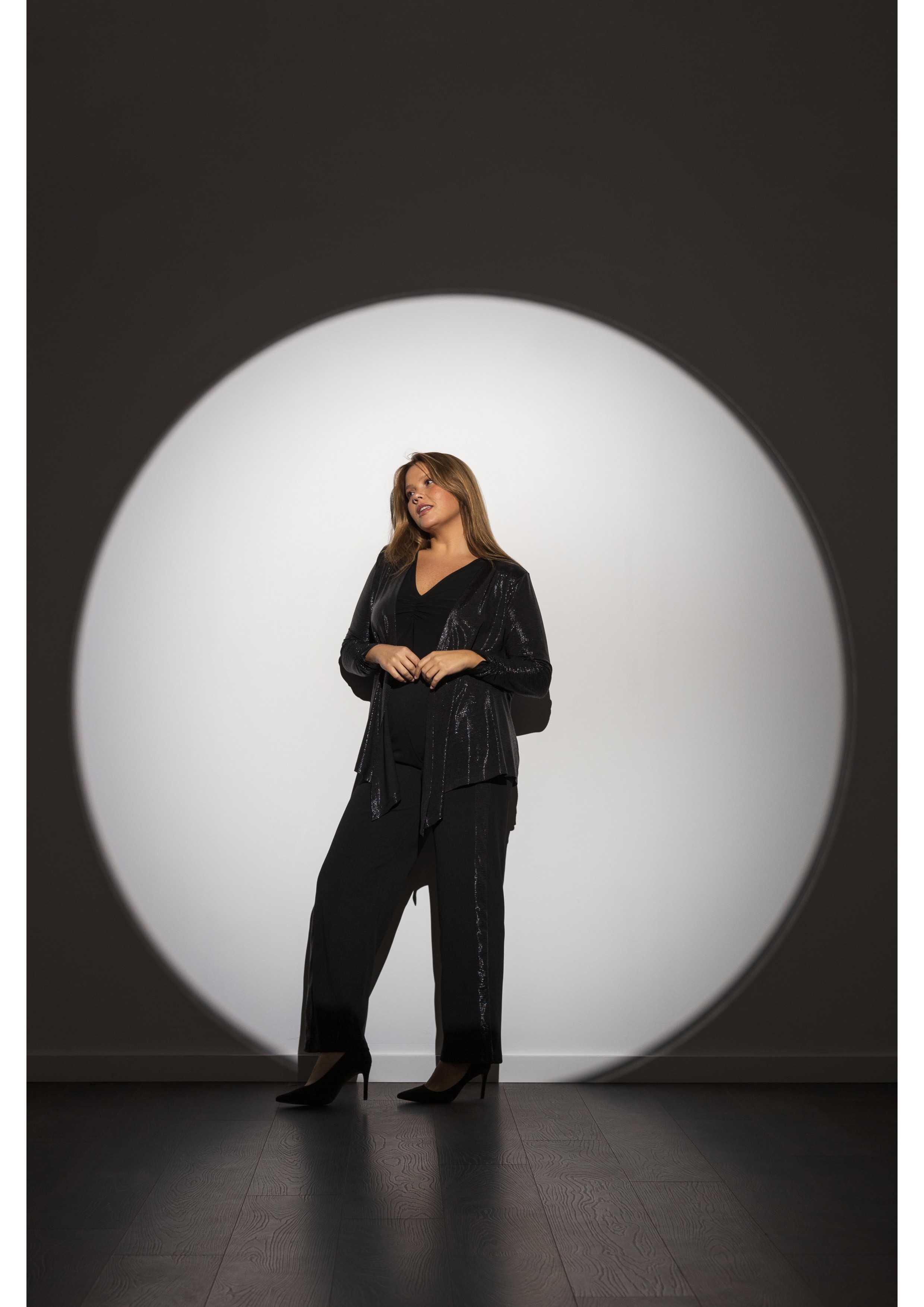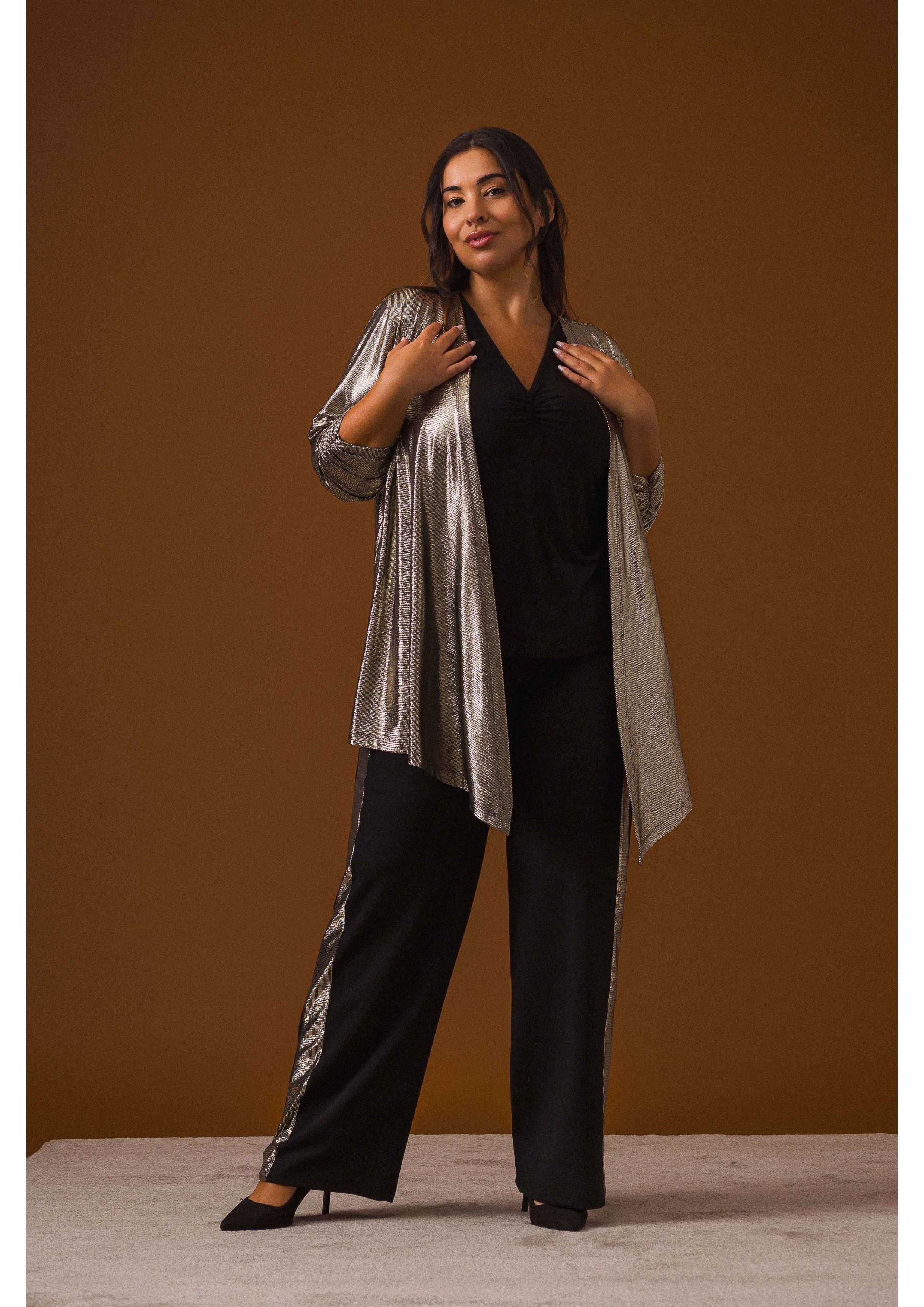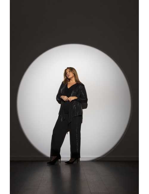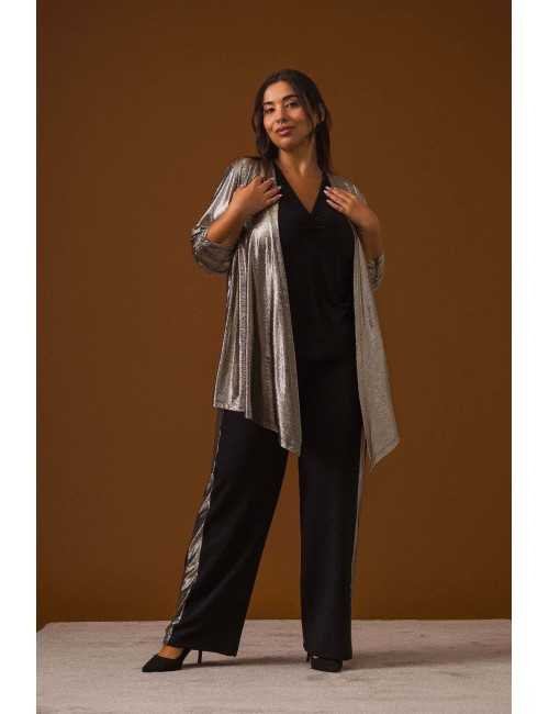 Shiny and smooth knit set, peak collar jacket, long puffed sleeves with elastic, has shoulder pads. Plain trousers with shiny side hem and elastic waistband. Collection: Autumn Winter Available in Plus Sizes Own design and manufacturing product. We are a clothing confection brand with over 50 years of experience Model: Height 1.63m and is wearing size 2XL, in gold color. Model: Height 1.70m and is wearing size 2XL, in black color. Composition: 95% Polyester 5% Elastane