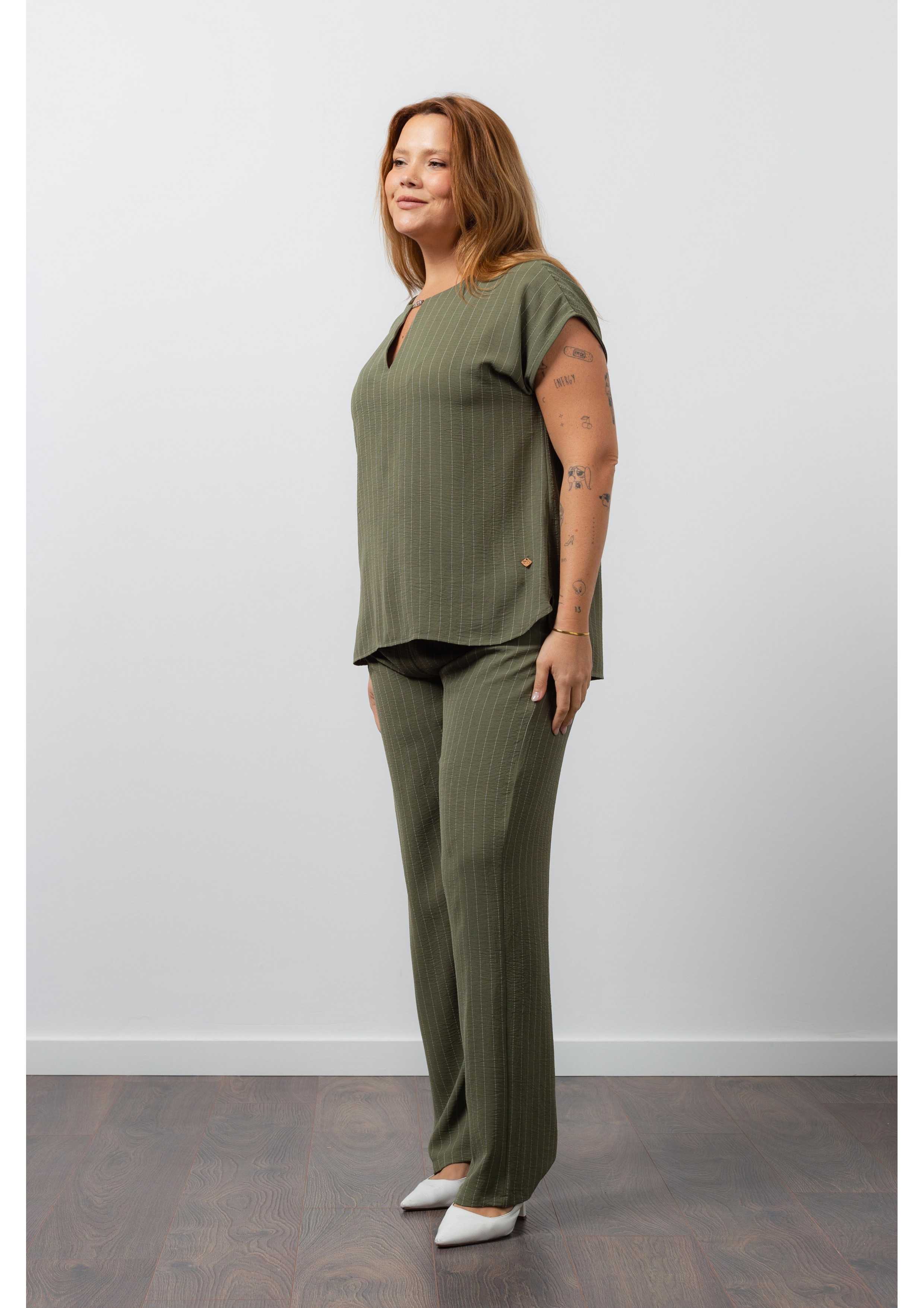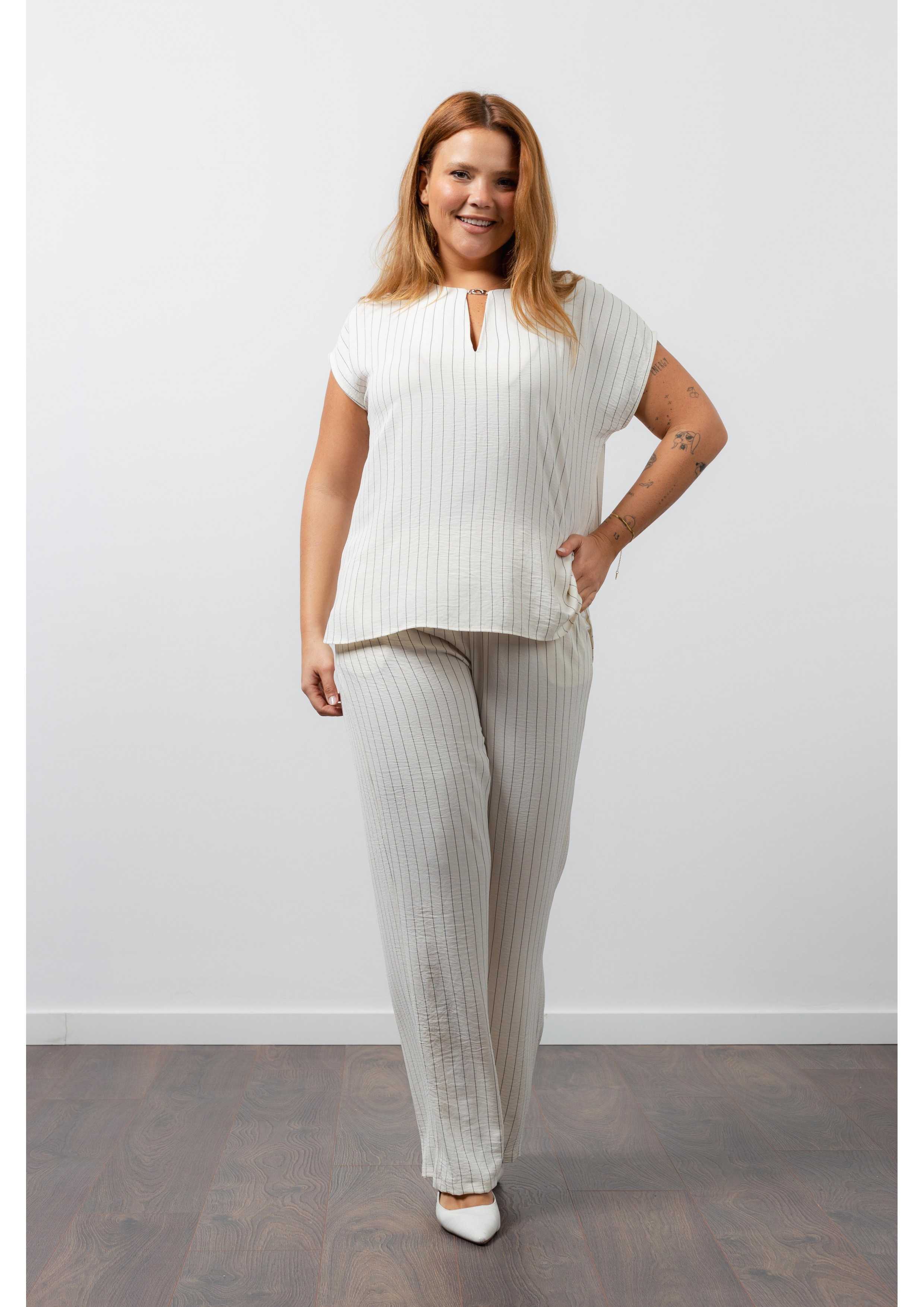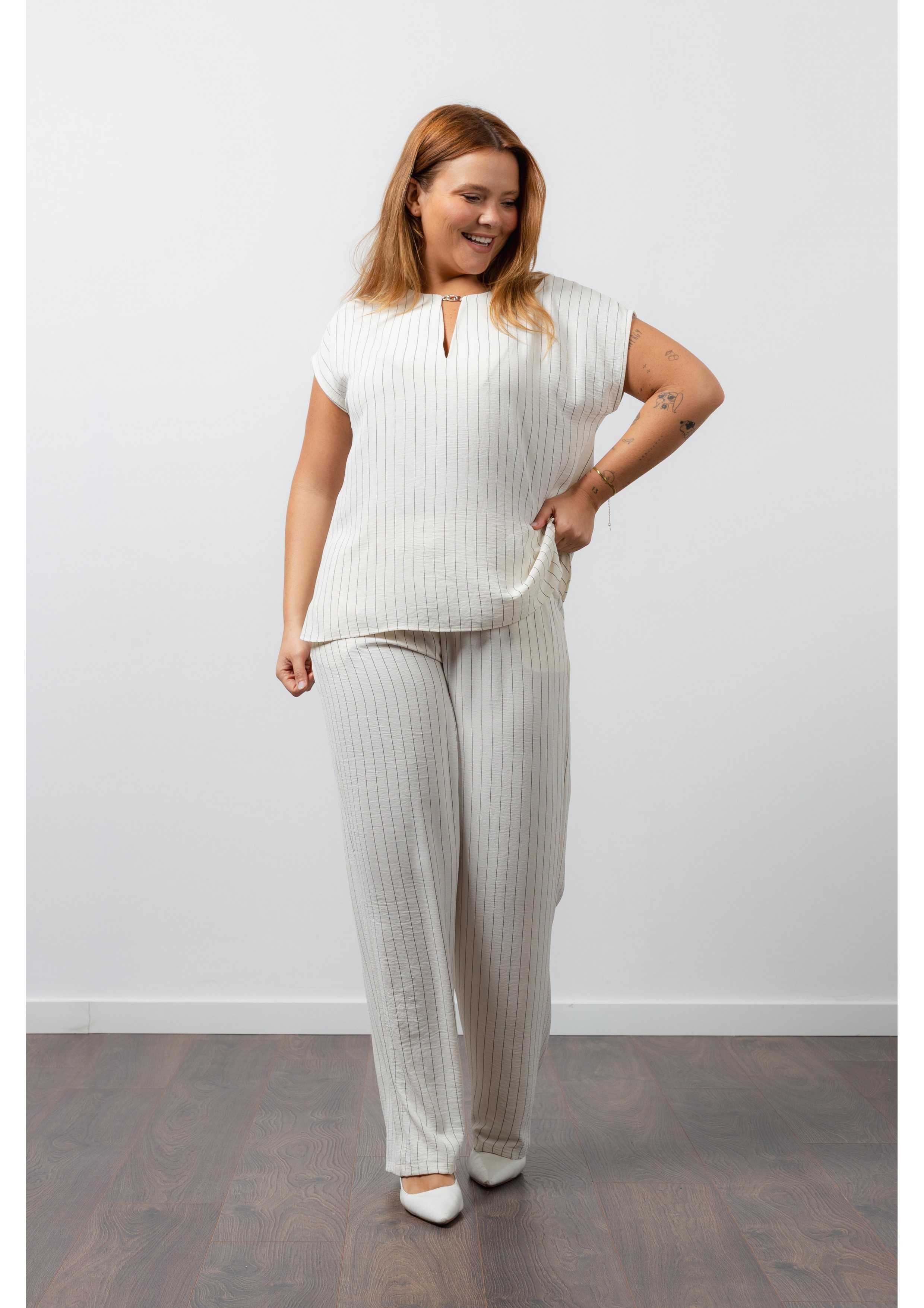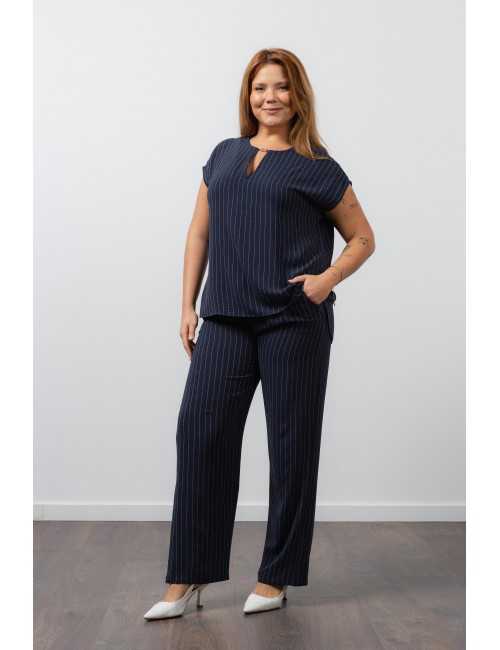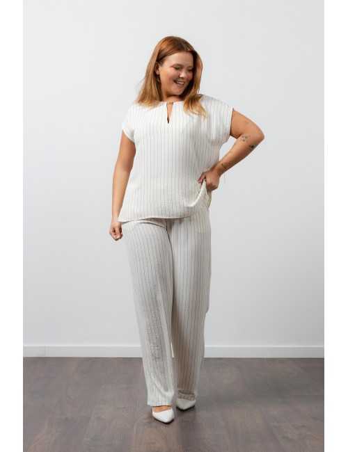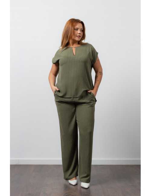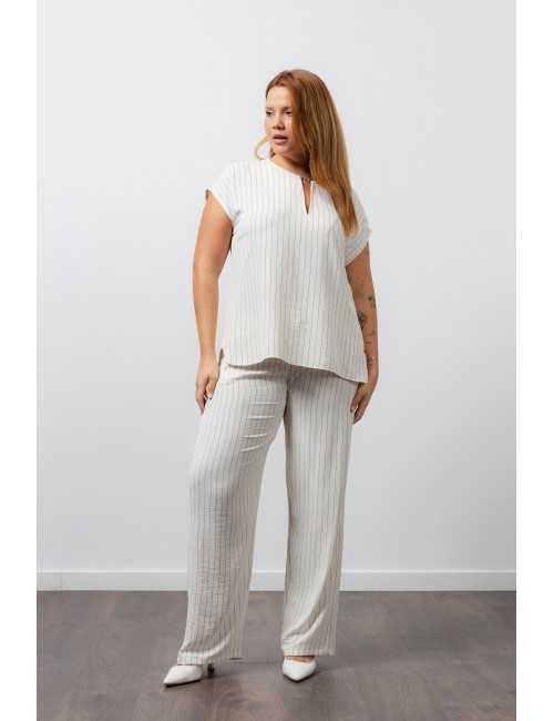 Solid vertical stripe set, tunic with round neckline and tear drop detail, rounded base. Pants with side pockets, high elastic waist with double stitching. Collection: Spring Summer Model: Height 1.70m and is wearing size XL.