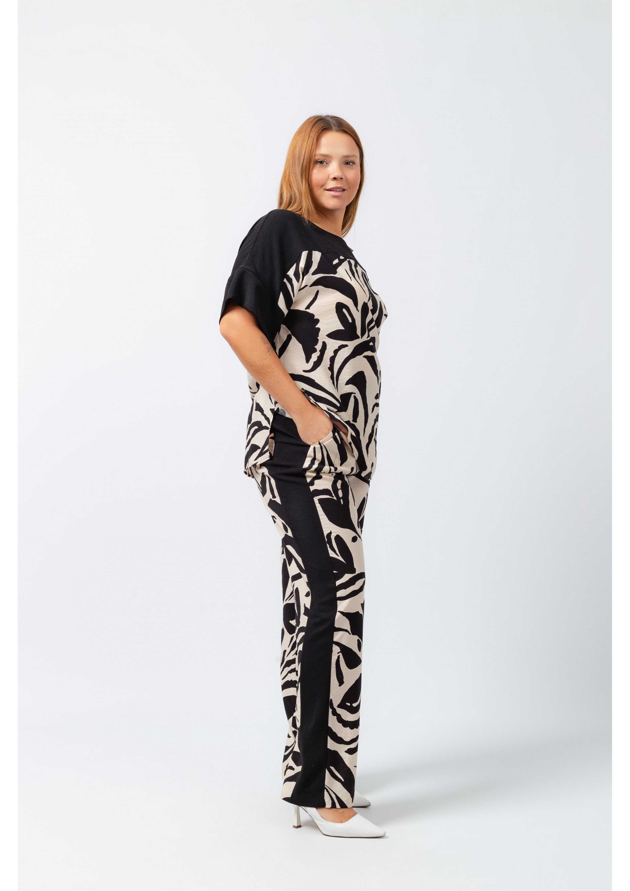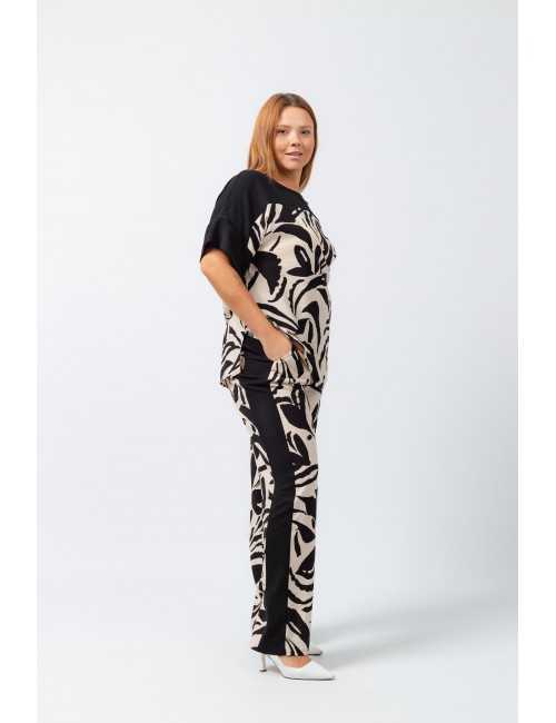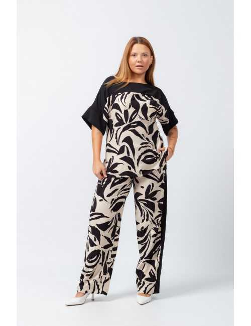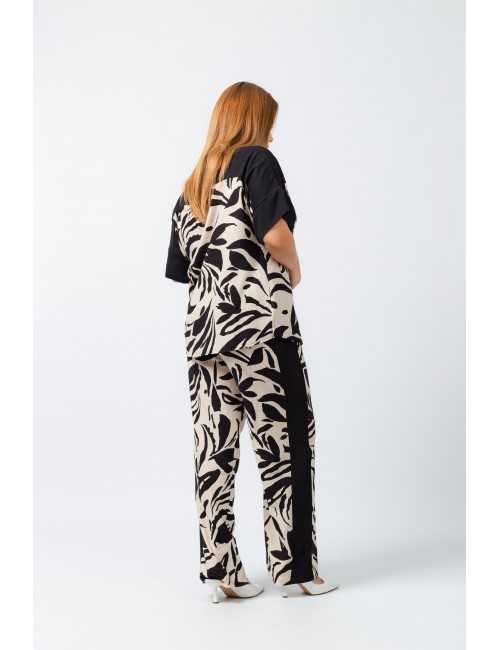 Printed fabric set, with smooth fittings. Top with side slits, spaghetti straps, and smooth sleeves. Closed teardrop at the back. Pants with side pockets, smooth side hem, elastic waistband. Collection: Spring Summer Available in Plus Sizes Own design and manufacturing. We are a clothing manufacturing brand with over 50 years of experience Model: Height 1.70m and is wearing size XL. Composition: 75% Viscose 25% Polyamide | 100% Polyester