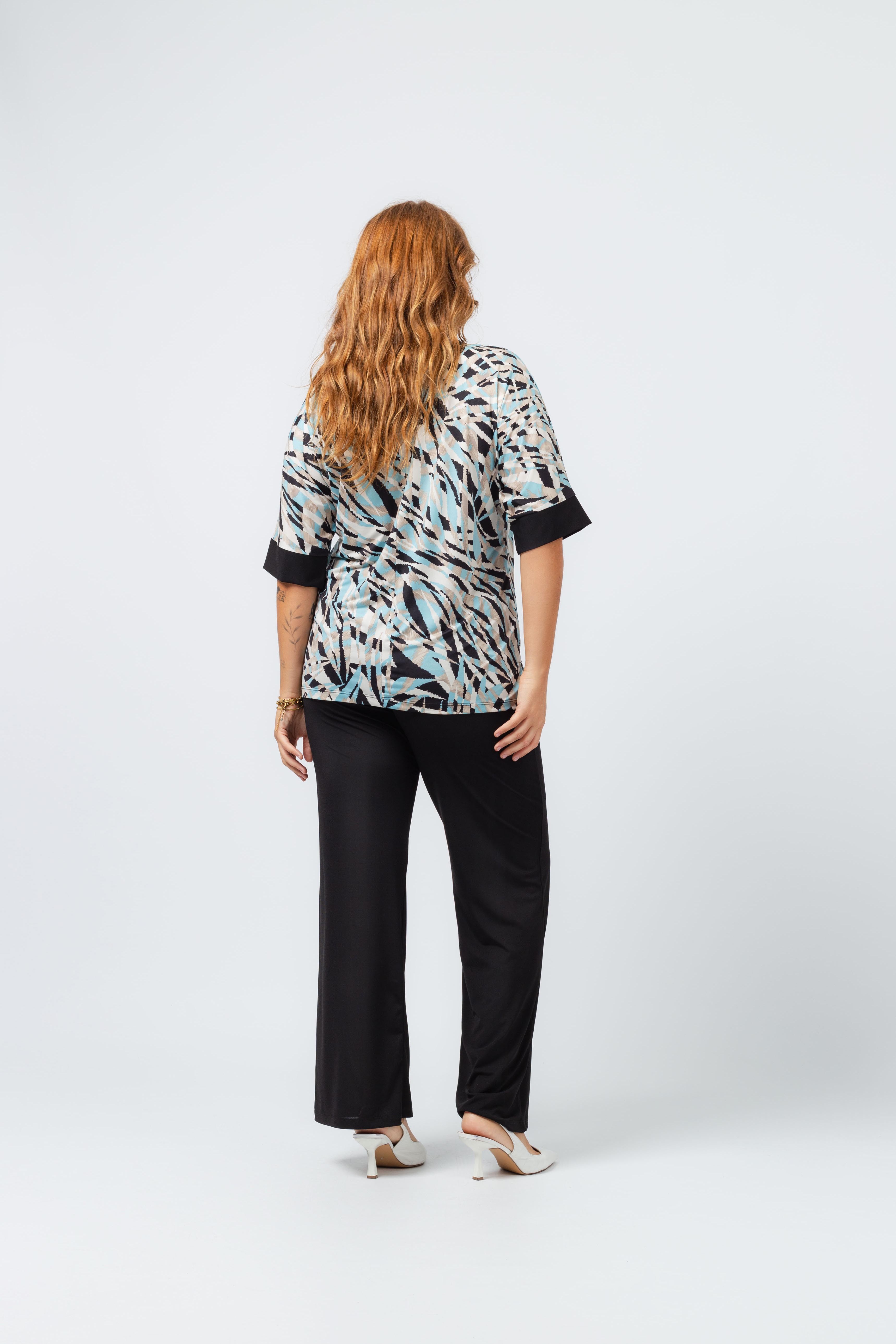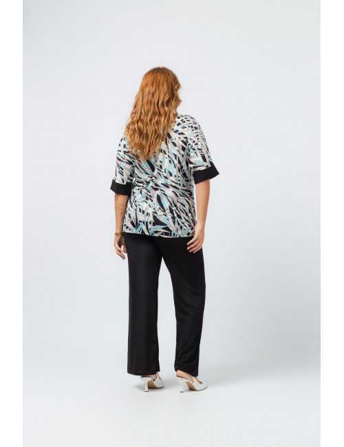 Set in plain and printed knit, printed batwing sleeved blouse, side slits, V-neckline, and cuffs in plain knit, plain trousers with a high elastic waistband, loose model. Collection: Spring Summer Available in Plus Sizes Own design and manufacturing product. We are a clothing manufacturing brand with over 50 years of experience Model: Height 1.70m and is wearing size XL. Composition: 94% Polyester 6% Elastane