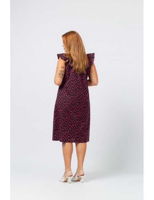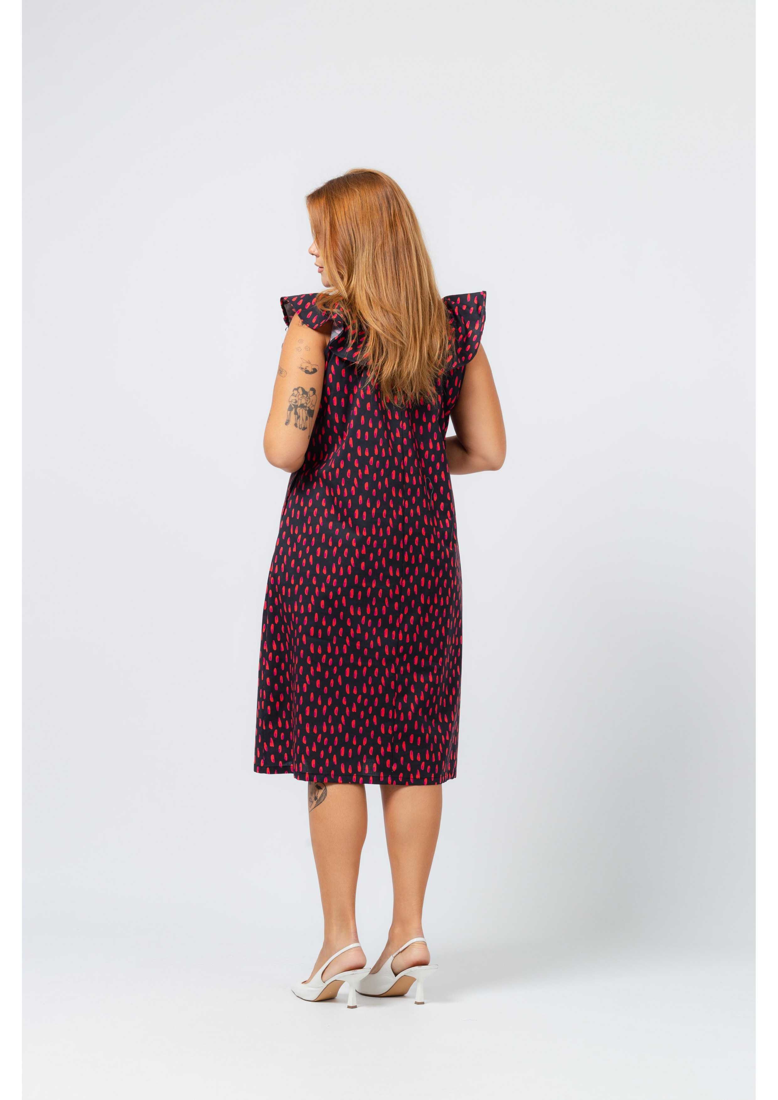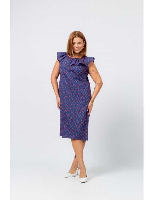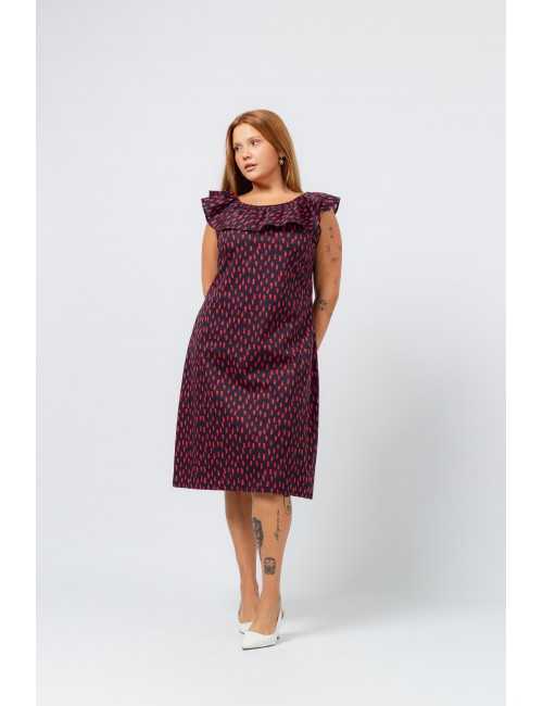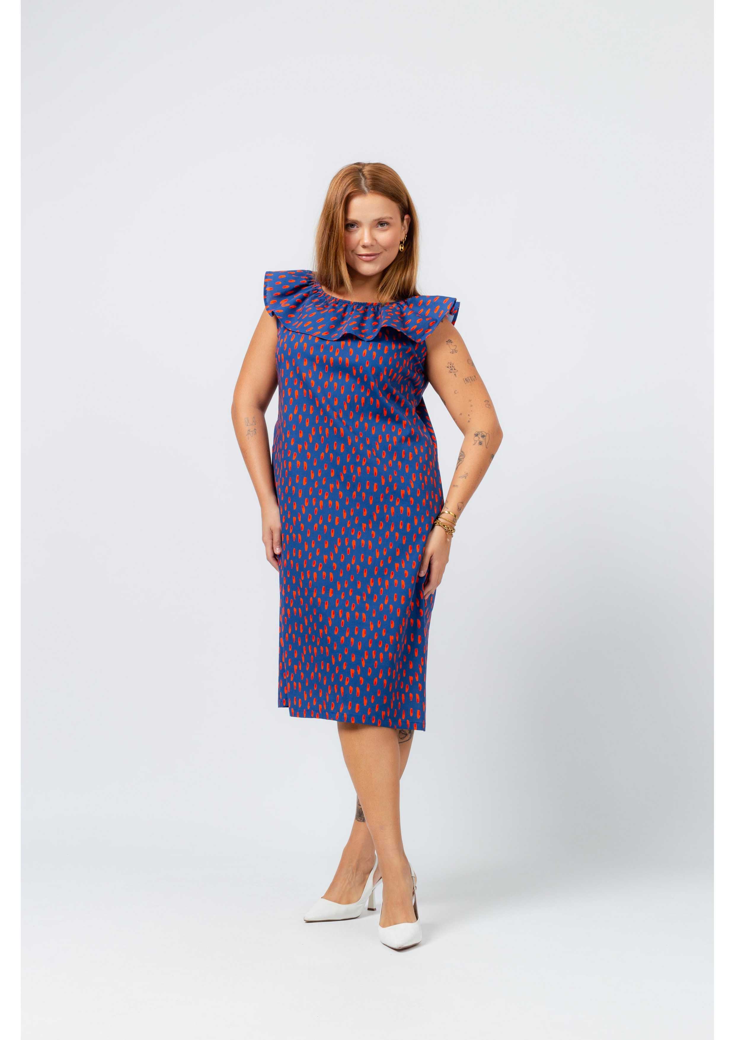 Dress in printed fabric, cap sleeve, frill around the neckline and side pockets. Slightly fitted straight cut. Collection: Spring Summer Available in Plus Sizes Custom designed and manufactured product. We are a clothing manufacturing brand with over 50 years of experience Model: Height 1.70m and is wearing size XL. Composition: 98% Cotton 2% Elastane