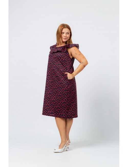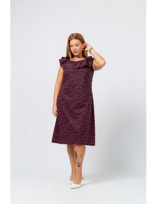 Dress in printed fabric, cap sleeve, frill around the neckline and side pockets. Slightly fitted straight cut. Collection: Spring Summer Model: Height 1.70m and is wearing size XL