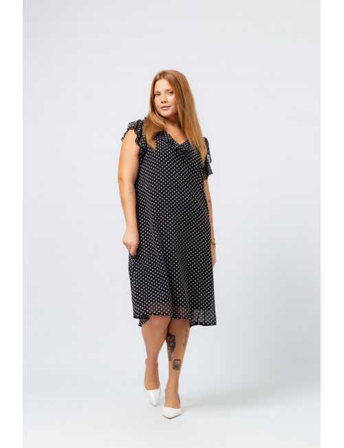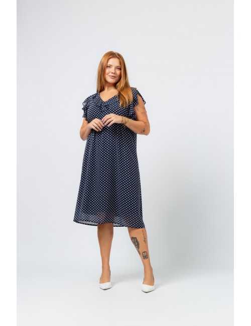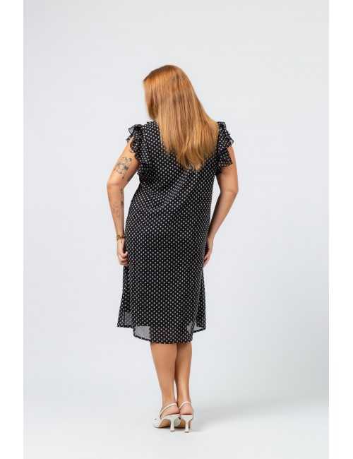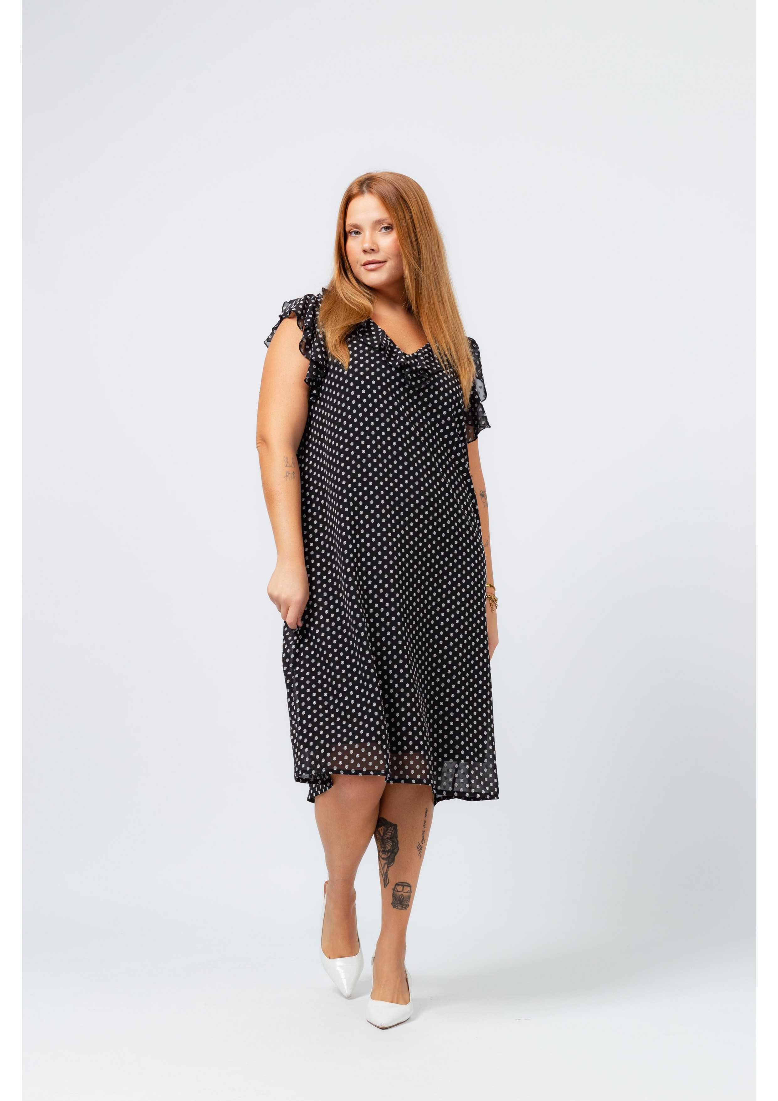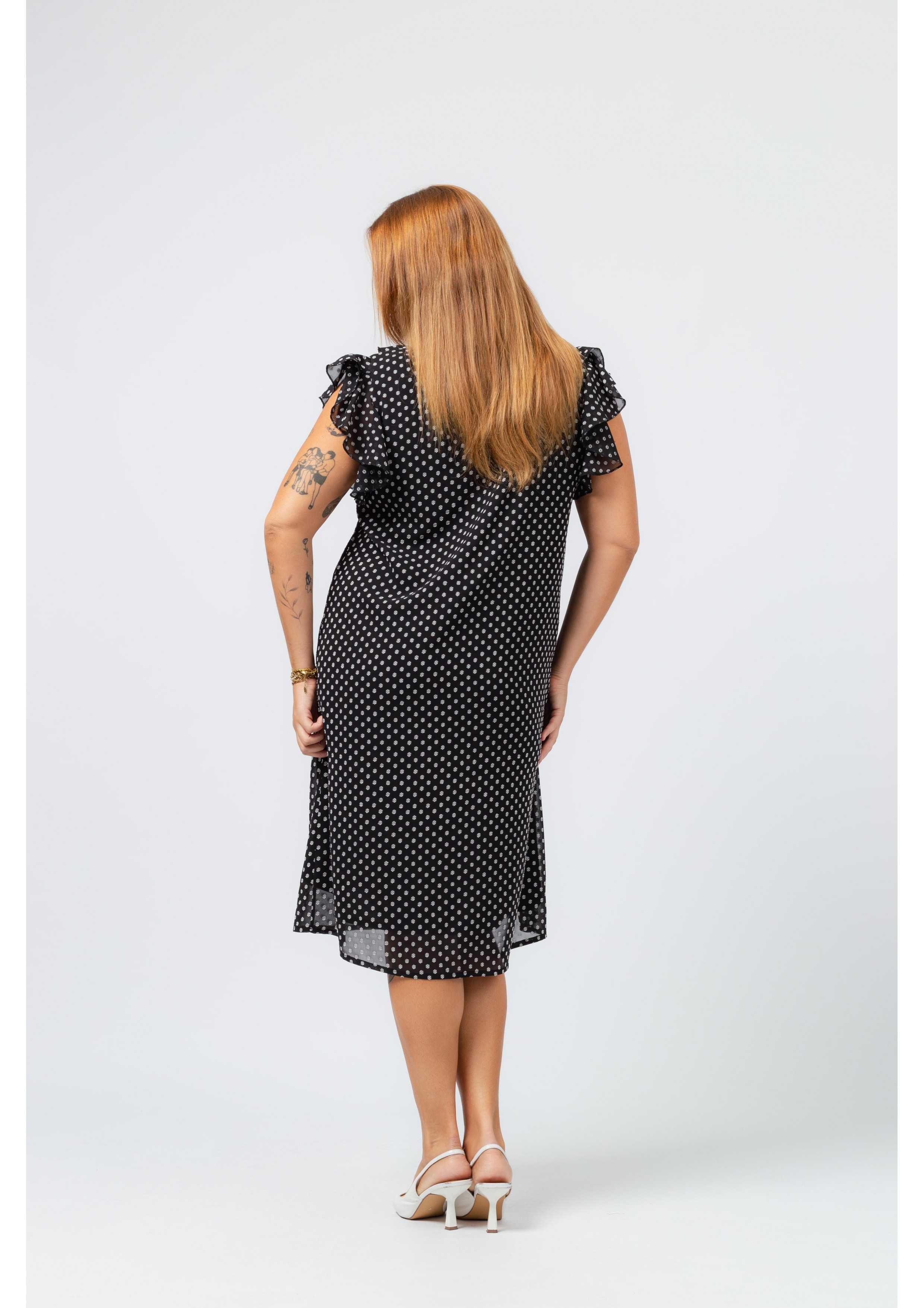 Embroidered fabric dress, floral chiffon, with ruffles on the sleeves and neckline, lined. Straight cut. Collection: Spring Summer Available in Plus Sizes Own design and manufacturing product. We are a clothing manufacturing brand with over 50 years of experience Model: Height 1.70m and is wearing size XL. Composition: 92% Polyester 8% Viscose | Lining 94% Polyester 6% Elastane