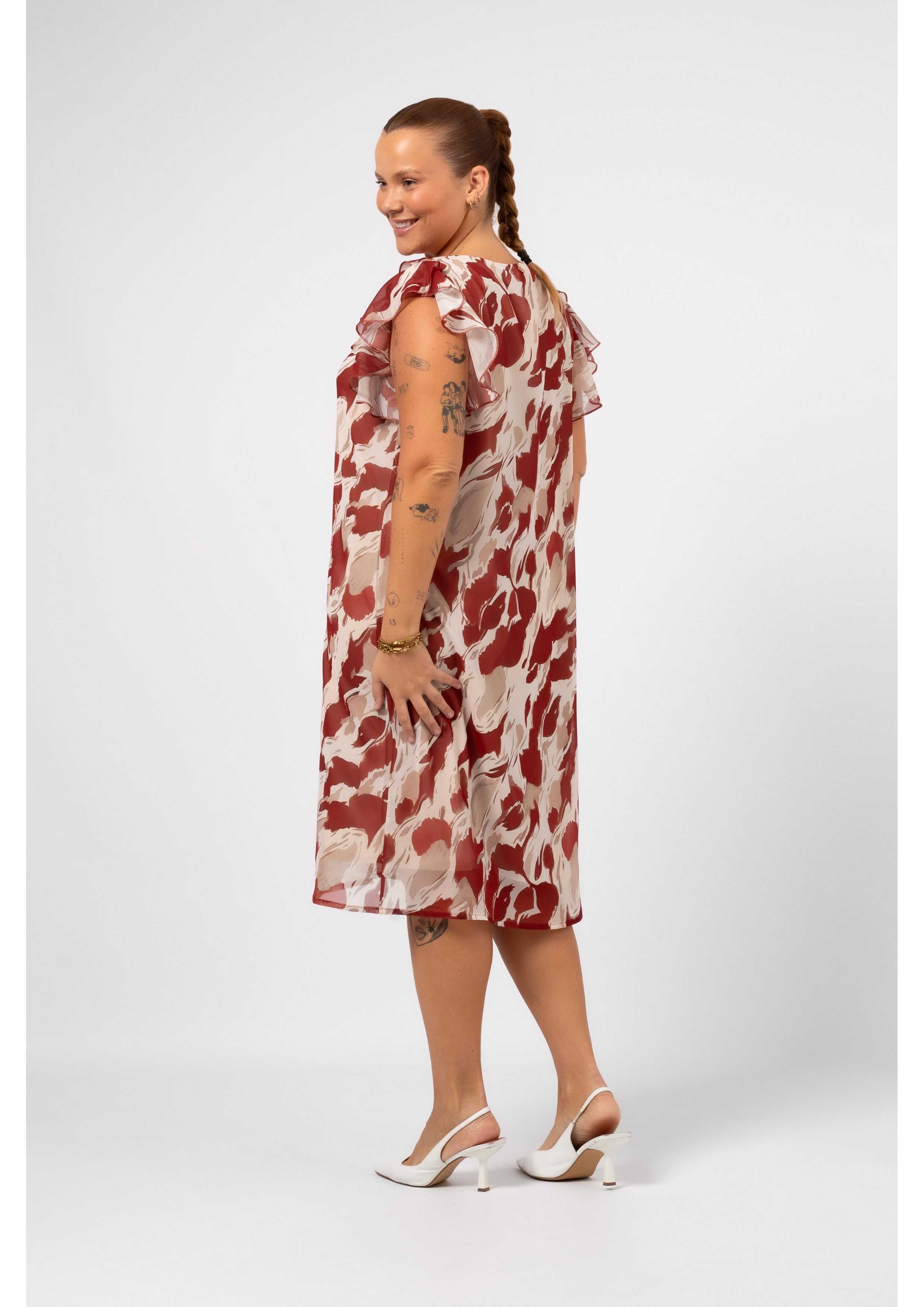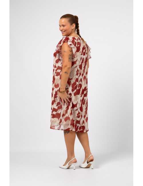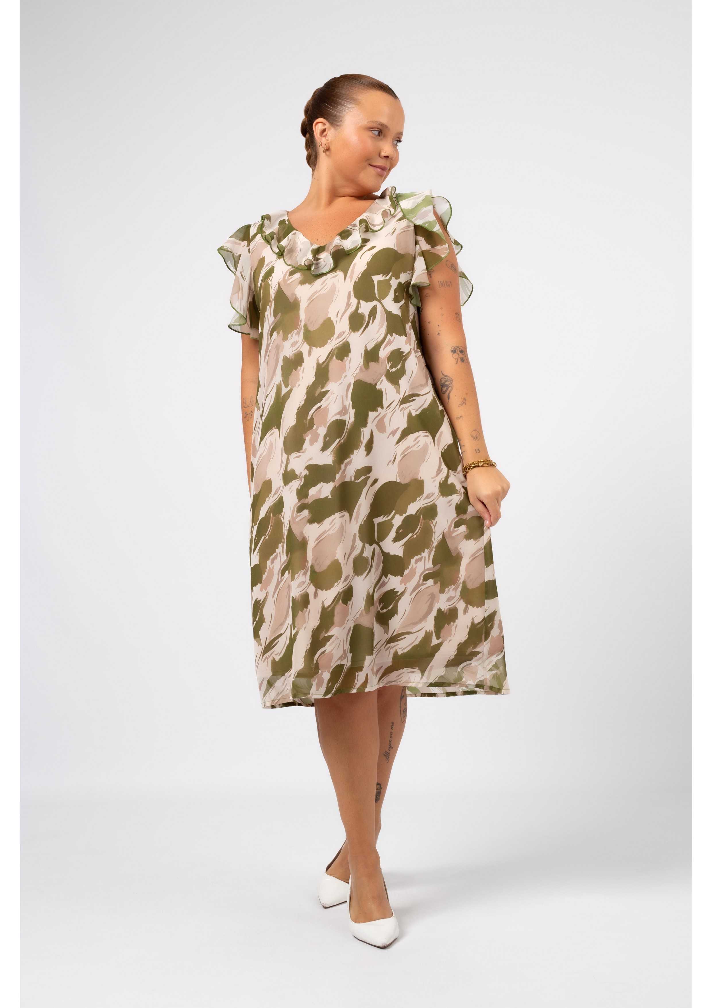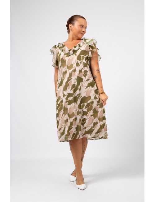 Dress in printed fabric, V-neck with ruffles, double ruffles on the sleeve. Collection: Spring Summer Available in Plus Sizes Own design and manufacturing product. We are a clothing manufacturing brand with over 50 years of experience Model: Height 5'7" and wearing size XL. Composition: 100% Polyester|LINING 94% Polyester 6% Elastane"