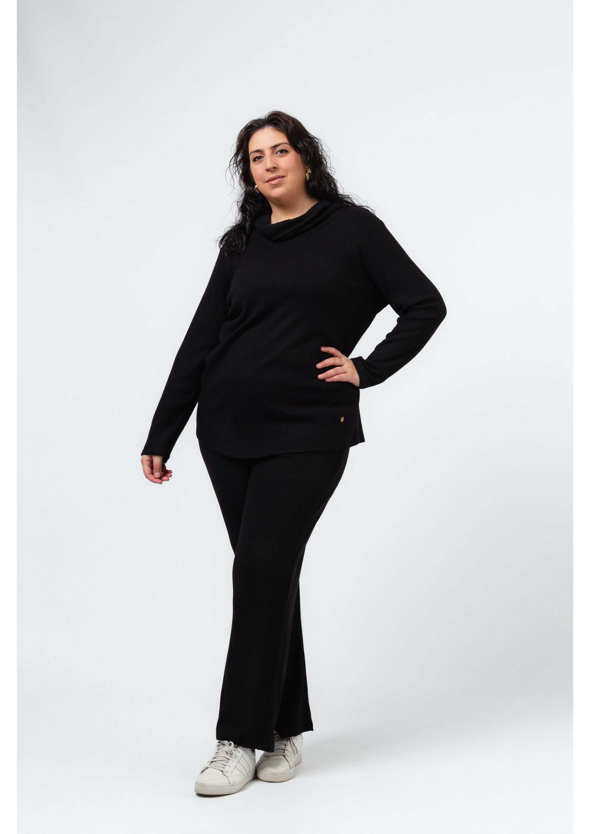 Ribbed knit set, turtleneck sweater with a relaxed fit, rounded hem, pants with covered elastic waistband.