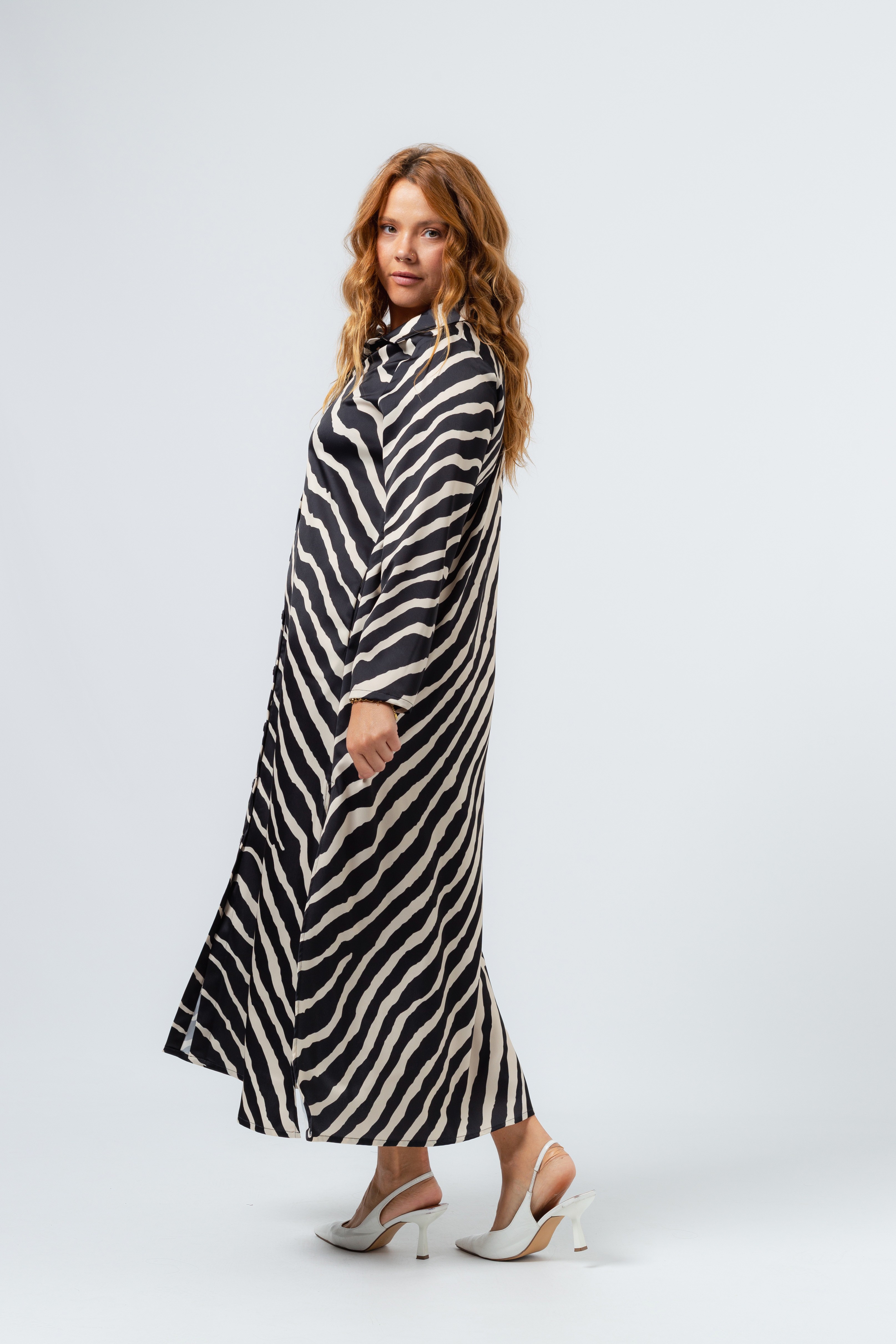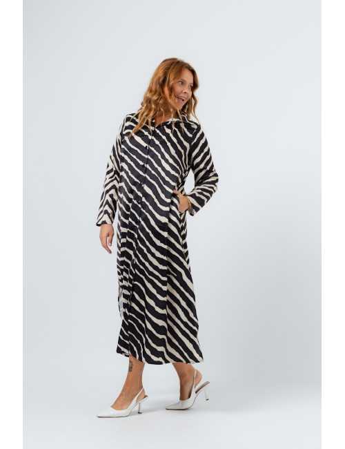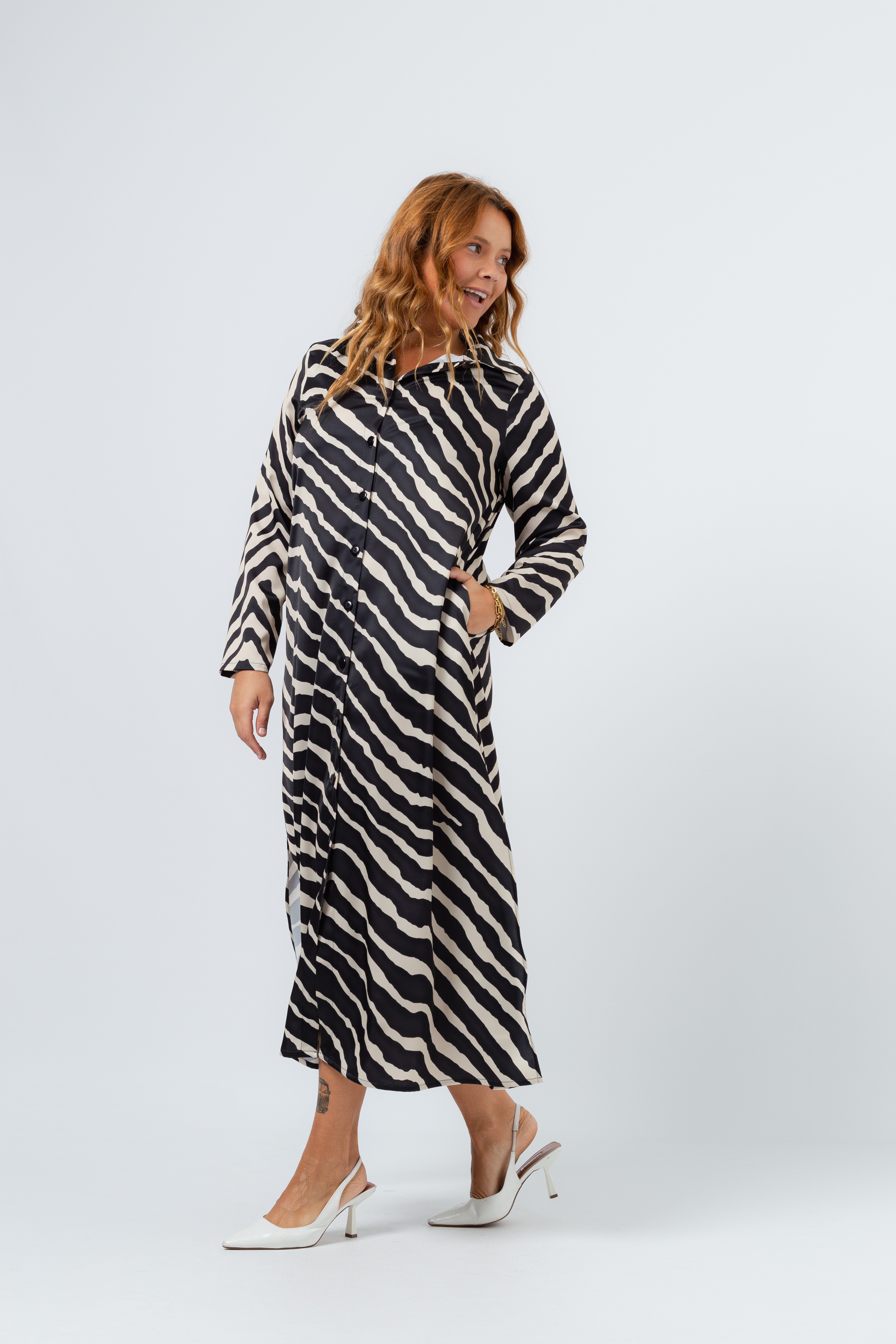 Dress in printed fabric, shirt model, collar and neckline. Long sleeves. Side slits. Collection: Autumn Winter Available in Plus Sizes Product designed and manufactured in-house. We are a clothing manufacturing brand with over 50 years of experience Model: Height 1.73m and is wearing size 3XL. Height 1.70m and is wearing size XL Composition: 96% Polyester 4% Elastane