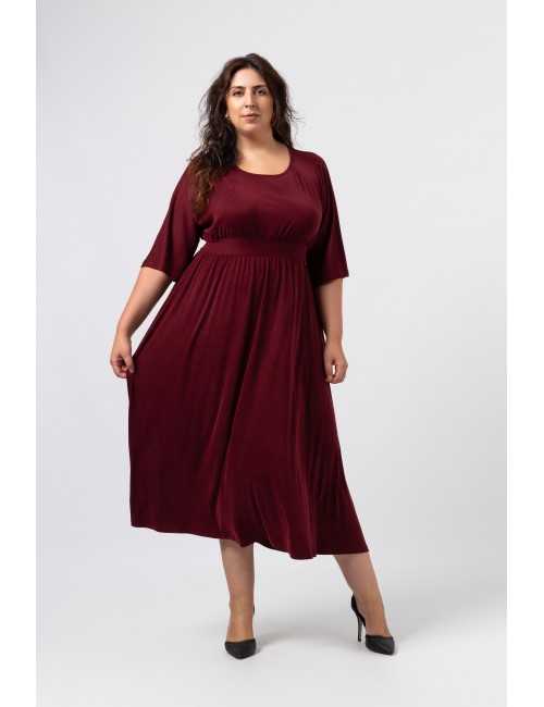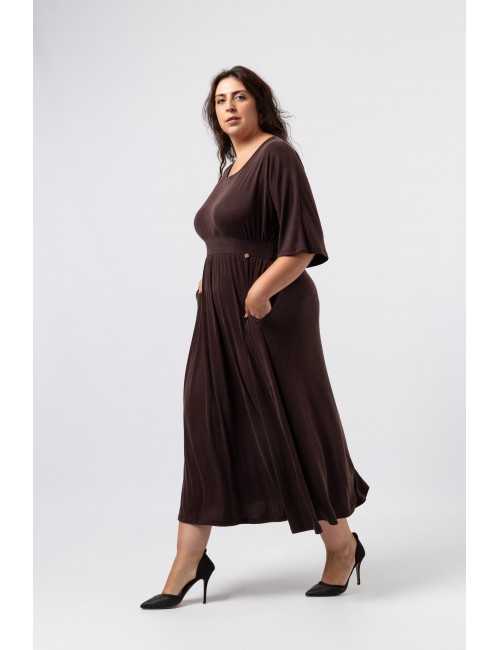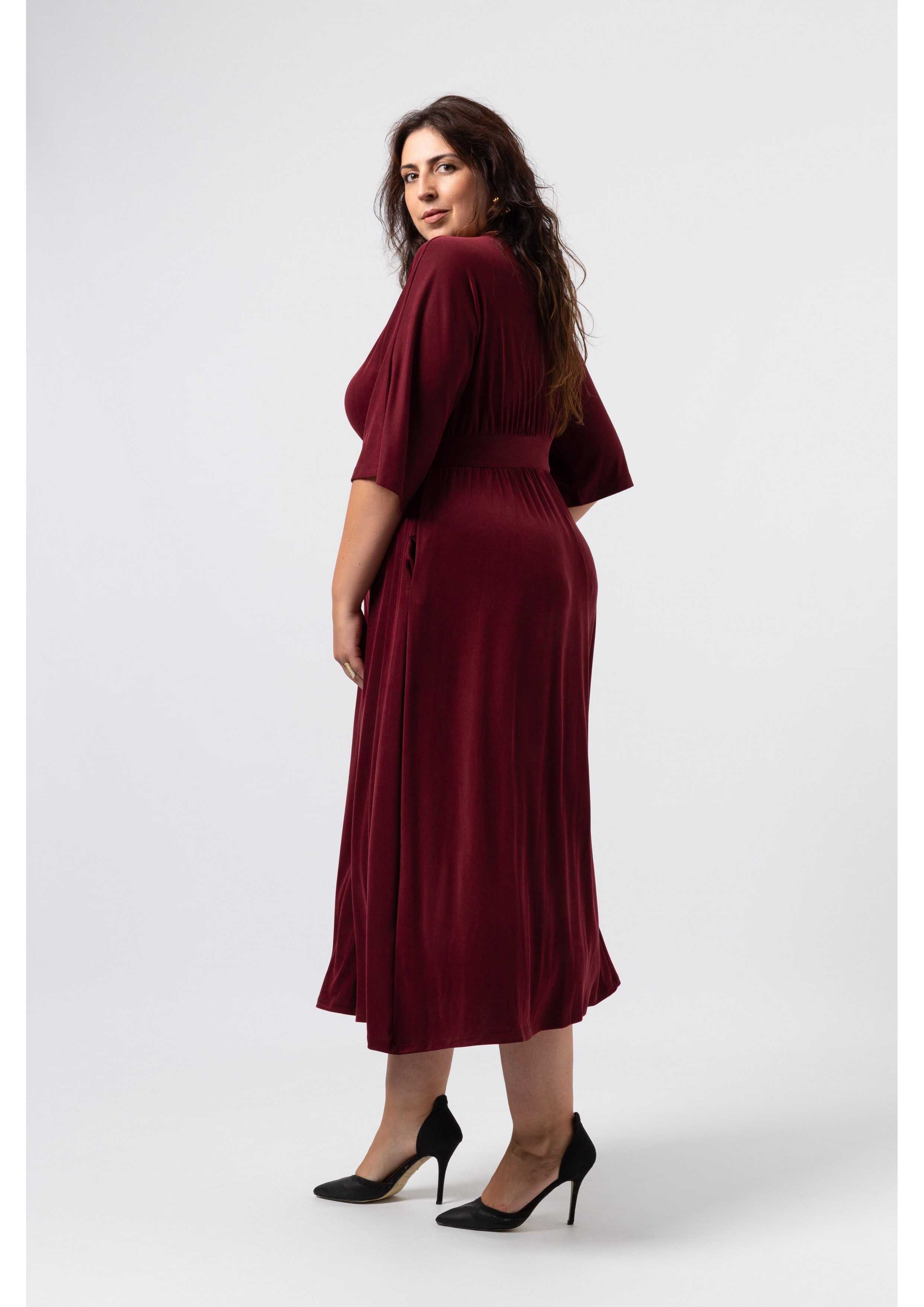 Solid knit dress, cupro type, batwing sleeves. Double knit belt. Gathered at the chest and skirt, side pockets, slightly boat neck. Collection: Fall Winter Available in Plus Sizes Own design and manufacturing brand. We are a clothing manufacturing brand with over 50 years of experience Model: Height 1.73m and is wearing size 3XL. Model: Height 1.65m and is wearing size 3XL. Composition: 87% Polyester 10% Viscose 3% Elastane