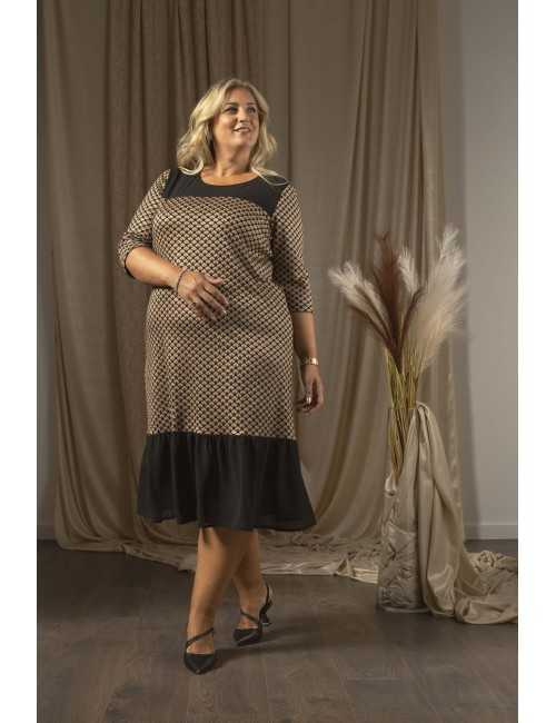 Dress with a printed knit body with shine, plain chest, and flounce at the bottom. 3/4 sleeve Collection: Autumn Winter Available in Plus Sizes Own design and manufacturing brand. We are a clothing manufacturing brand with over 50 years of experience Model: Height 1.65m and wearing size 3XL. Composition: 59% Polyester 41% Viscose|100% Polyester