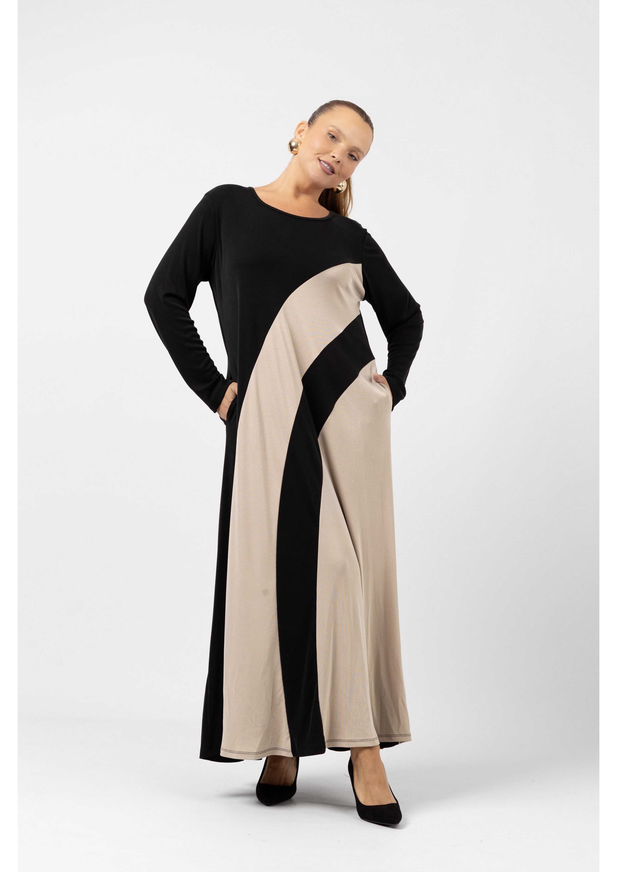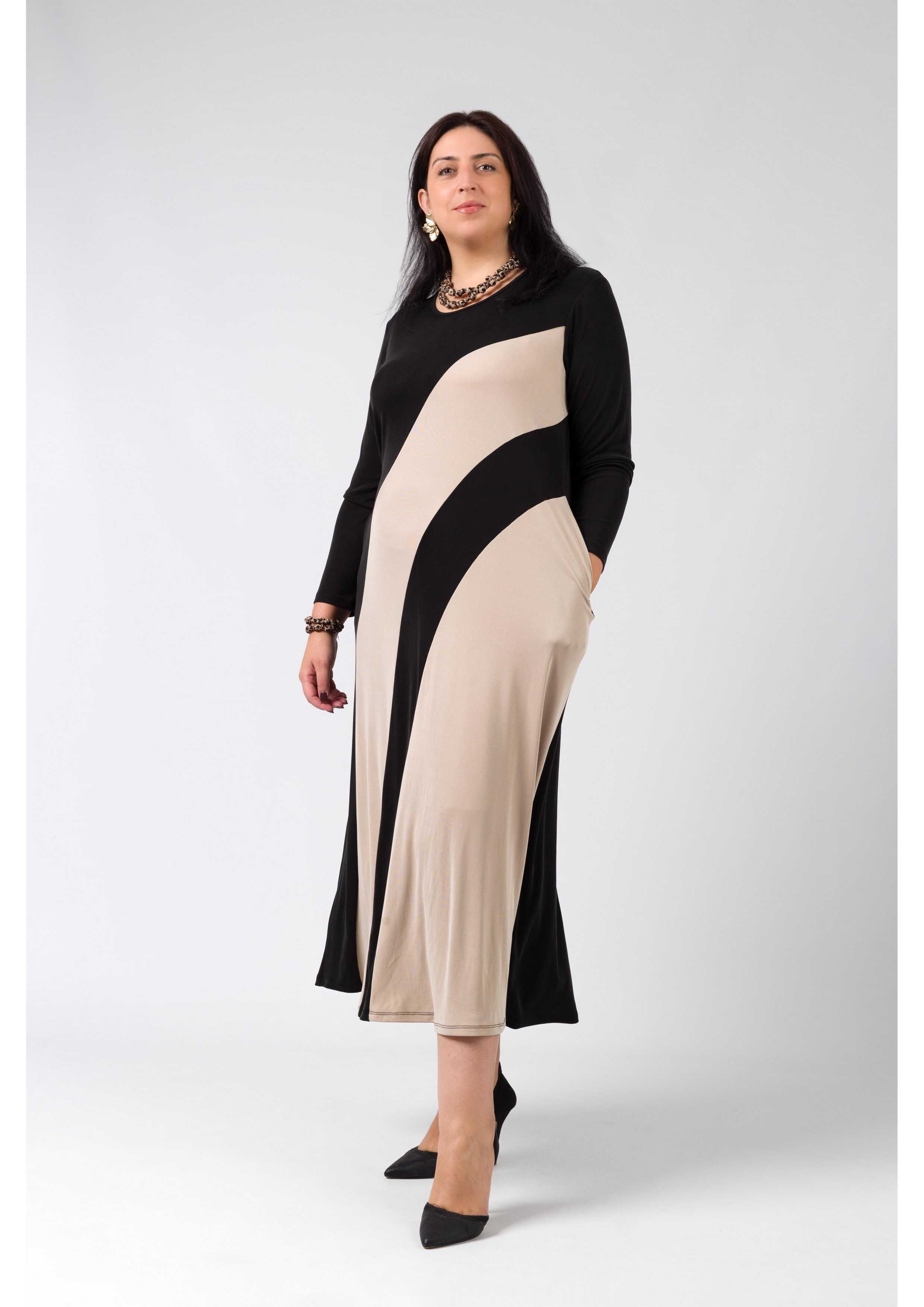 Plain knit dress, fine cane modal. Round neckline. Long sleeves. Contrasting diagonal inserts at the front and side pockets. Collection: Autumn Winter Available in Plus Sizes Own design and manufacturing product. We are a clothing brand with over 50 years of experience Model: Height 1.73m and wearing size 3XL. Composition: 87% Polyester 10% Viscose 3% Elastane
