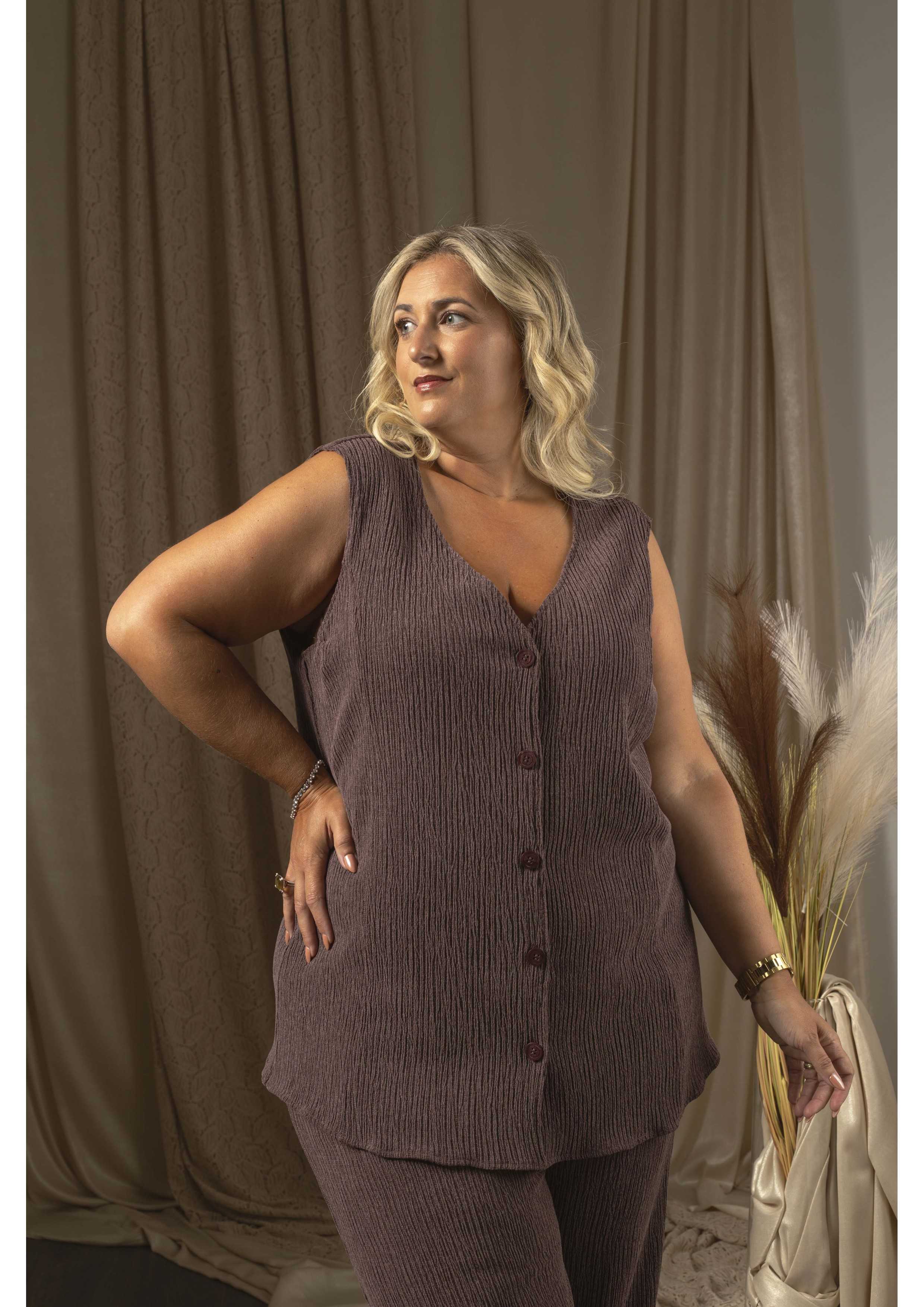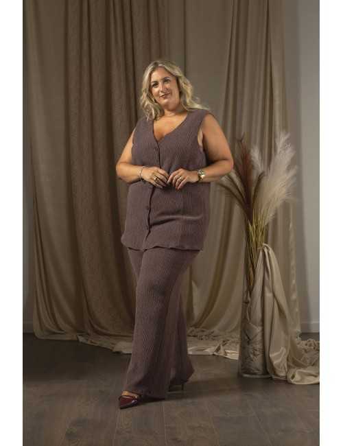 Plain knit set with a sleeveless top and pants. Pants with covered elastic. Top lined in the front and half back. Round base, fastens with buttons. Collection: Autumn Winter Available in Plus Sizes Own design and manufacturing product. We are a clothing manufacturing brand with over 50 years of experience Model: Height 1.65m and is wearing size 3XL. Model: Height 1.70m and is wearing size XL. Model: Height 1.73m and is wearing size 3XL. Composition: 78% Polyester 21% Viscose 1% Elastane