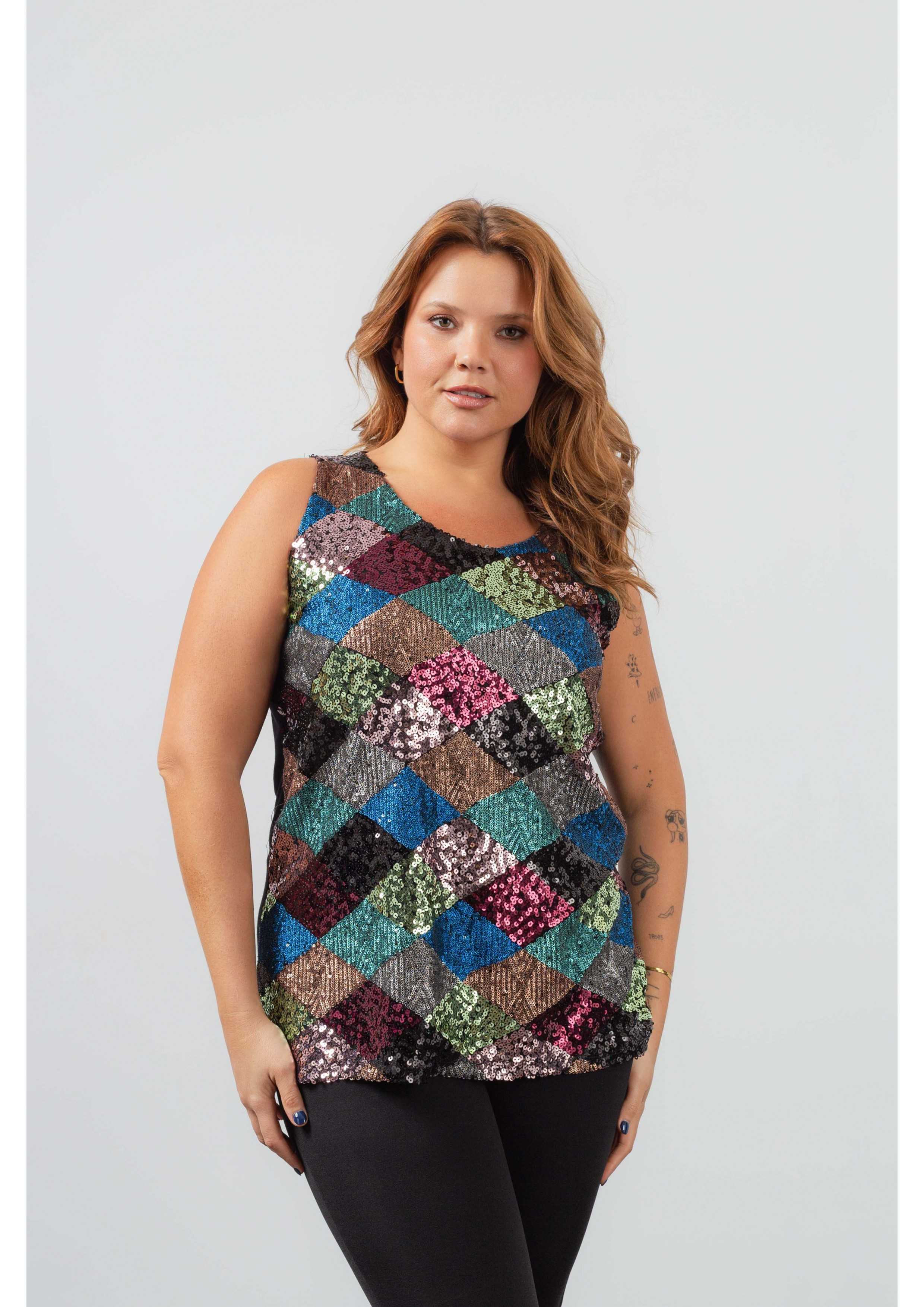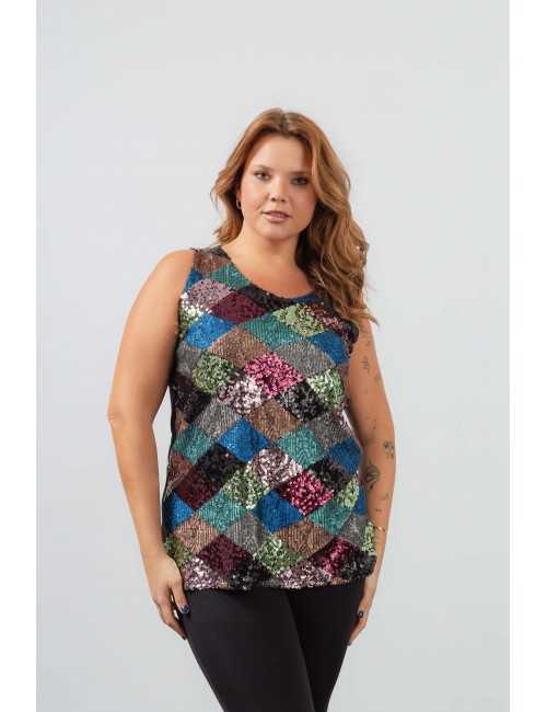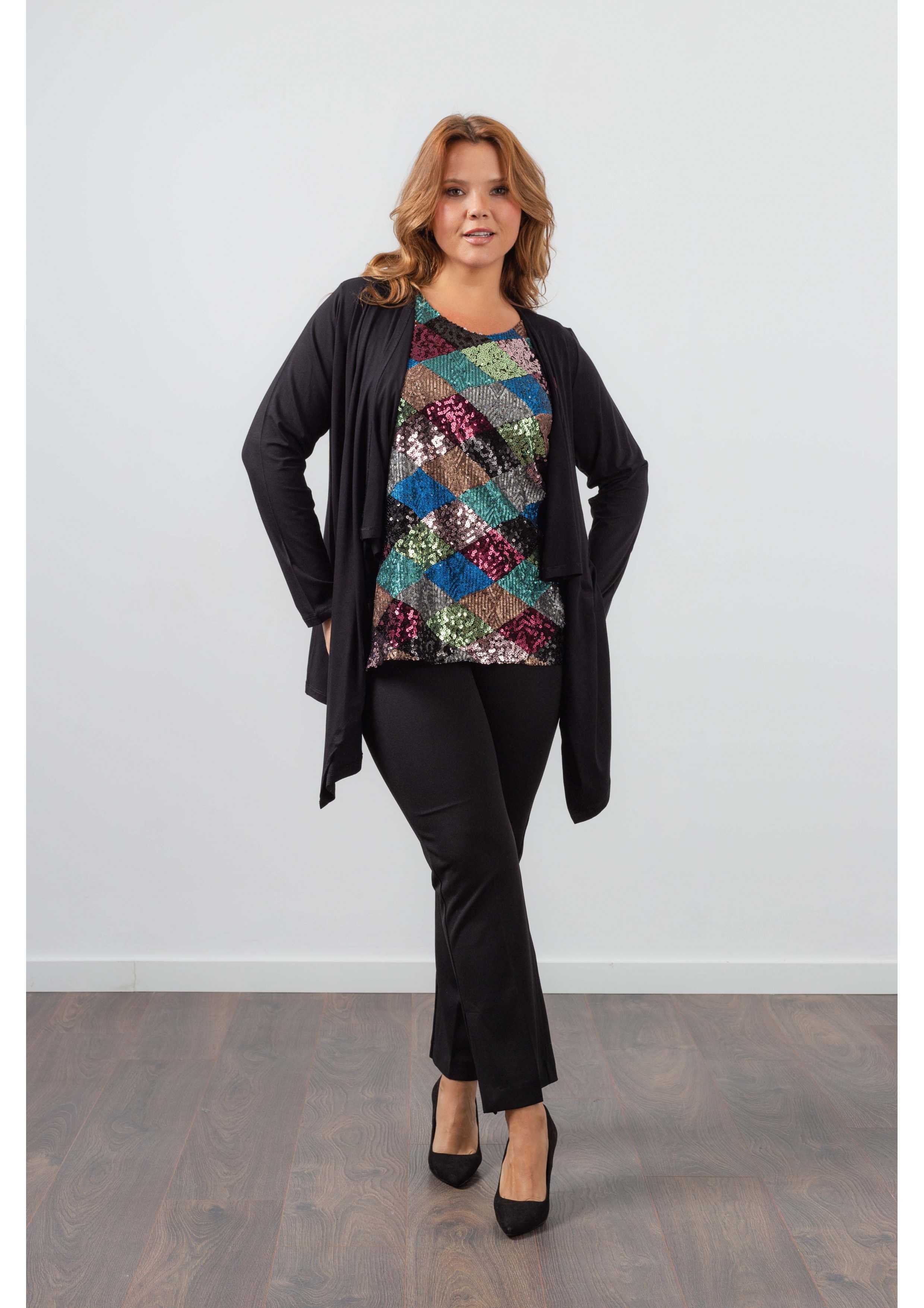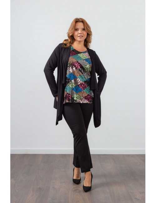 Top and knitted jacket set. Sequin front top, smooth knitted jacket with side points. Collection: Spring Summer Available in Plus Sizes Own design and manufacturing product. We are a clothing manufacturing brand with over 50 years of experience Model: Height 1.70m and wearing size 2XL. Composition: SMOOTH 94% Viscose 6% Elastane | SEQUIN 97% Polyester 3% Elastane | LINING 100% Polyester
