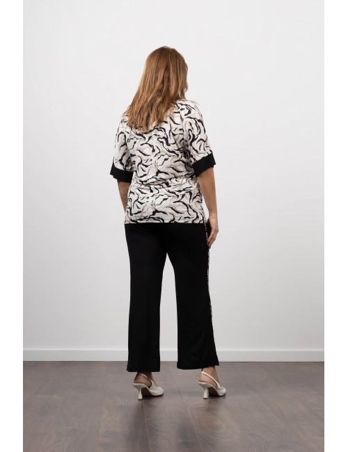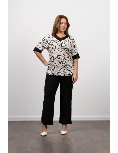 Knit set, printed blouse, batwing sleeves, V-neck plain, solid pants with high side printed belt. Collection: Spring Summer Model: Height 1.70m and wearing size 2XL