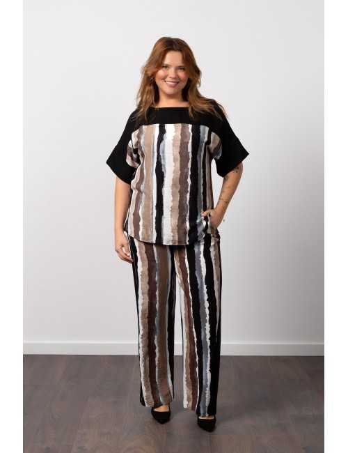 Printed fabric set with plain inserts. Top with side slits, spaghetti straps, and plain sleeves. Closed teardrop at the back. Pants with side pockets, plain side hem, elastic at the waist. Collection: Spring/Summer Available in Plus Sizes Own design and manufacturing product. We are a clothing brand with over 50 years of experience. Model: Height 1.70m and wearing size XL.