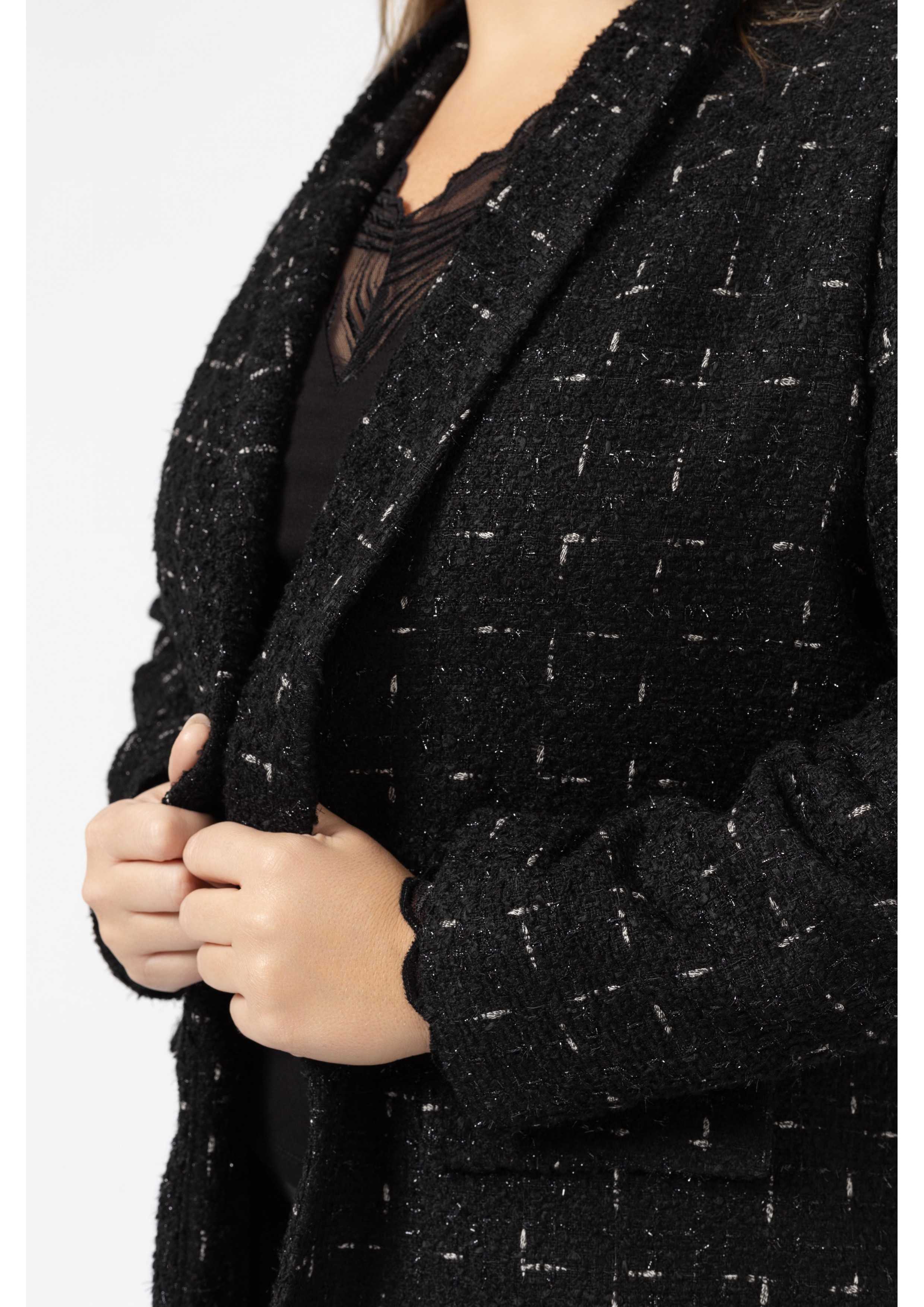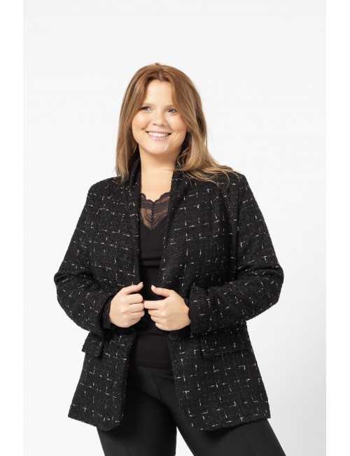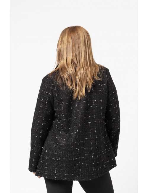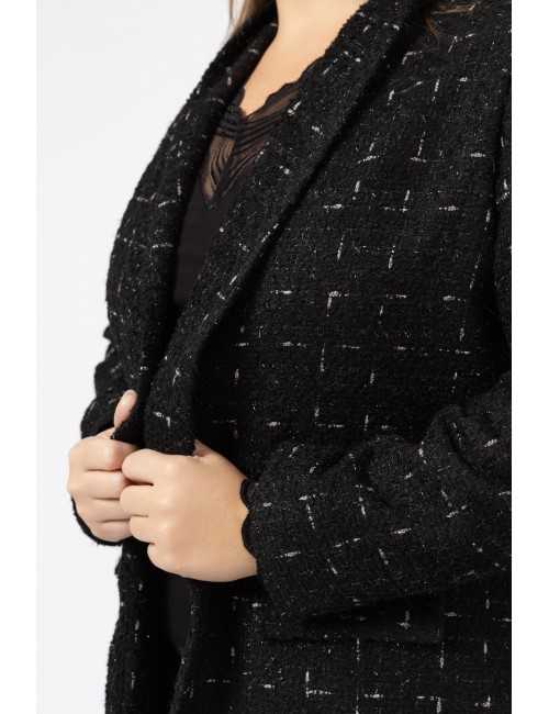 Channel fabric blazer, shiny thread, collar, patch pockets, lined coat. Collection: Autumn Winter Available in Plus Sizes Own design and manufacturing product. We are a clothing manufacturing brand with over 50 years of experience Model: Height 1.70m and is wearing size 2XL. Composition: PLAIN 51% Acrylic 29% Polyester 13% Cotton 5% Viscose 1% Polyamide 1% Metal|LINING 100% Polyester