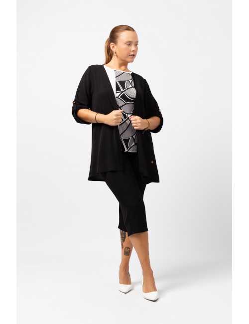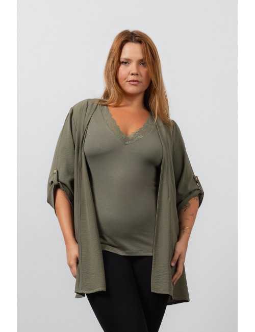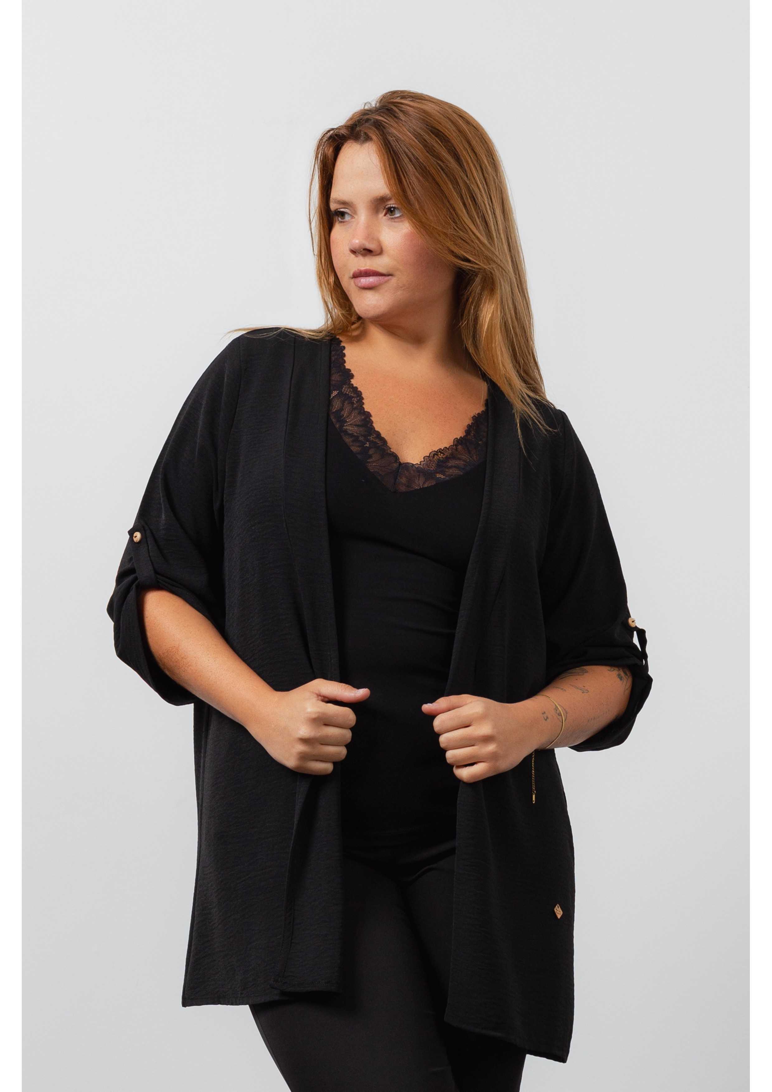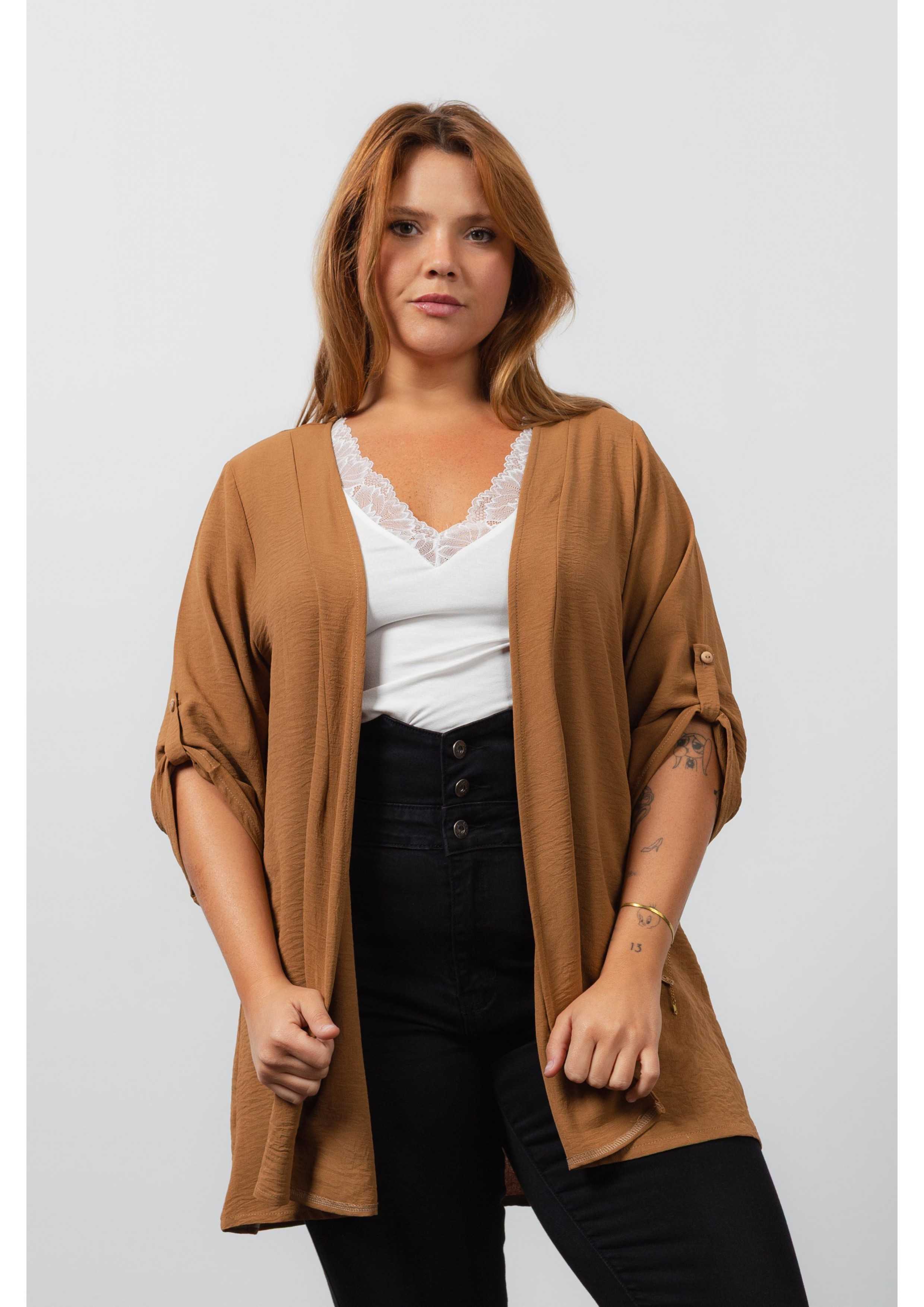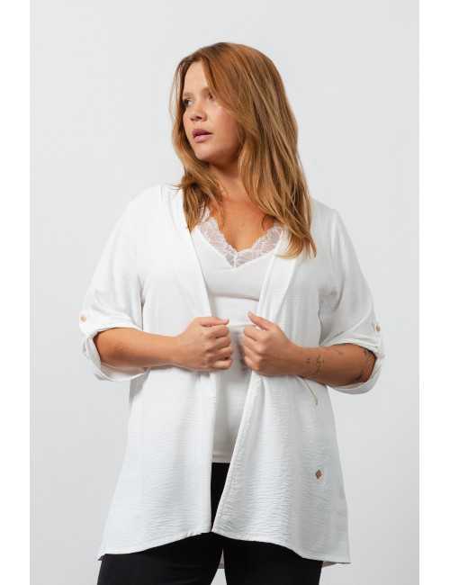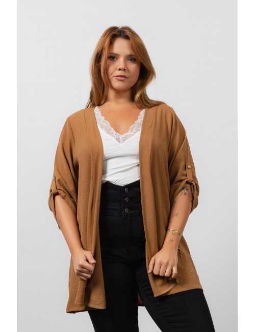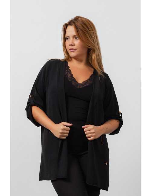 Plain fabric jacket, 3/4 sleeve with strap and wooden button. Front with a collar finish. Collection: Spring Summer Available in Plus Sizes Own design and manufacturing product. We are a clothing manufacturing brand with over 50 years of experience. Model: Height 1.70m and is wearing size XL. Composition: 100% Polyester