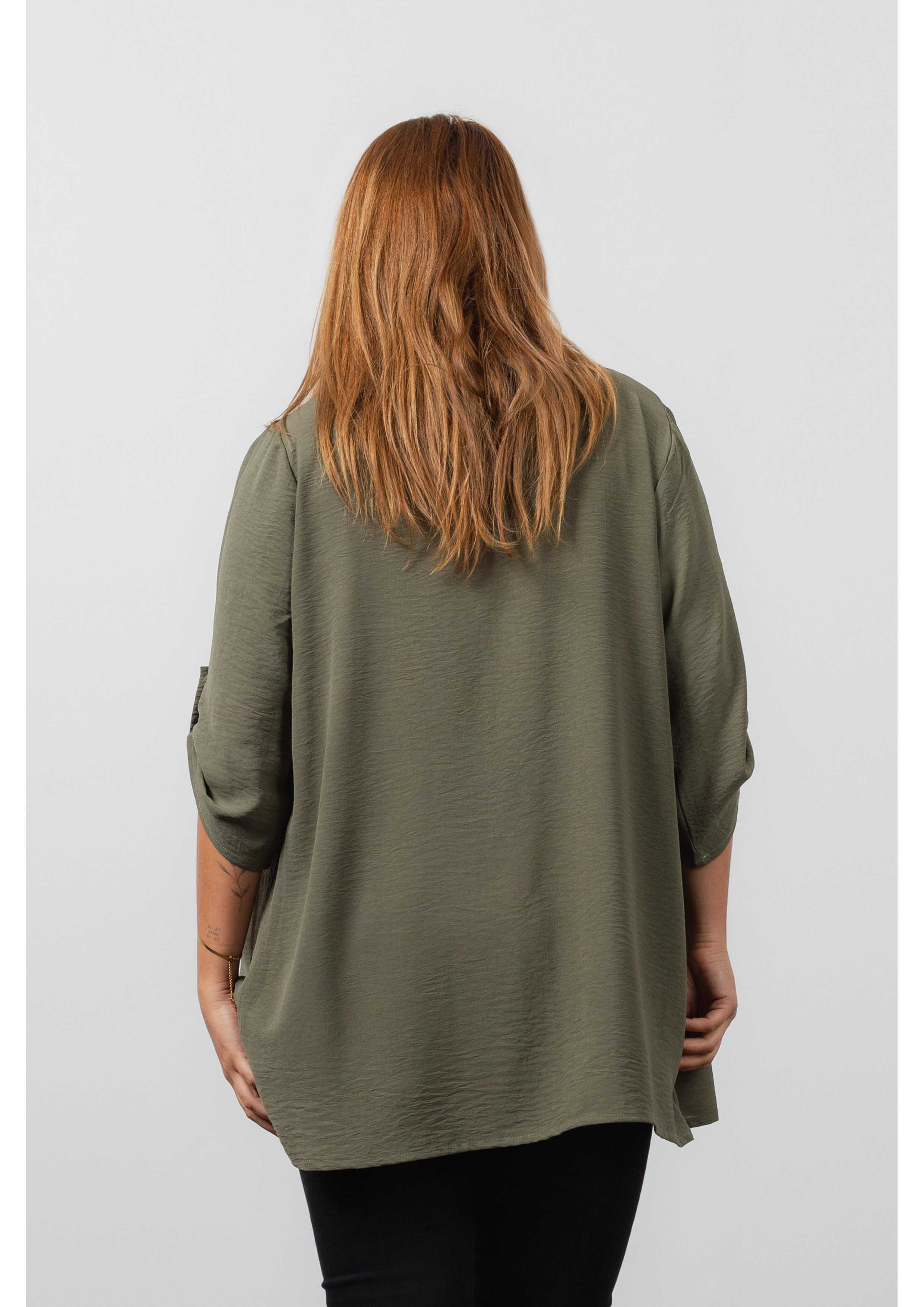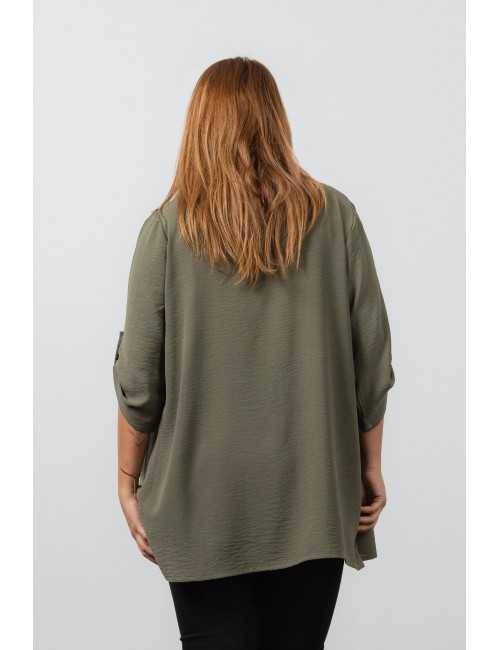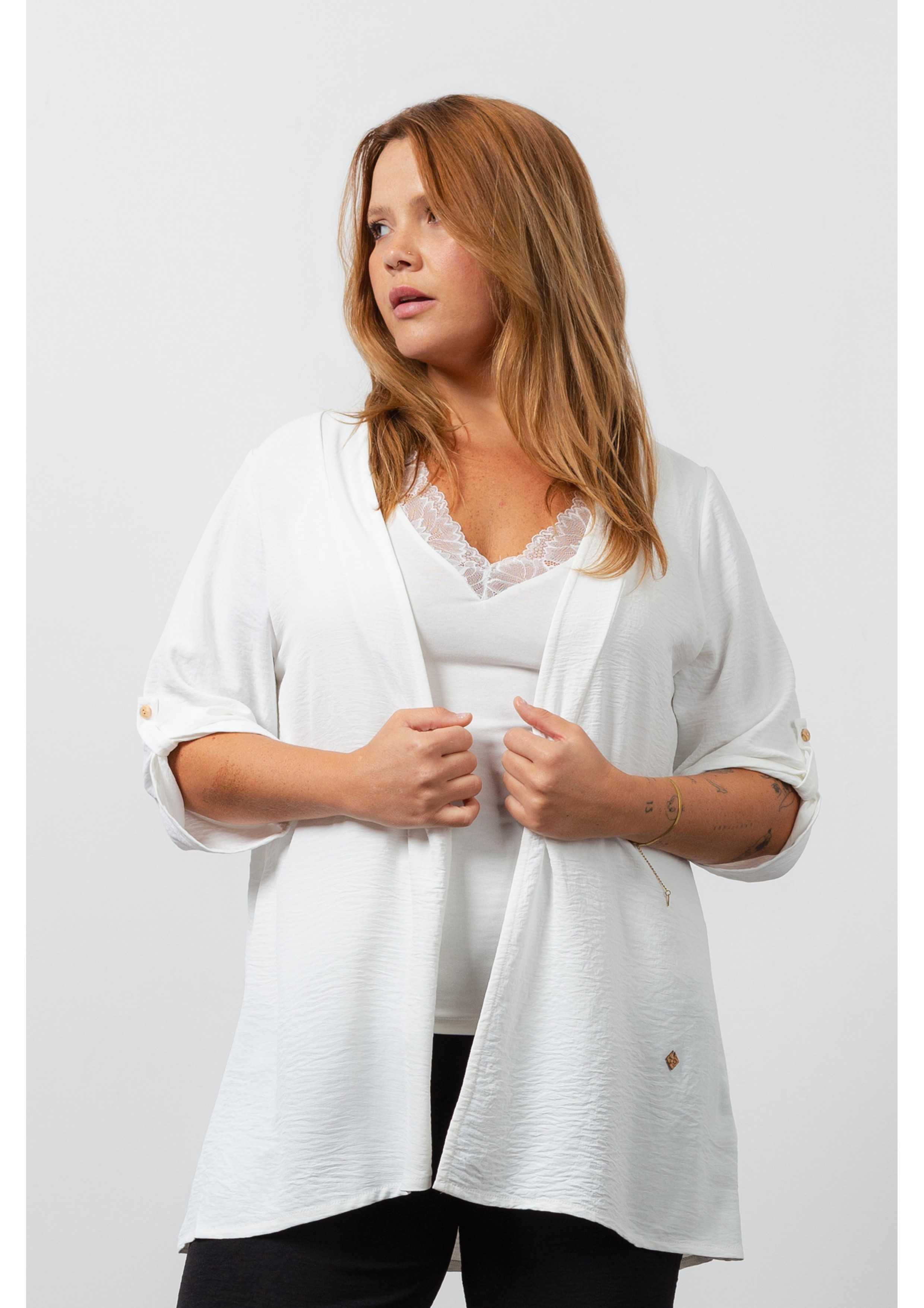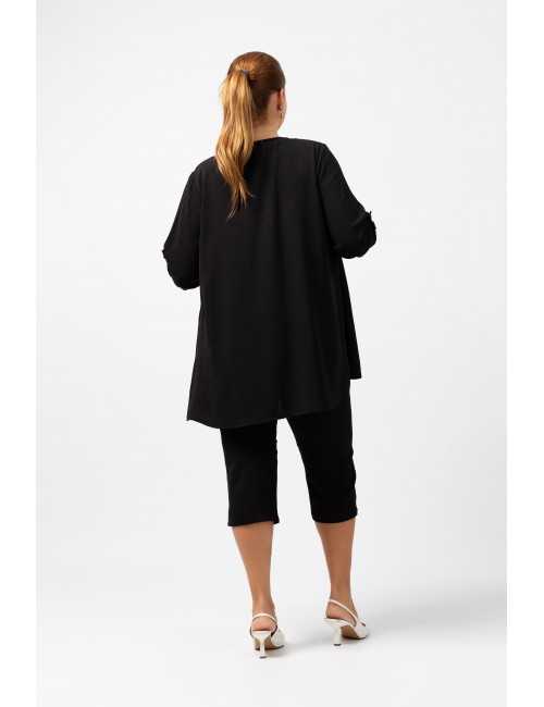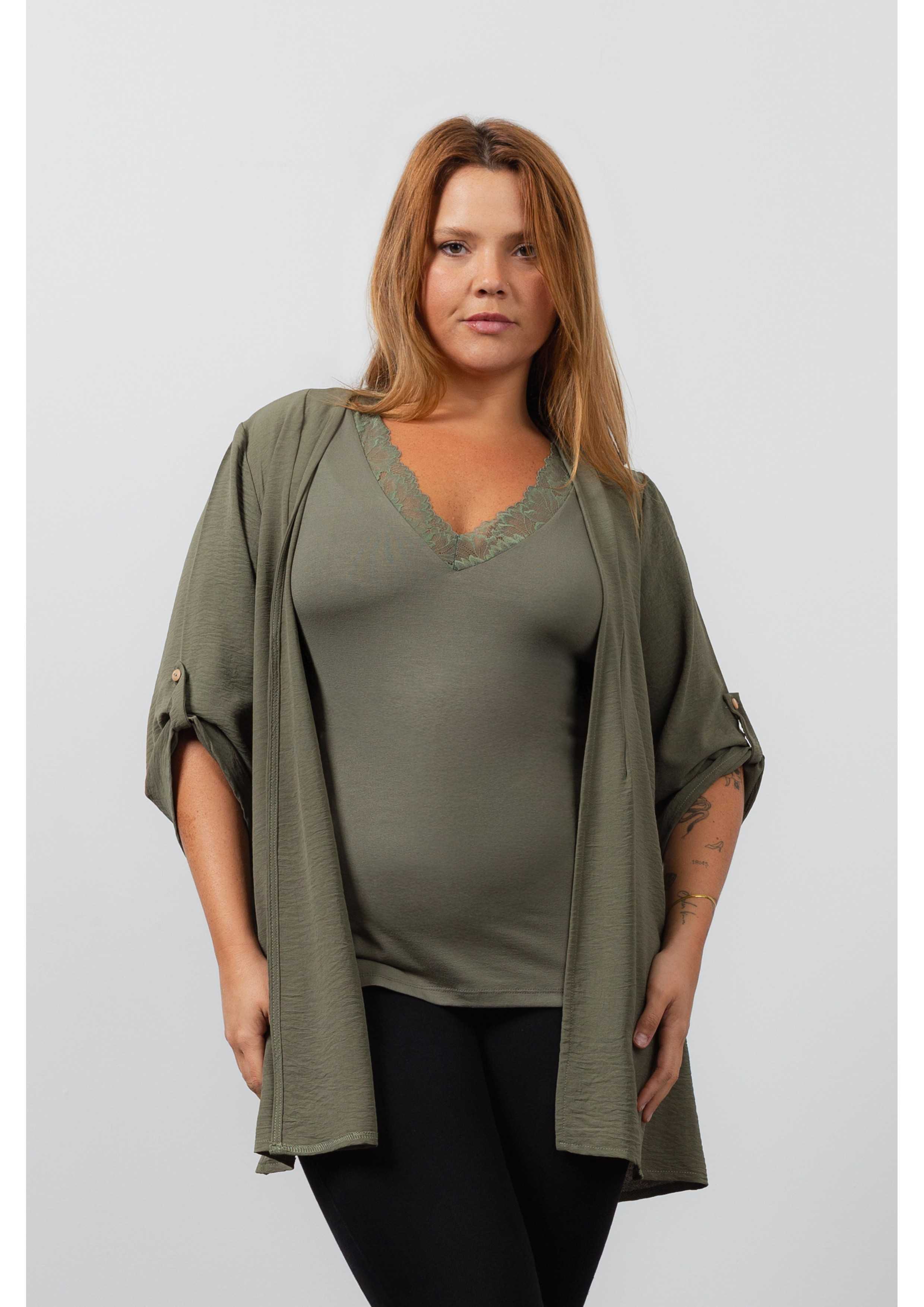 Plain fabric jacket, 3/4 sleeve with strap and wooden button. Front with a collar finish. Collection: Spring Summer Available in Plus Sizes Own design and manufacturing product. We are a clothing manufacturing brand with over 50 years of experience. Model: Height 1.70m and is wearing size XL. Composition: 100% Polyester