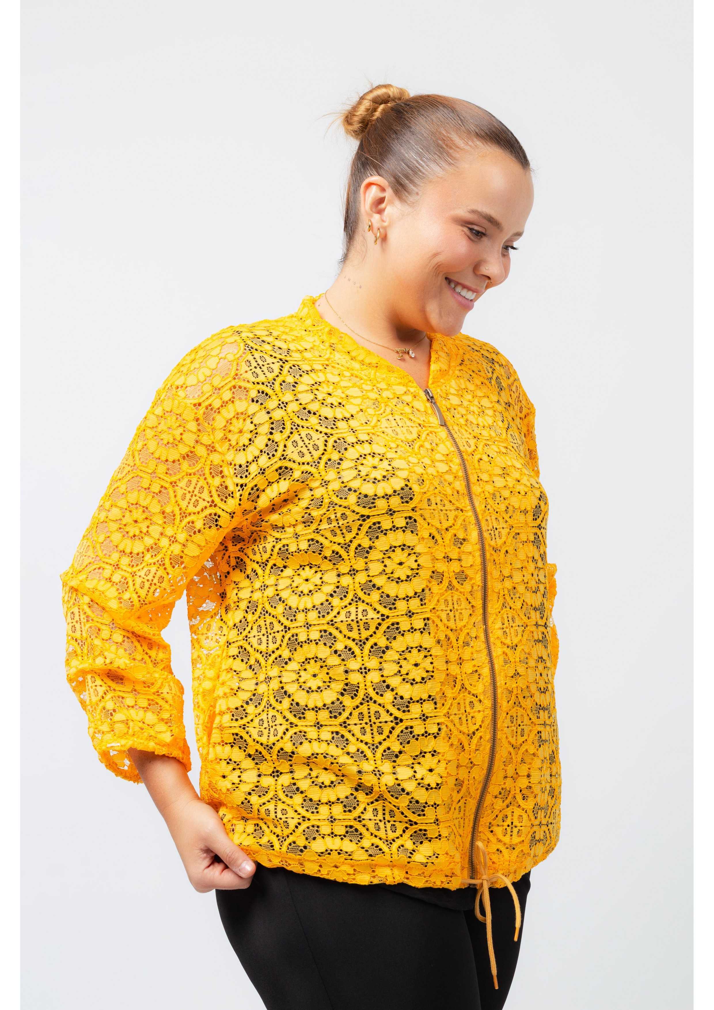 Yellow lace jacket, bomber style, 3/4 sleeves with elastic. Front closure, drawstring at the base.