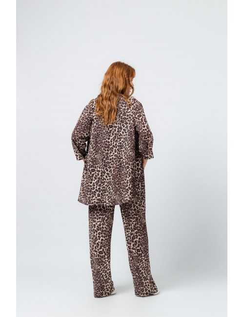 Brown printed fabric jacket, 3/4 sleeve with a small vertical tuck. Loose, draped and open model. Collection: Spring Summer Model: Height 1.70m and wearing size 2XL