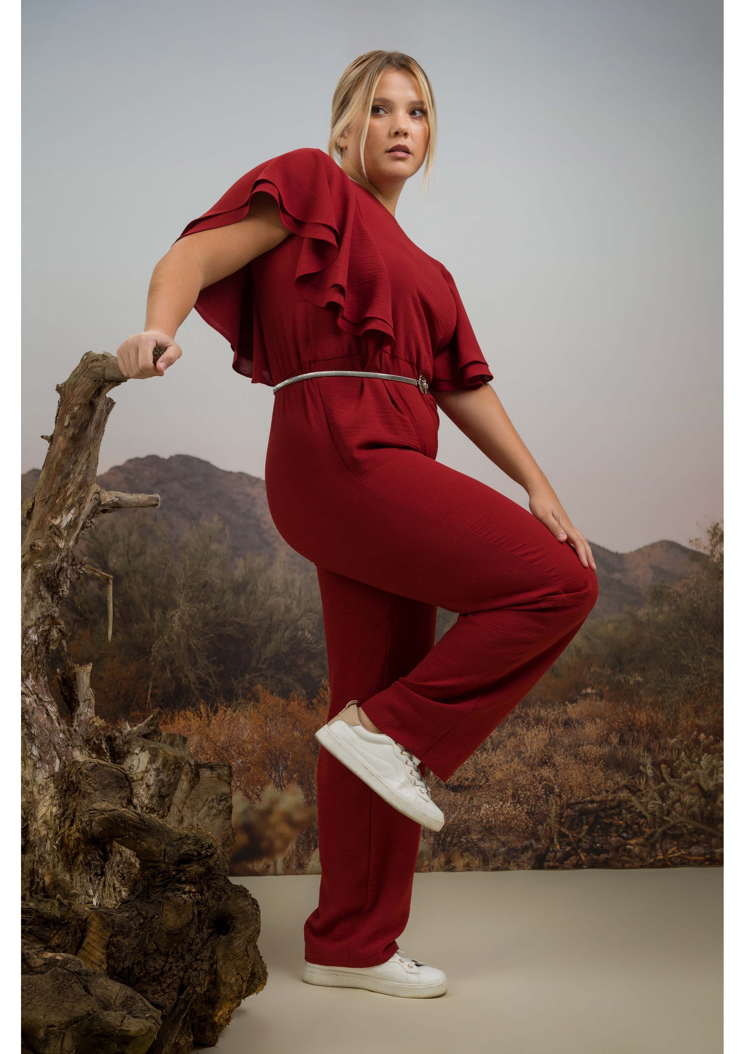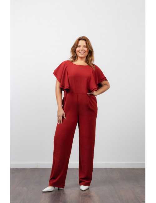 Jumpsuit with sleeveless design and ruffles on the shoulders. Collection: Spring Summer Available in Plus Sizes Own design and manufacturing product. We are a clothing manufacturing brand with over 50 years of experience. Model: Height 1.70m and is wearing size 2XL. Composition: 100% Polyester / Lining: 94% Polyester 6% Elastane