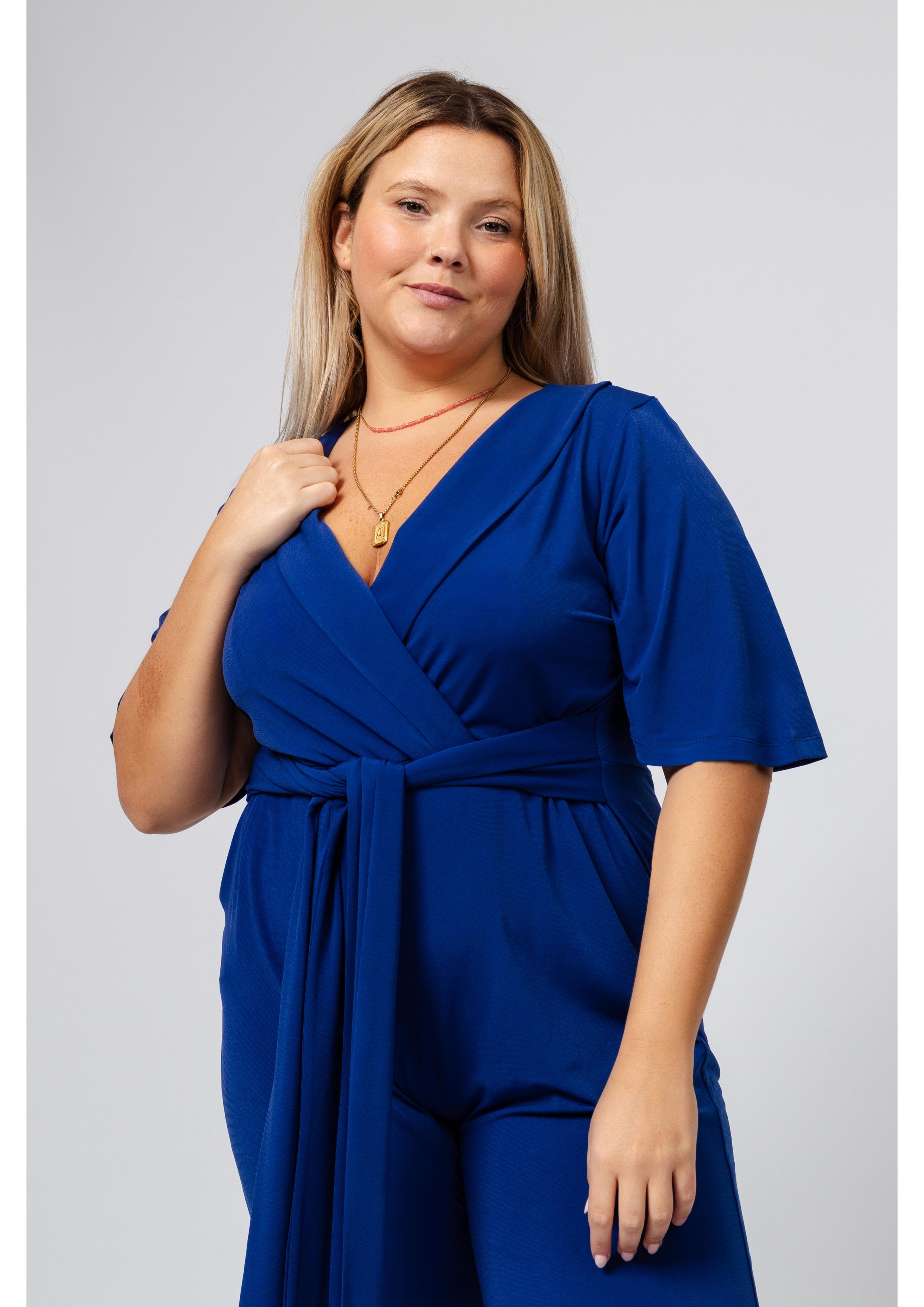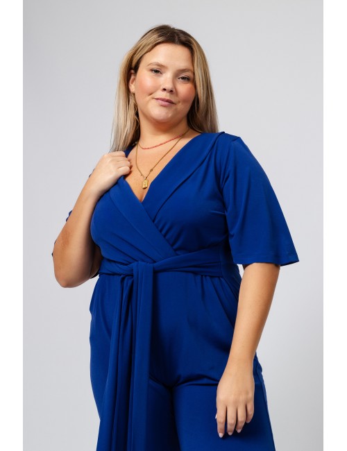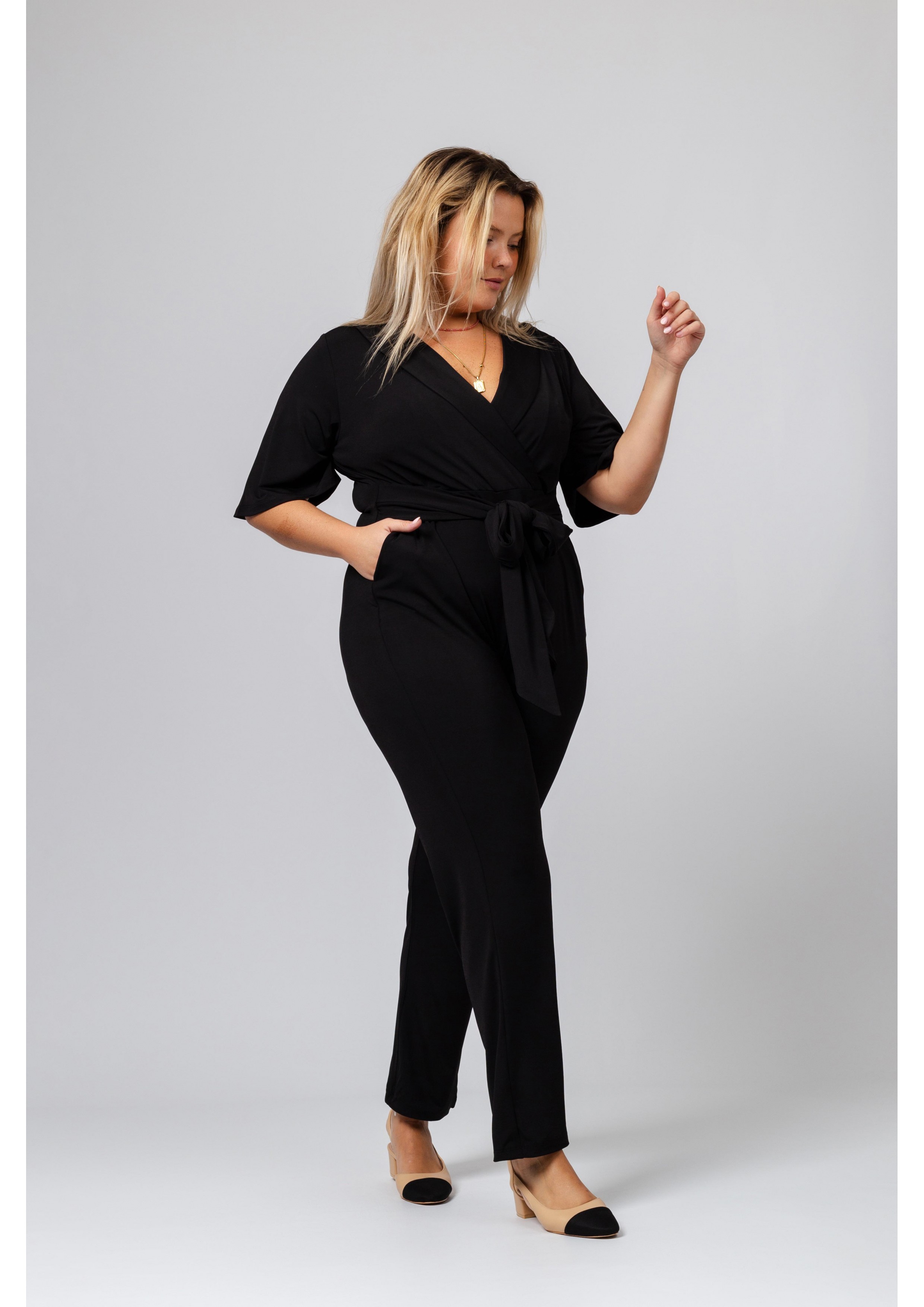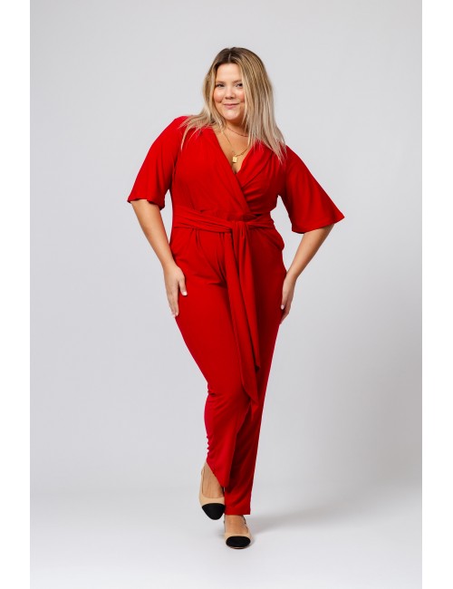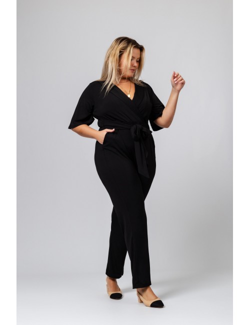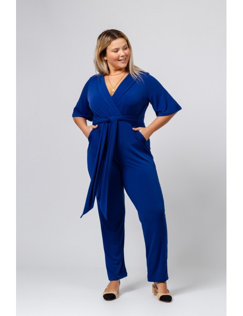 Solid knit jumpsuit with pockets and belt. Collection: Spring Summer Available in Plus Sizes Own design and manufacturing product. We are a clothing manufacturing brand with over 50 years of experience Model: Height 1.70m and is wearing size 2XL. Composition: 94% Polyester 6% Elastane