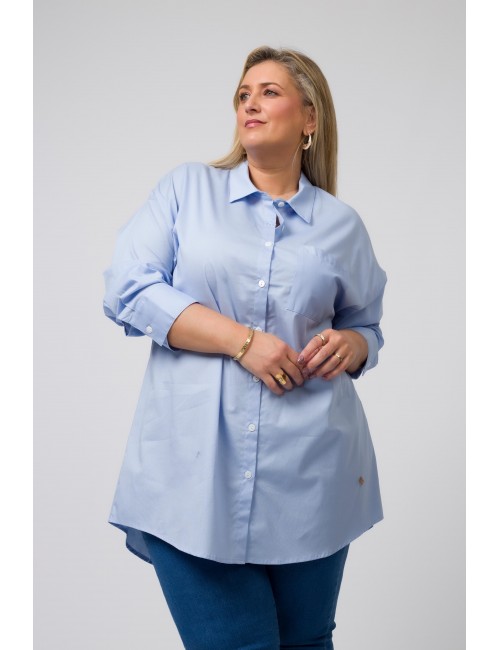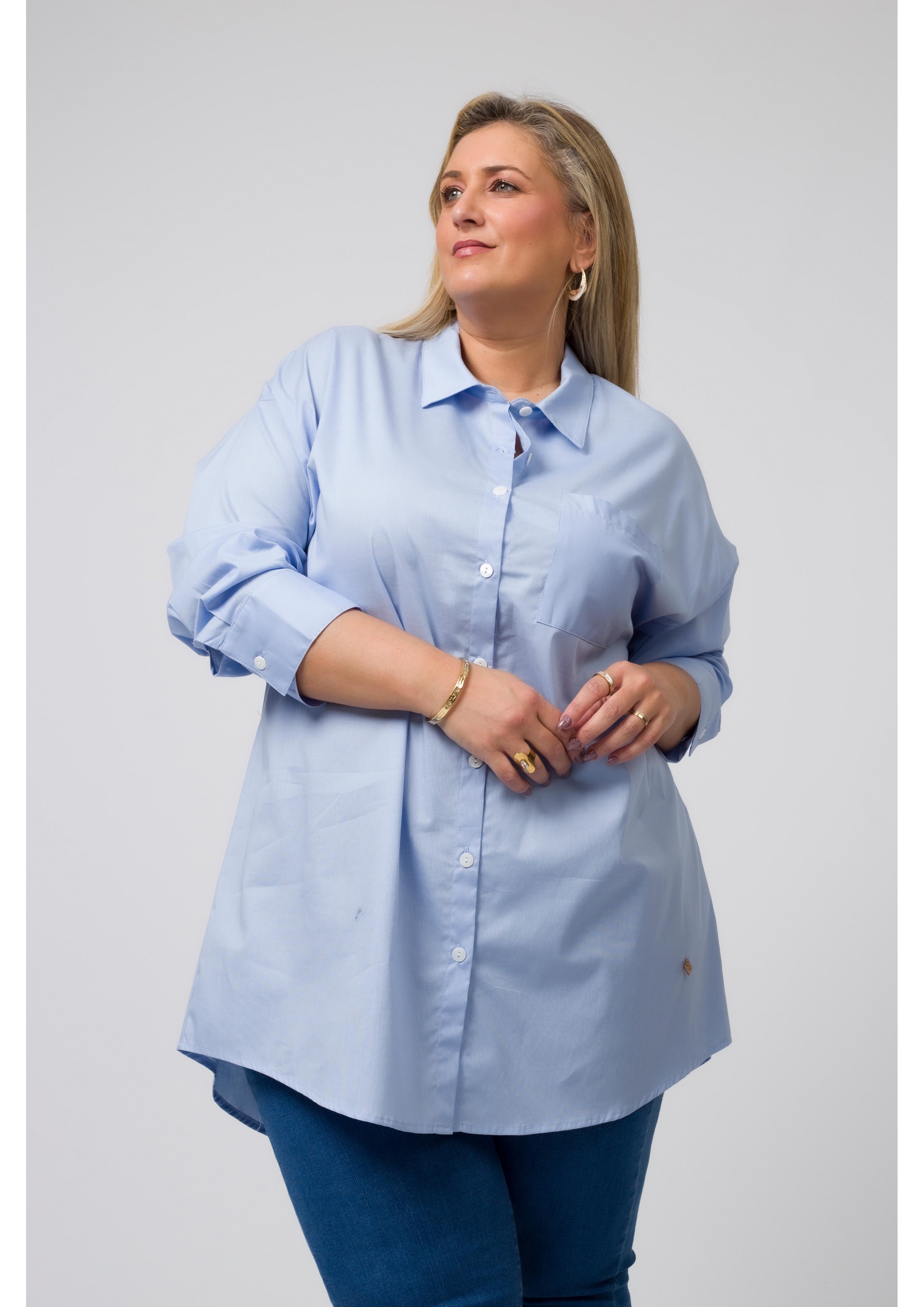 Plain fabric blouse with a button in the front and cuffs. Collection: Autumn Winter Available in Plus Sizes Own design and production. We are a clothing manufacturing brand with over 50 years of experience Model: Height 1.65m and wearing size 3XL, in blue. Model: Height 1.63m and wearing size 2XL, in pearl. Composition: 51% Cotton 49% Polyester